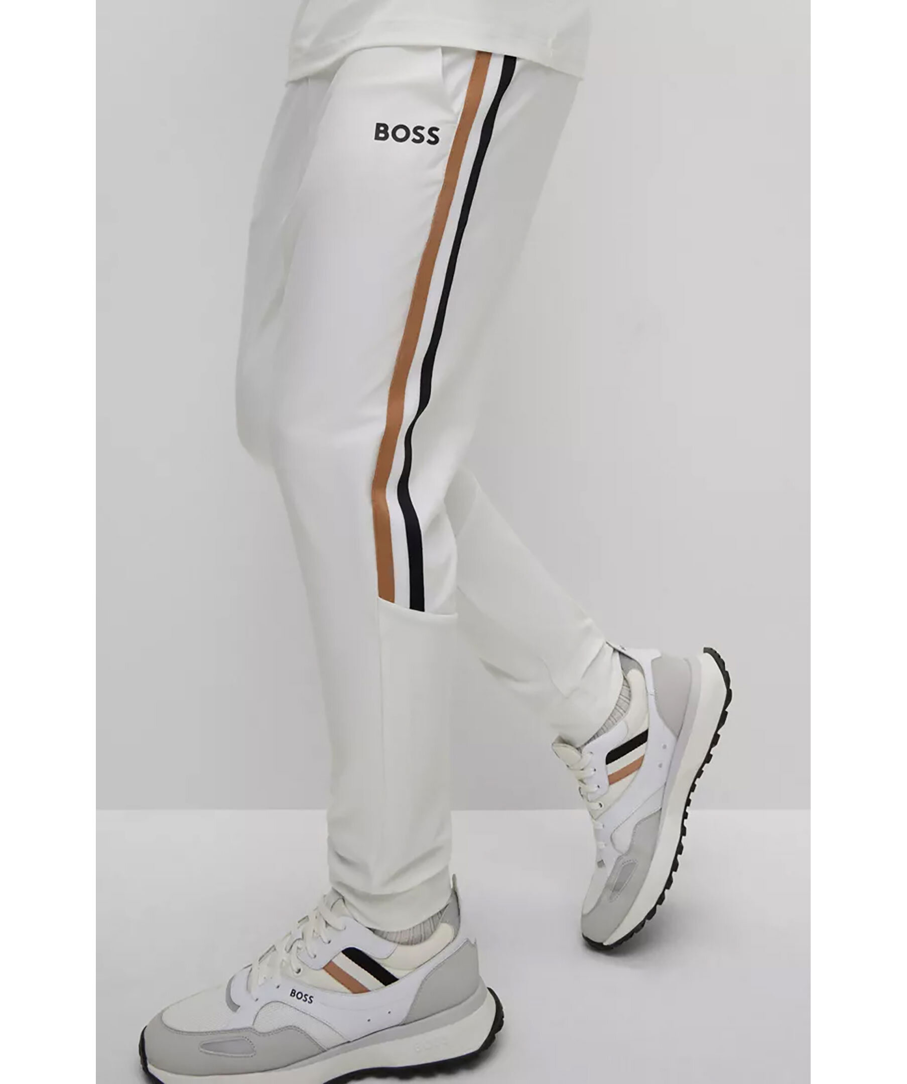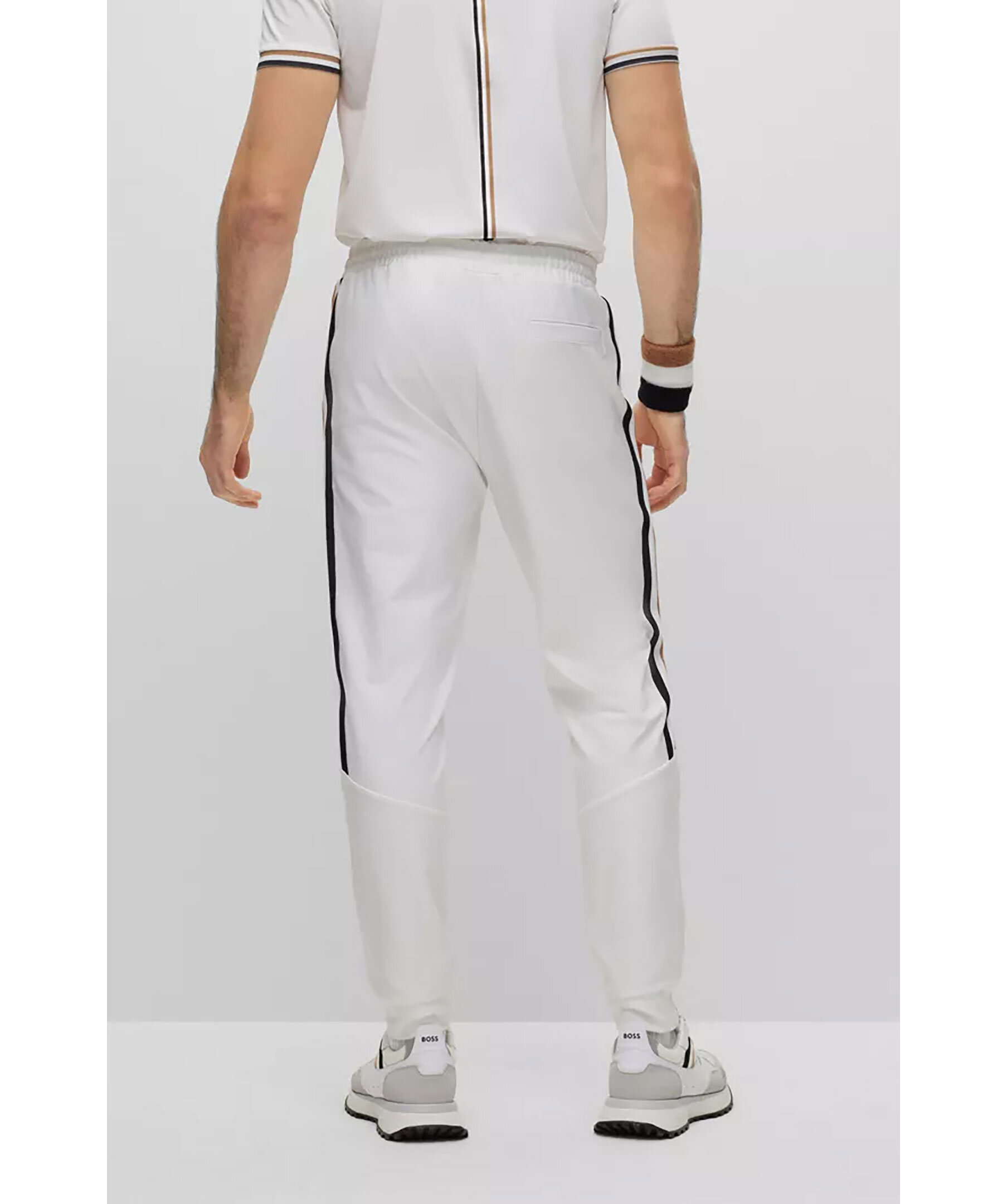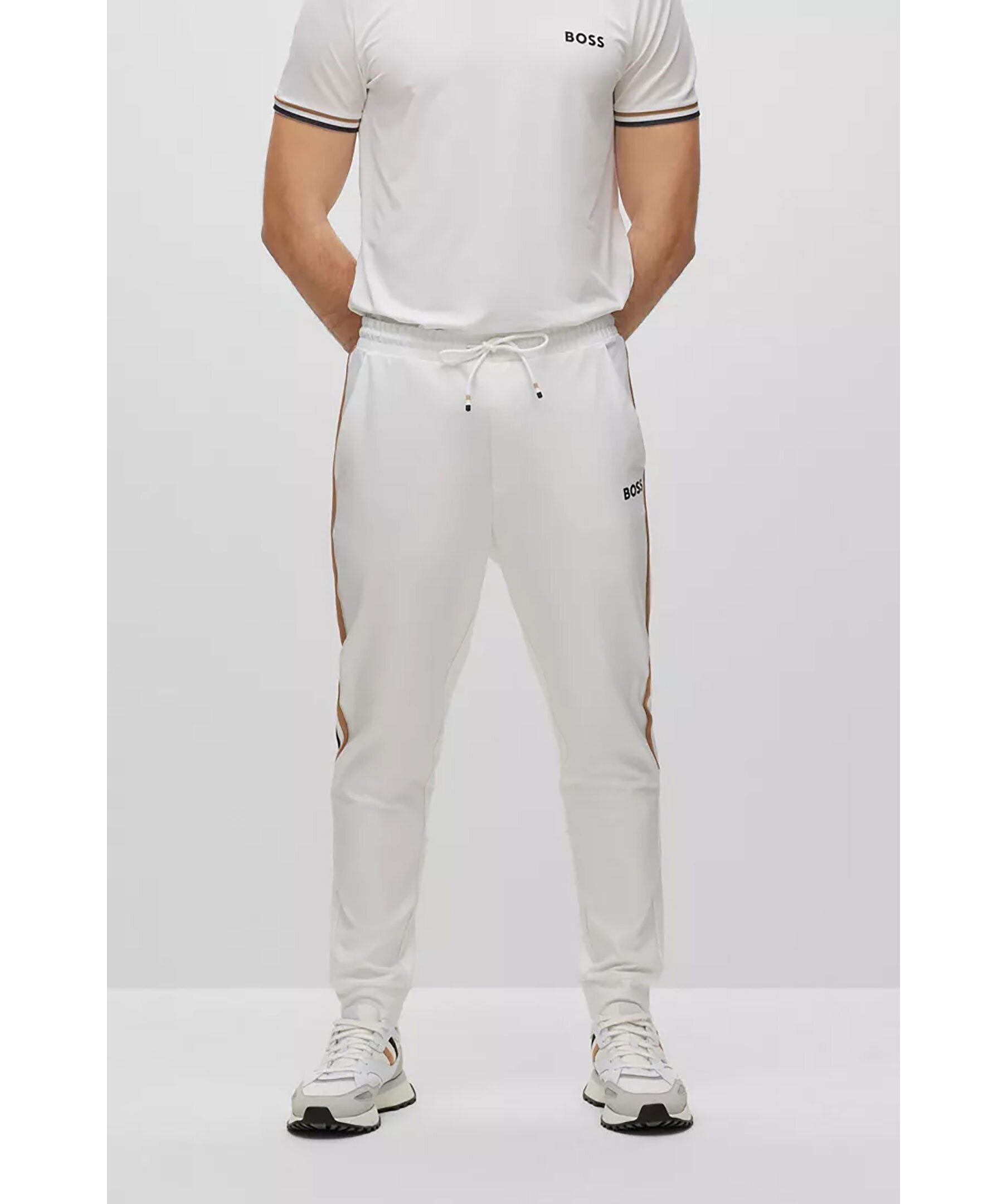 Vita tracksuitbyxor från BOSS Green. Vit, liten BOSS-logotyp under den vänstra fickan och detaljerade med signaturränder vid varje sidosöm. Dragsko i midjan med snörning, fickor i sidorna. Prestandastretchtyget ger enkel komfort på aktiva dagar. En del av den dynamiska kapselkollektionen BOSS x Matteo Berrettini, skapad av den italienska professionella tennisspelaren.