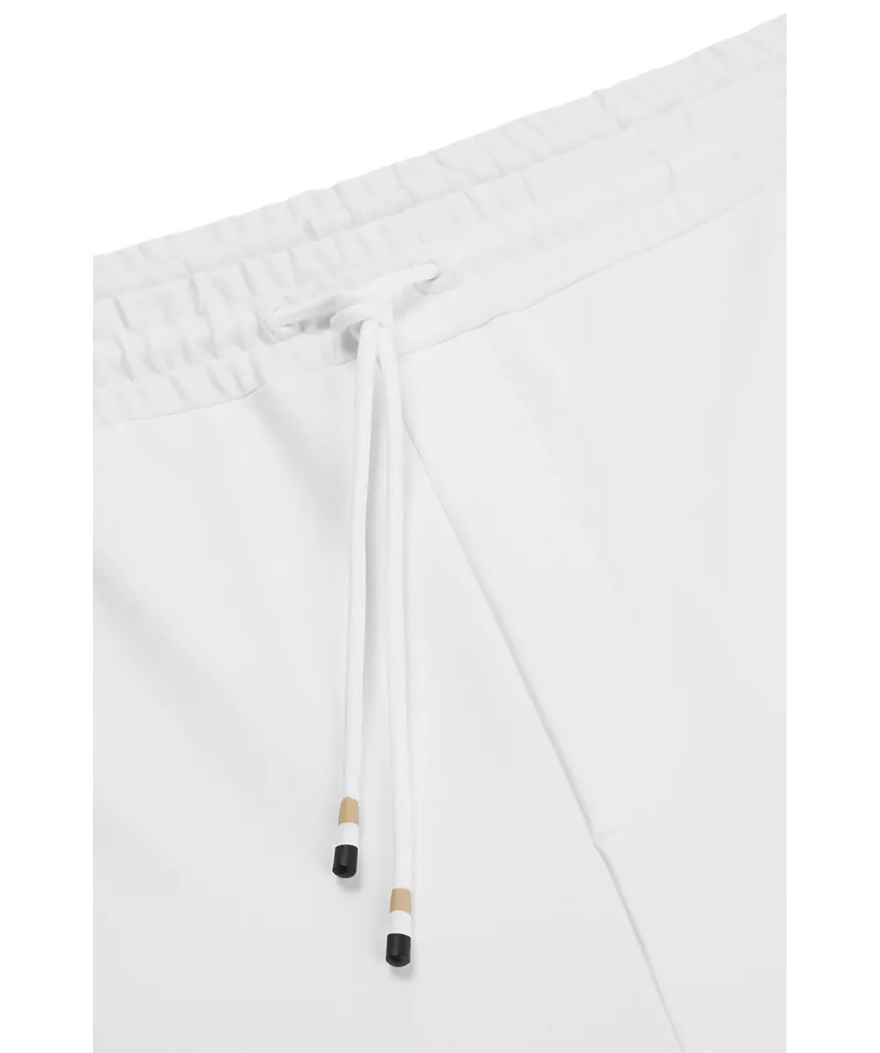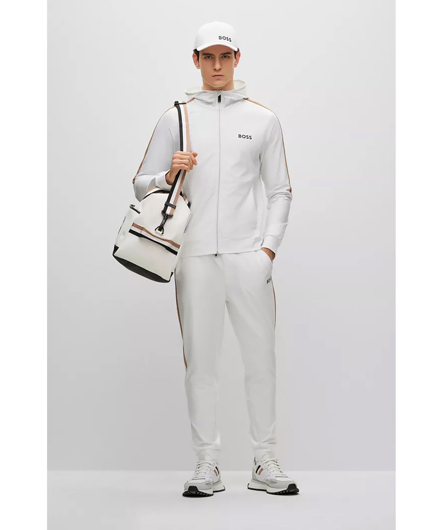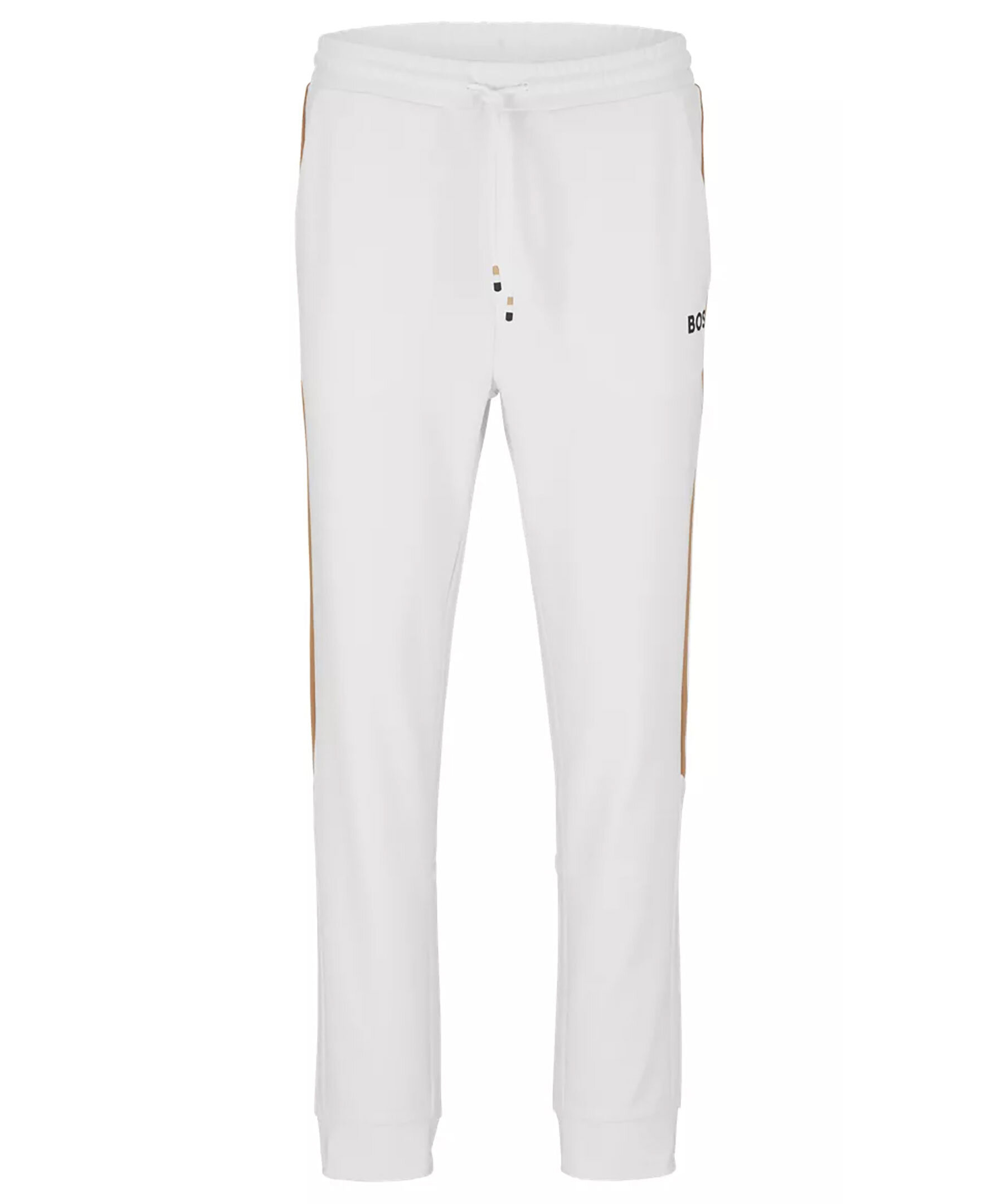Vita tracksuitbyxor från BOSS Green. Vit, liten BOSS-logotyp under den vänstra fickan och detaljerade med signaturränder vid varje sidosöm. Dragsko i midjan med snörning, fickor i sidorna. Prestandastretchtyget ger enkel komfort på aktiva dagar. En del av den dynamiska kapselkollektionen BOSS x Matteo Berrettini, skapad av den italienska professionella tennisspelaren.