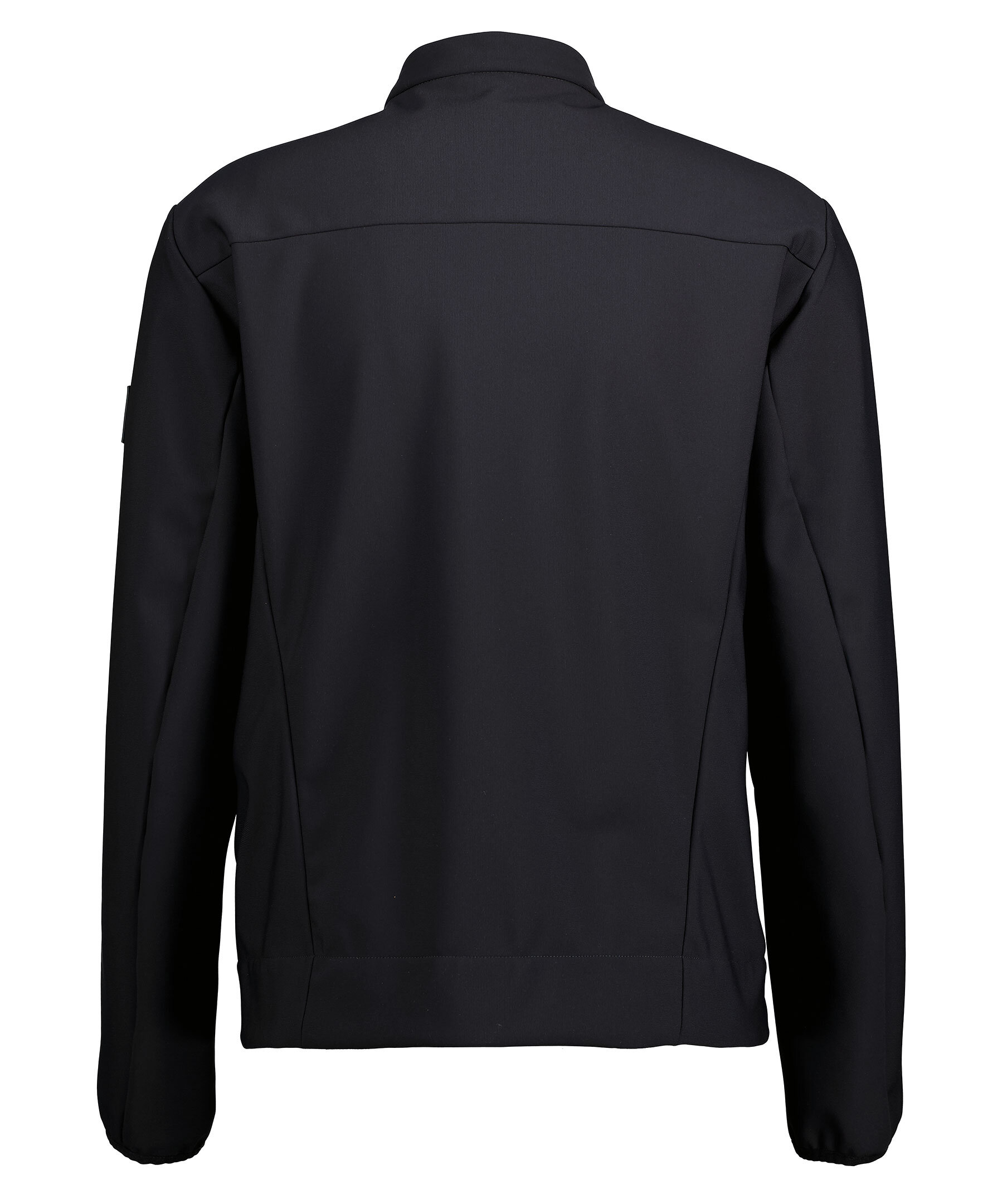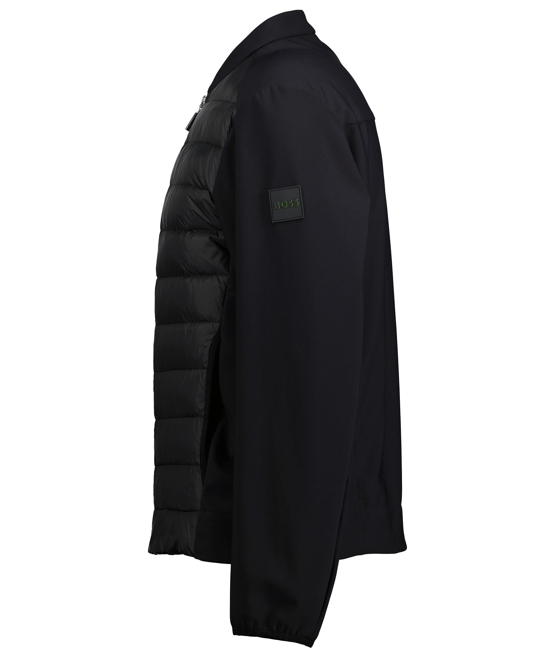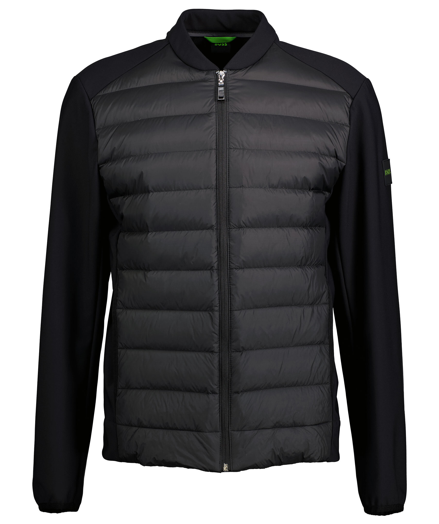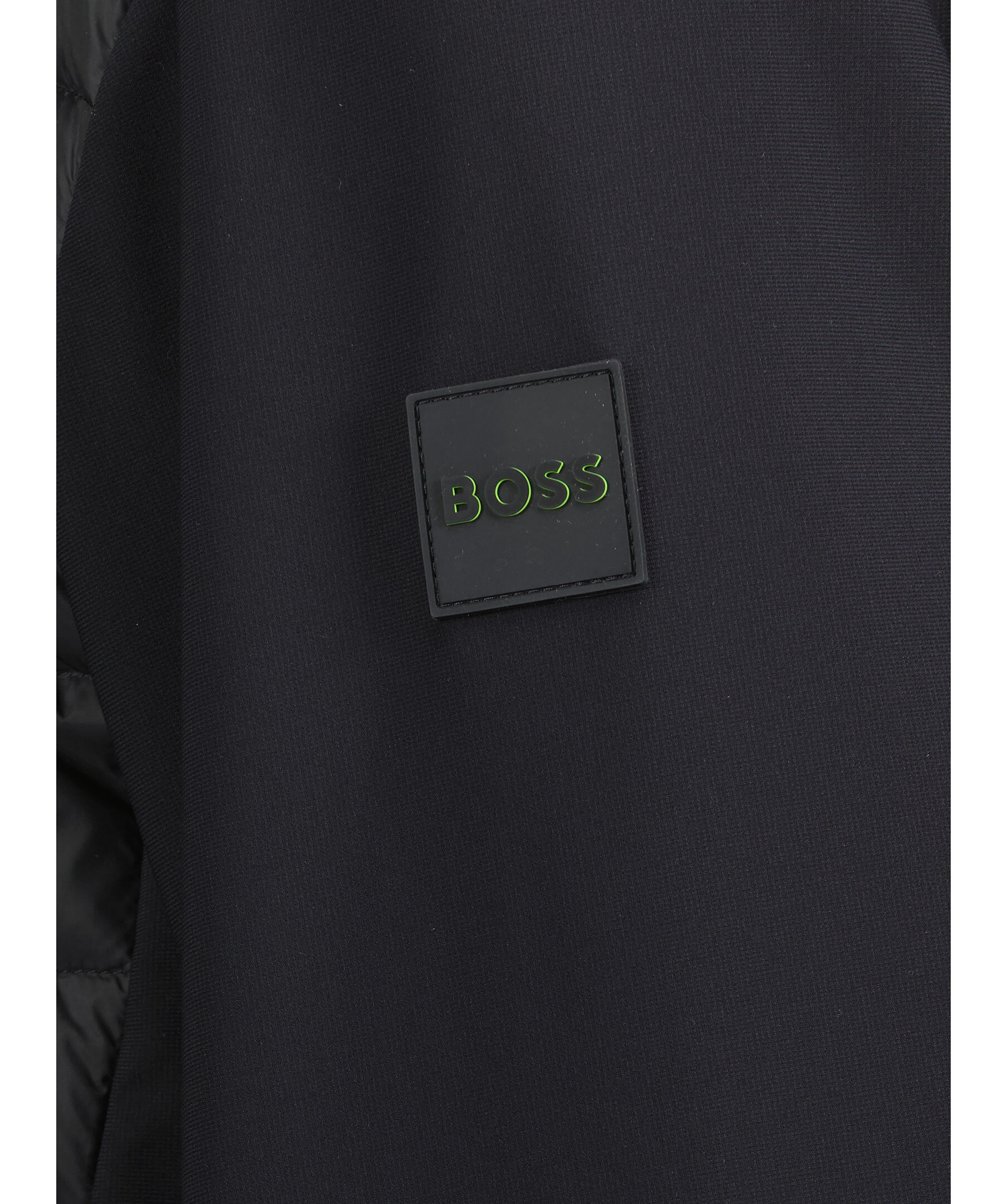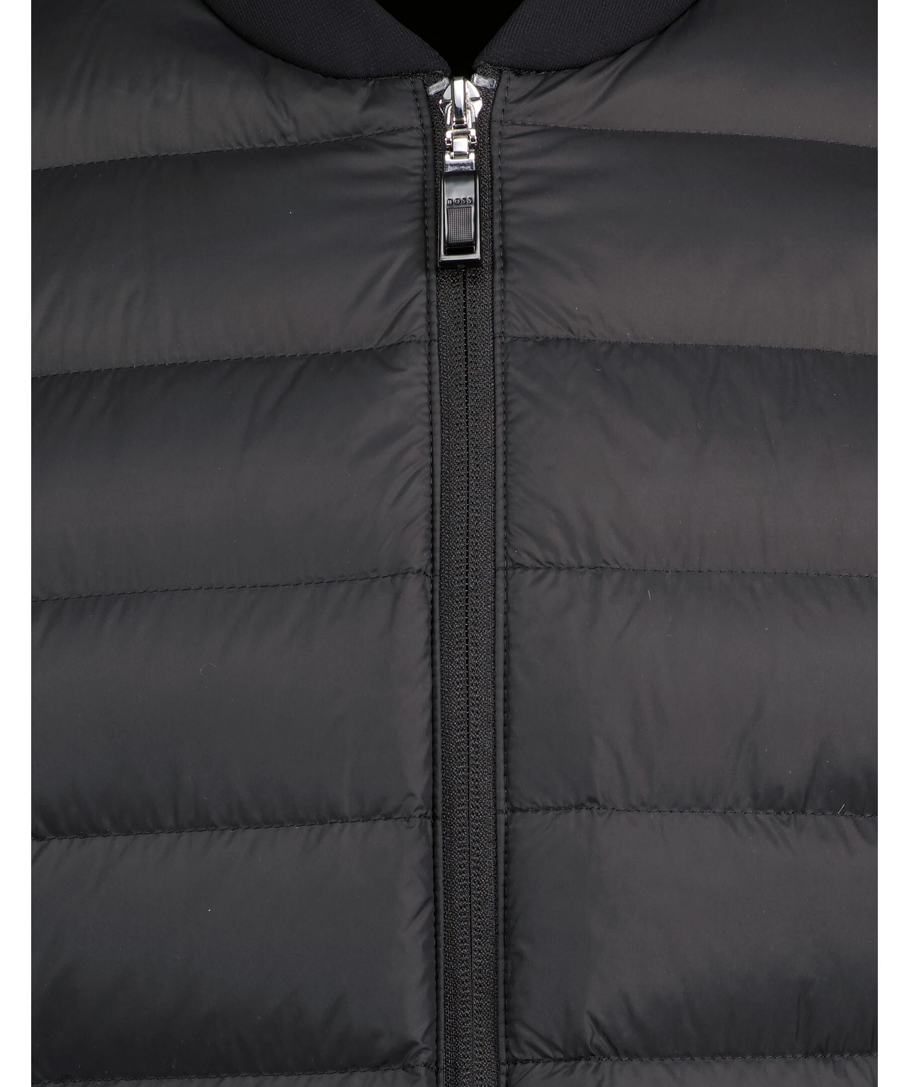 Svart hybridjacka från BOSS Green. Stängs med dragkedja framtill och vadderad panel på jackans framsida. Tunna, elastiska muddar i ärmslut och sidofickor. Gummerad patch med logotyp på vänster ärm.