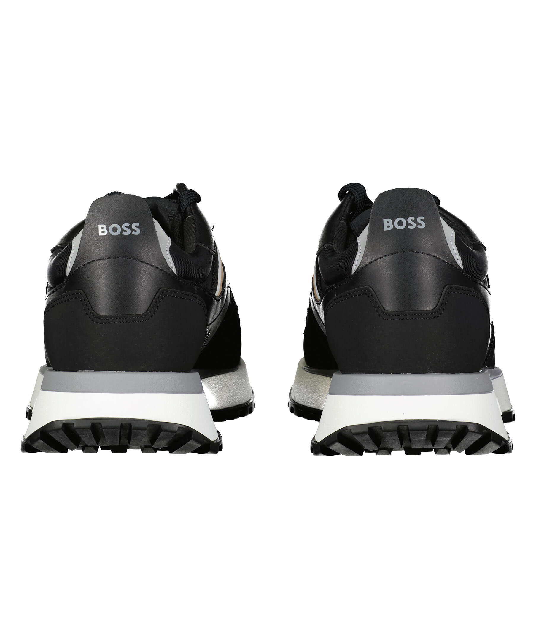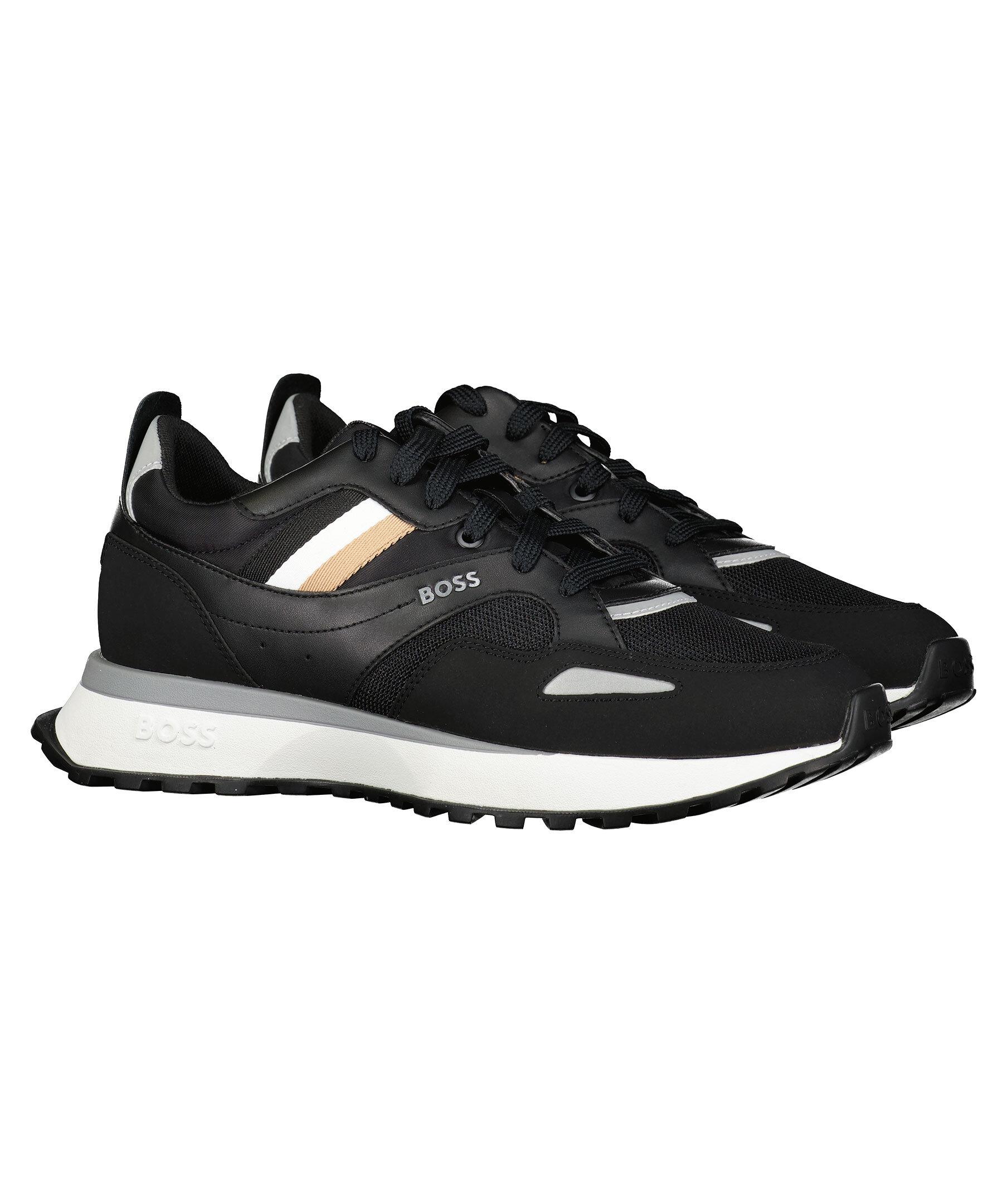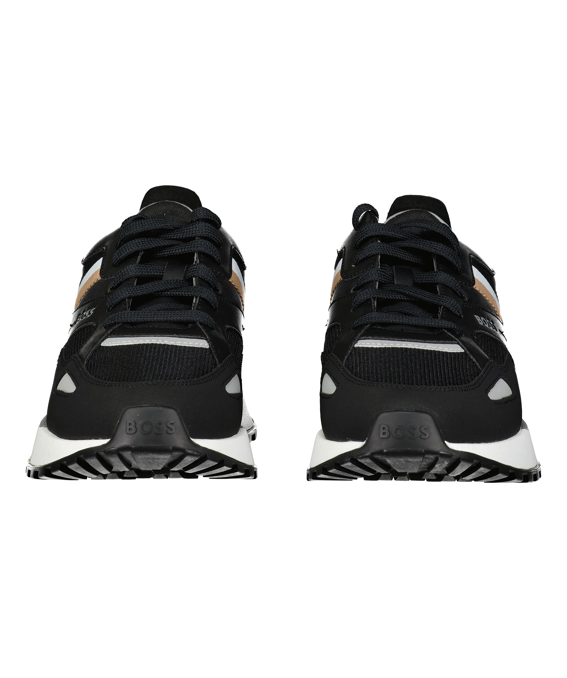 Svarta sneakers från BOSS Green. Reflexdetaljer fram och bak, svart/vit/beige detalj vid sidan och svart snörning framtill. Tillverkade i textil, gummi och regenererat läder.