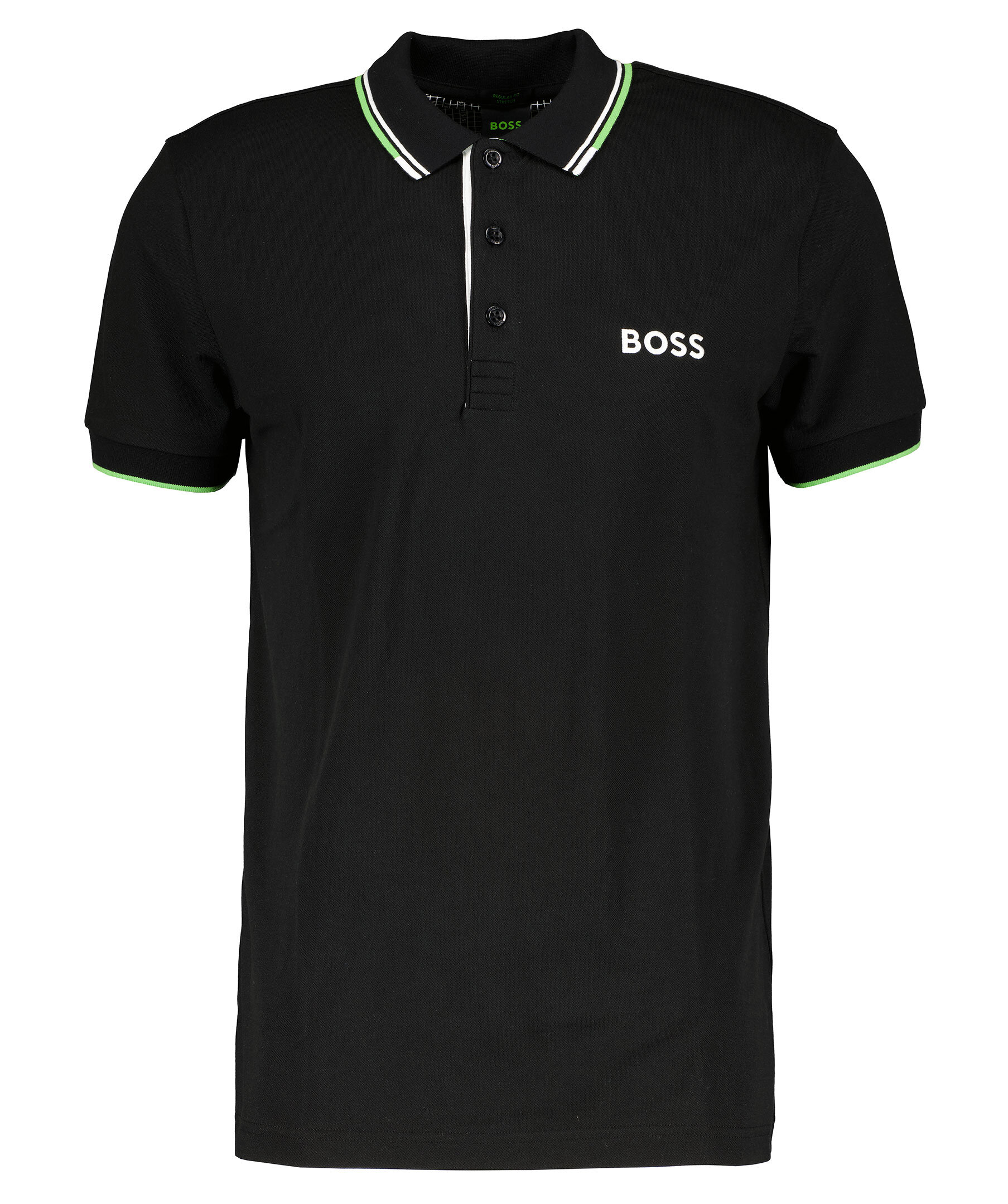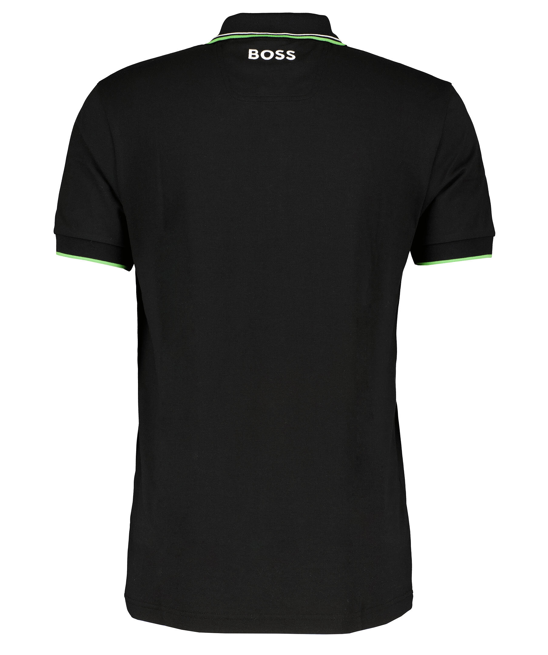 Svart piké från BOSS Green. Broderad logotyp på vänster bröst. Ribbstickade muddar i ärm och kragen. Gröna och vita detaljer på kragen. Tillverkad i en bomullsblandning.
