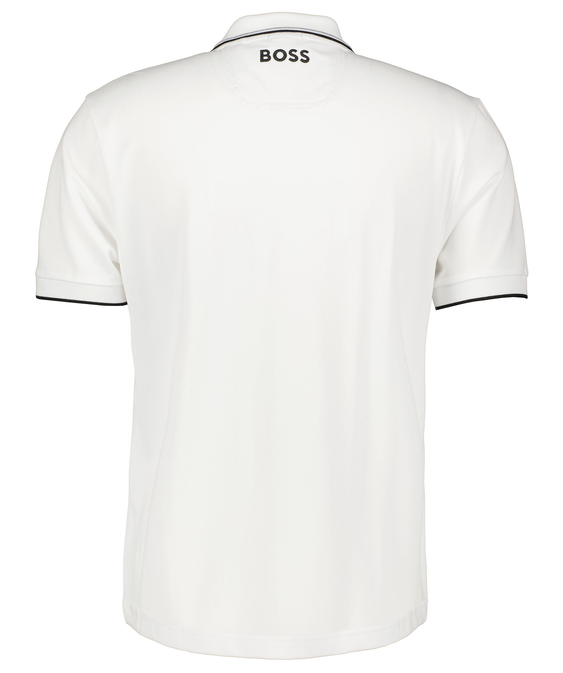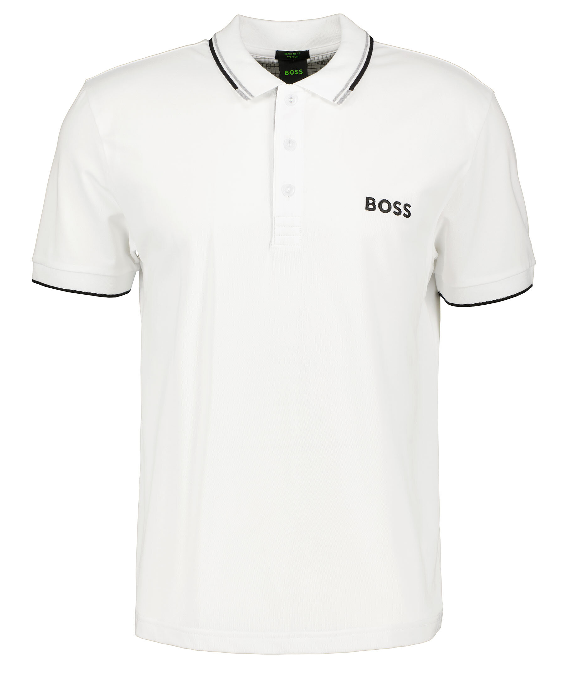 Vit piké från BOSS Green. Genomskinliga knappar. Broderad logotyp på vänster bröst. Ribbstickade muddar i ärm och kragen. Grå och svarta detaljer på kragen. Tillverkad i bomullsblandning.