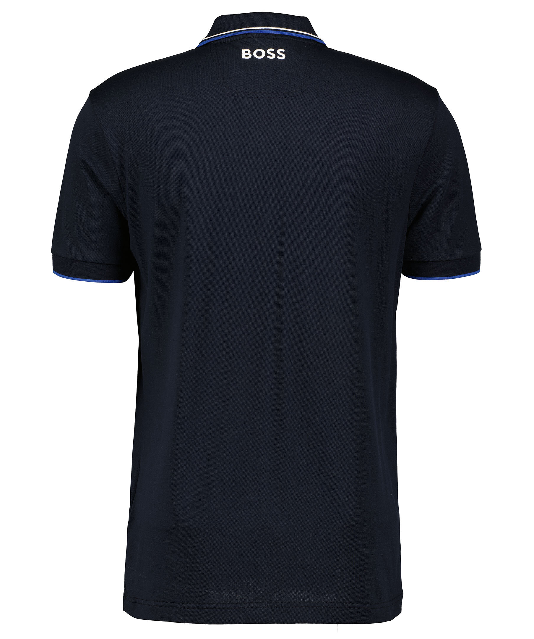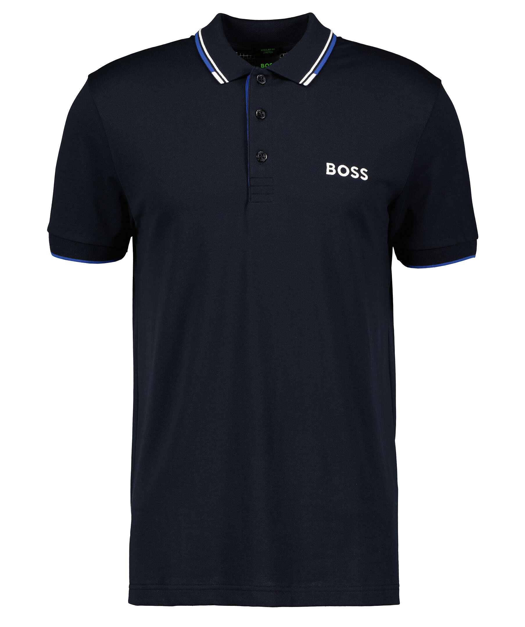 Mörkblå piké från BOSS Green. Broderad logotyp på vänster bröst. Ribbstickade muddar i ärm och kragen. Blå och vita detaljer på kragen. Tillverkad i bomullsblandning.