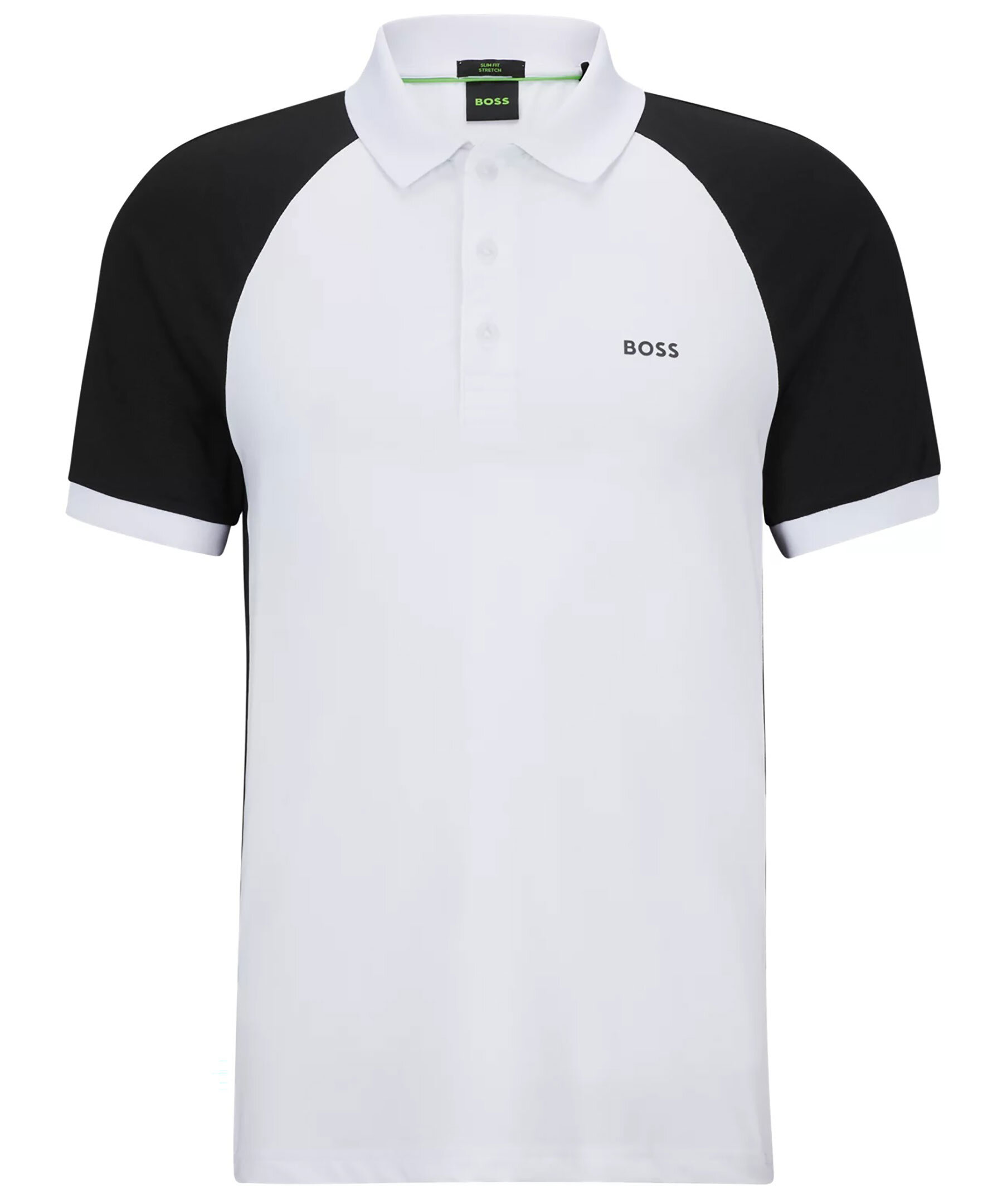 Svart, vit piké från BOSS Green. Tillverkad i stretch material med textur. Ribbstickad krage med vit rand. Tryckt logotyp på vänster bröst och baktill i nacken.