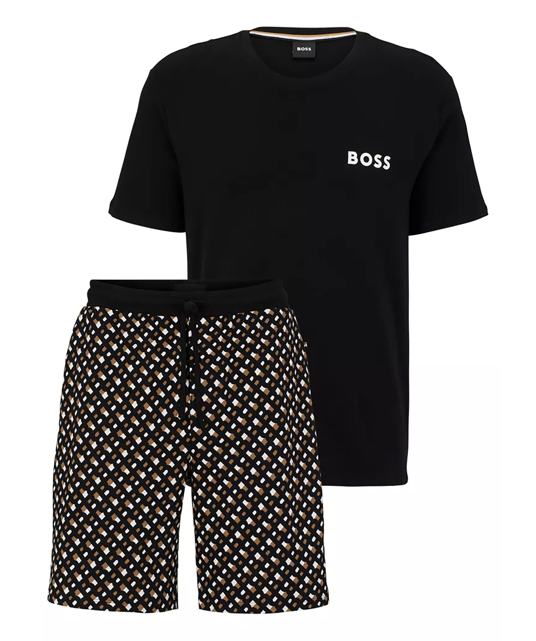 Svart, avslappnad pyjamas från BOSS Green. Tillverkad i interlock-tyg med kontrastmärke på bröstet och upprepade monogram på shortsen. Rundad halringning på överdelen som är en t-shirt samt mudd i midjan med dragsko på shorten.