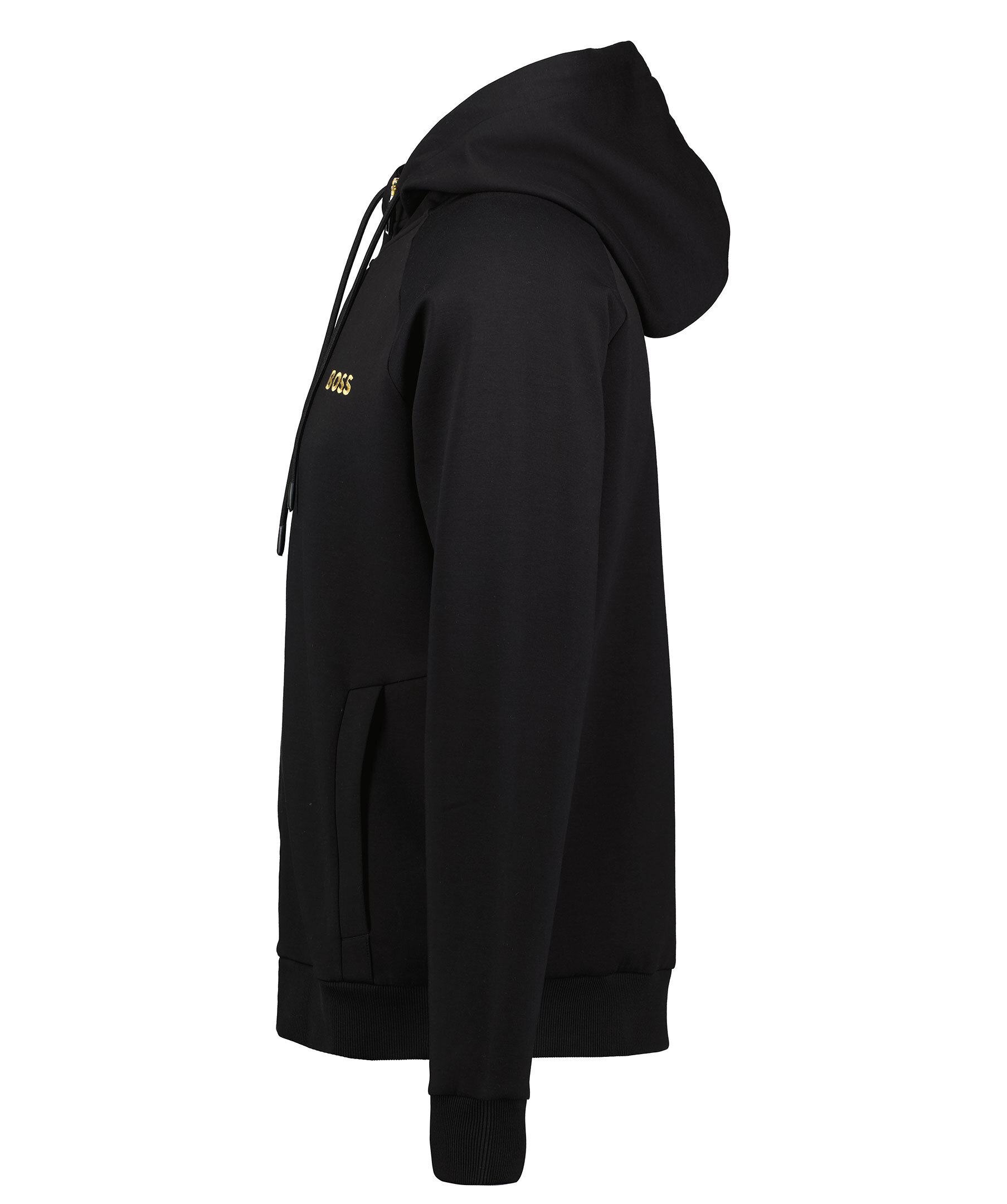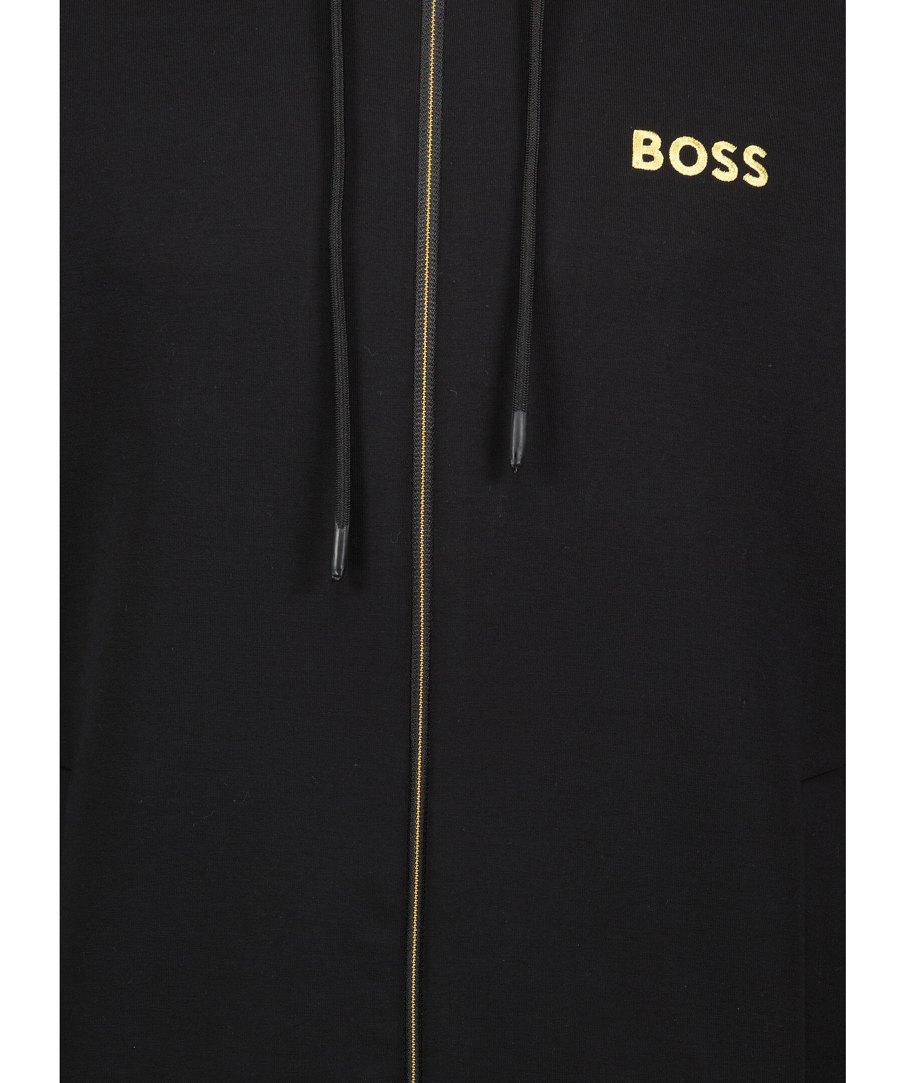 Svart hoodie med dragkedja fram från BOSS Green. Liten, guldfärgad logotyp broderad på vänster sida av bröstet, luva med snörning och ribbade muddar i ärmslut och plaggslut. Har öppna fickor i sidorna och är tillverkad i bomullsmix.