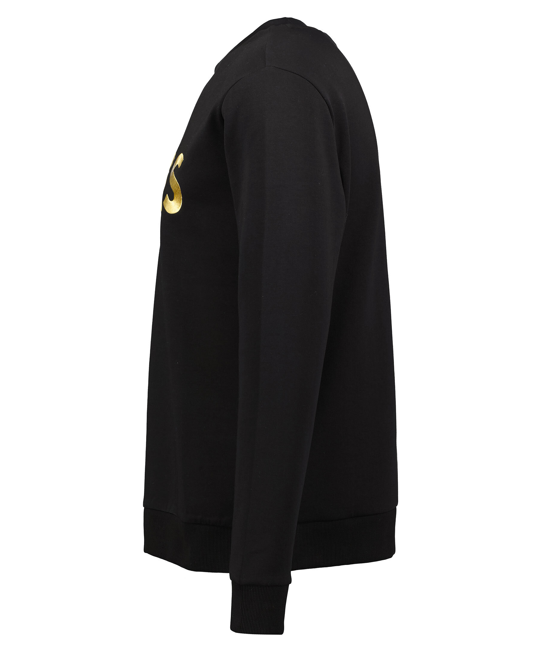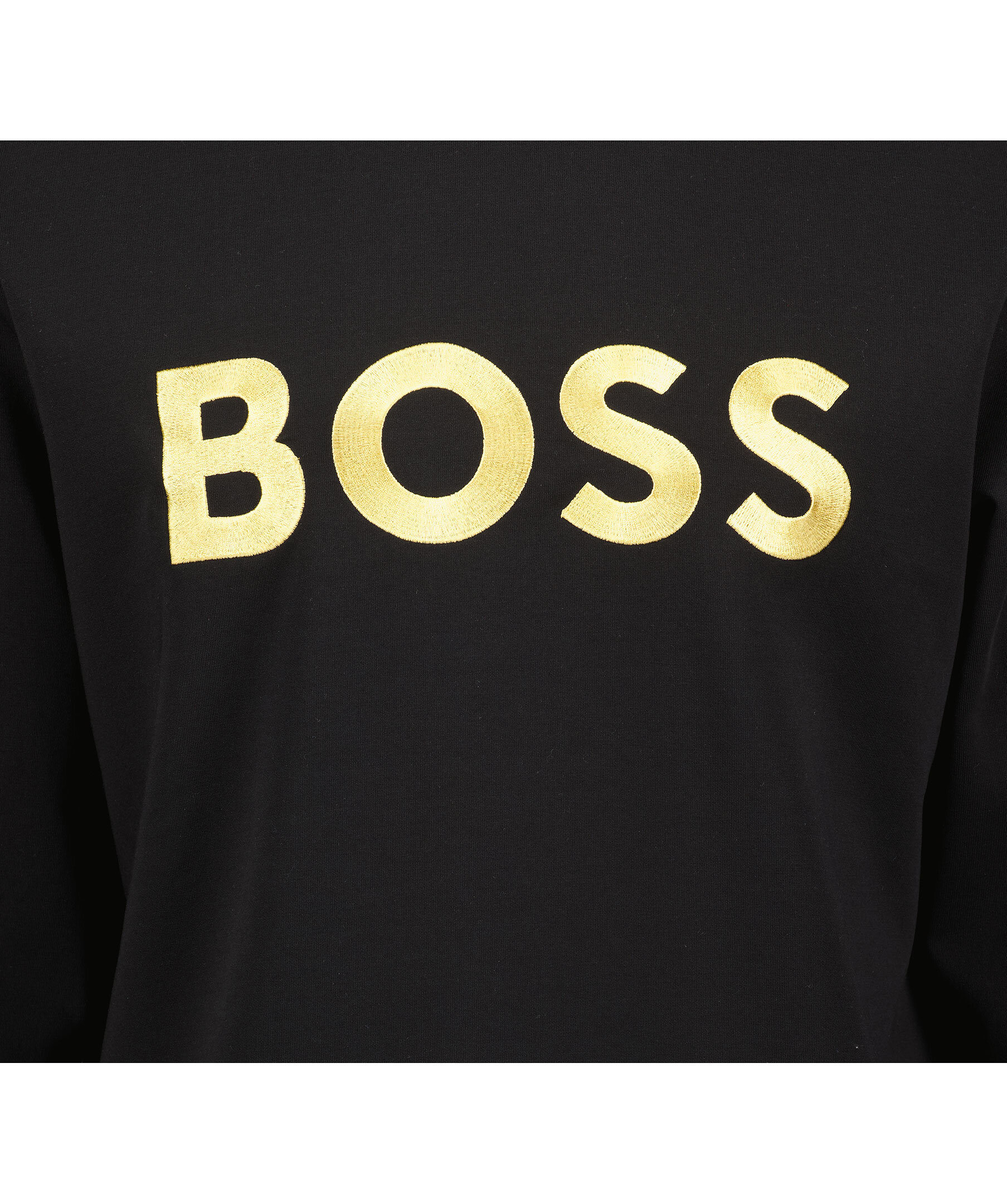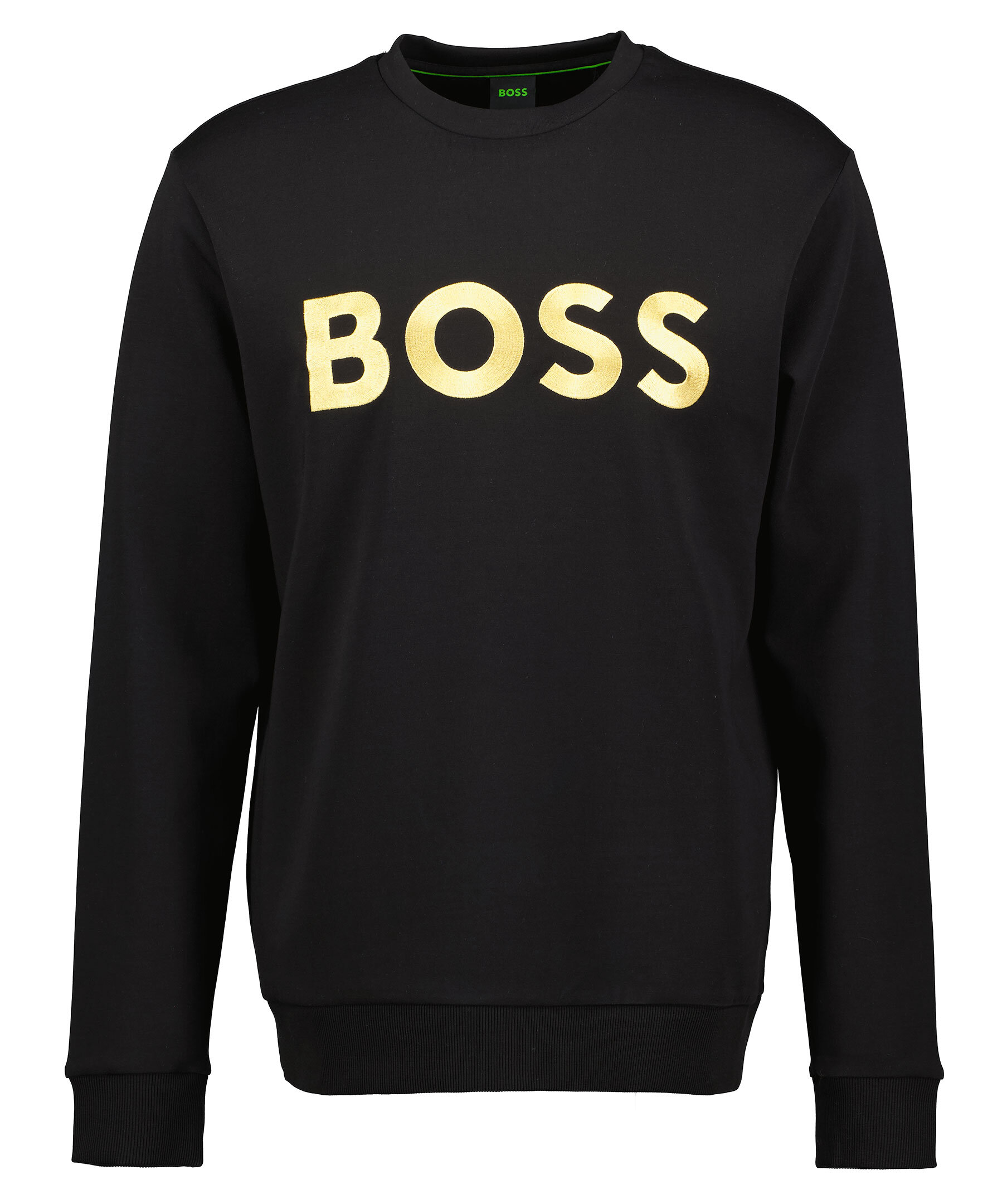 Svart sweatshirt från BOSS Green. Stor, guldfärgad logotyp broderad på bröstet, rundad hals och ribbade muddar i ärmslut, halsringning och plaggslut. Tillverkad i bomullsmix.