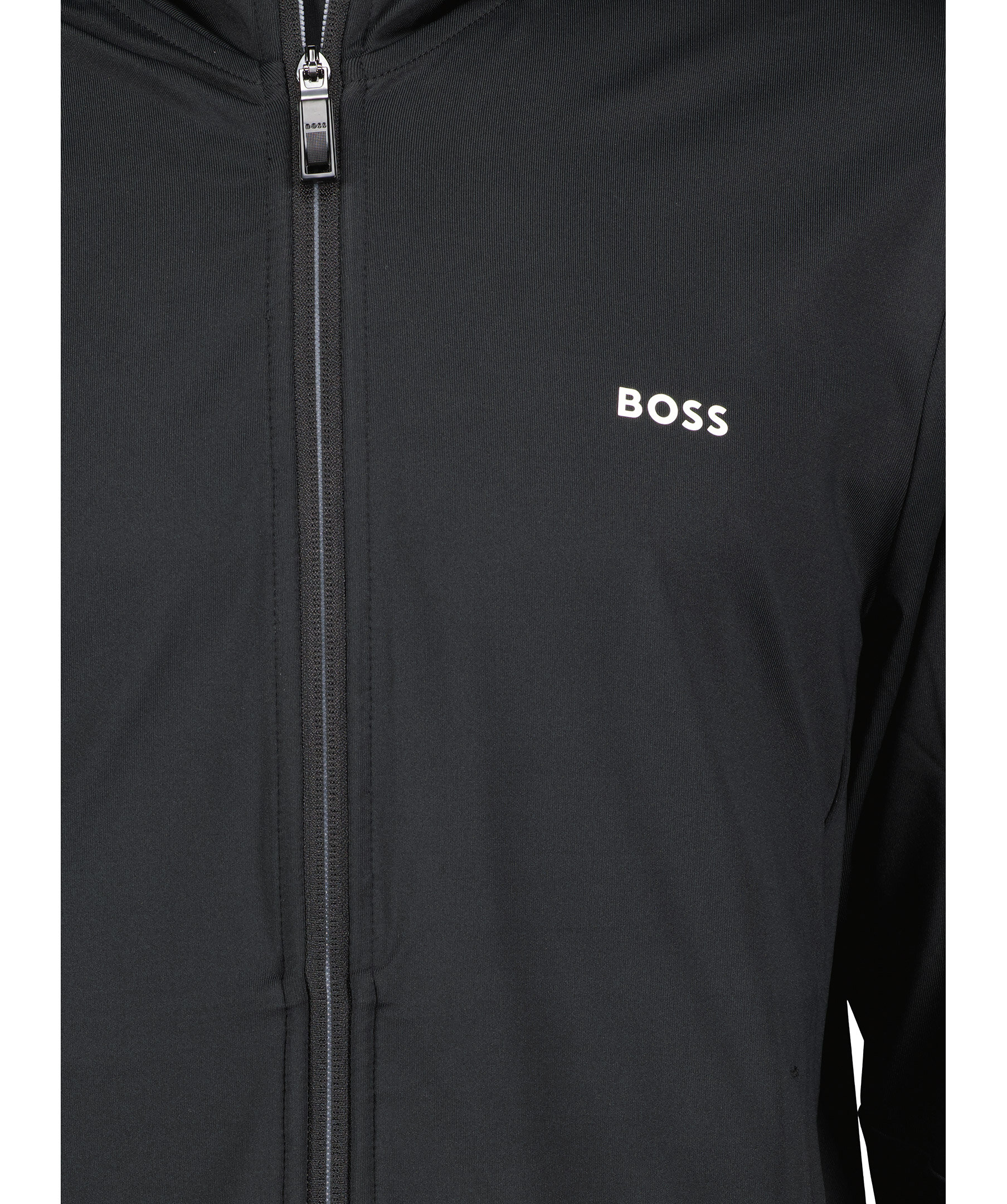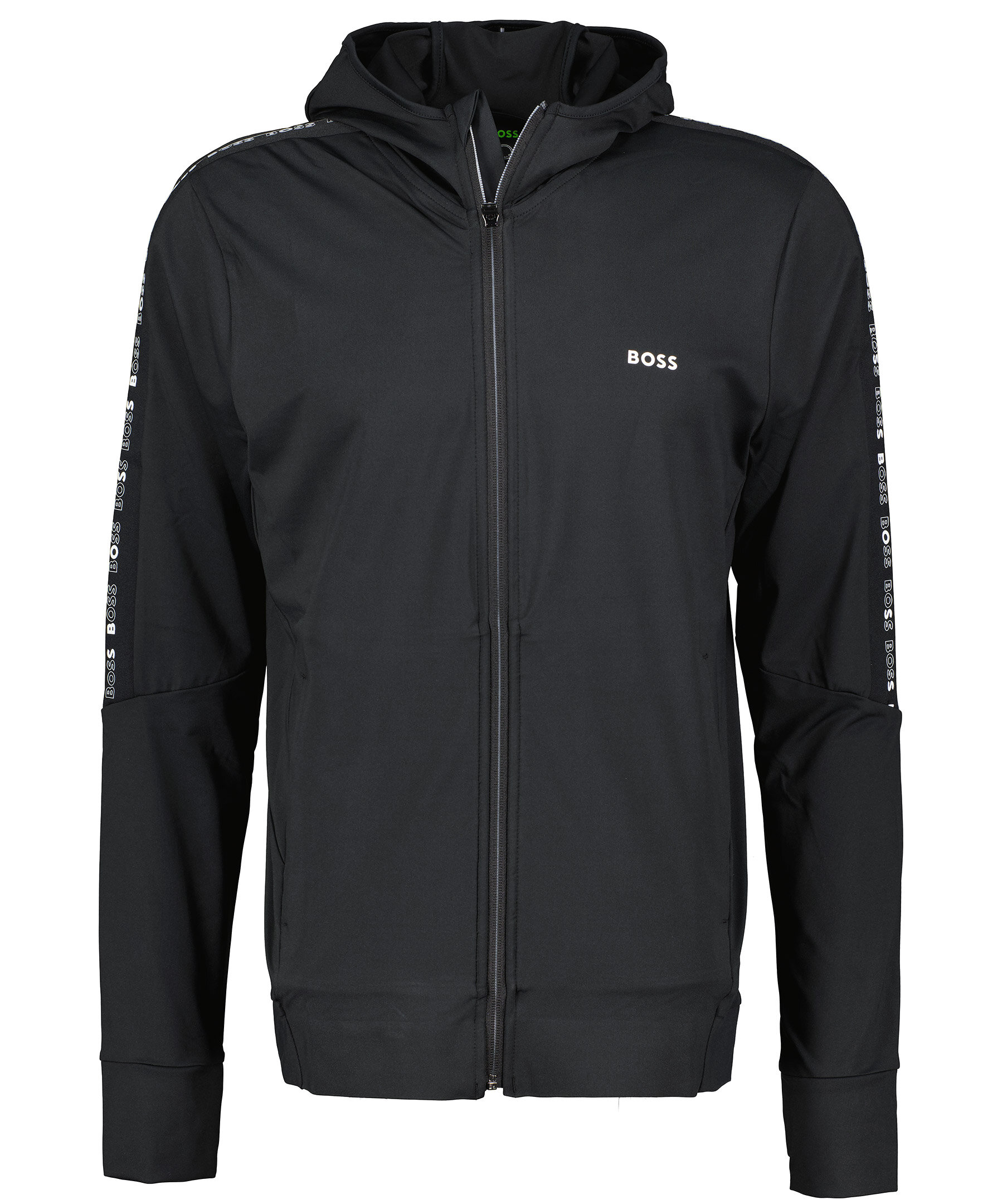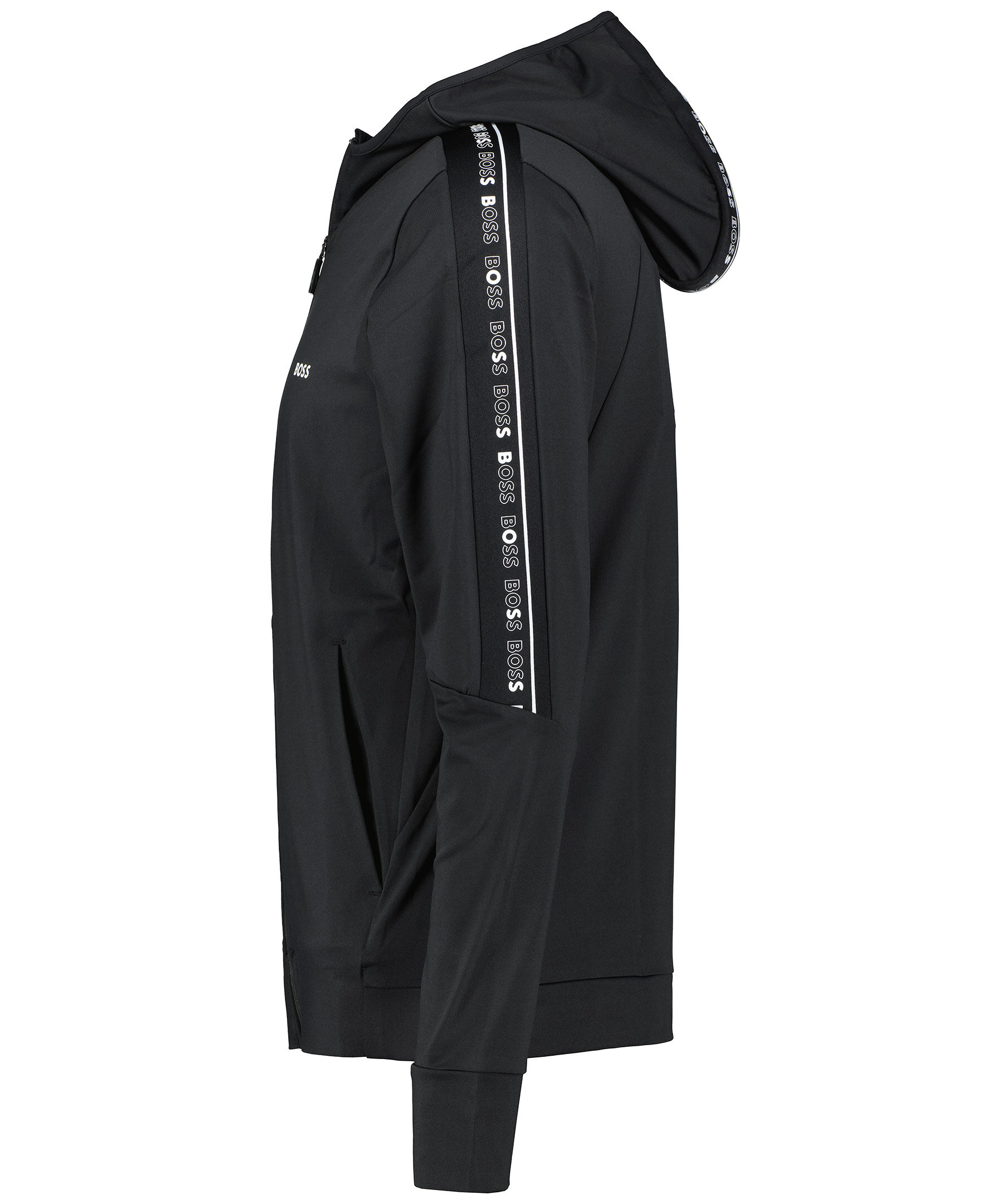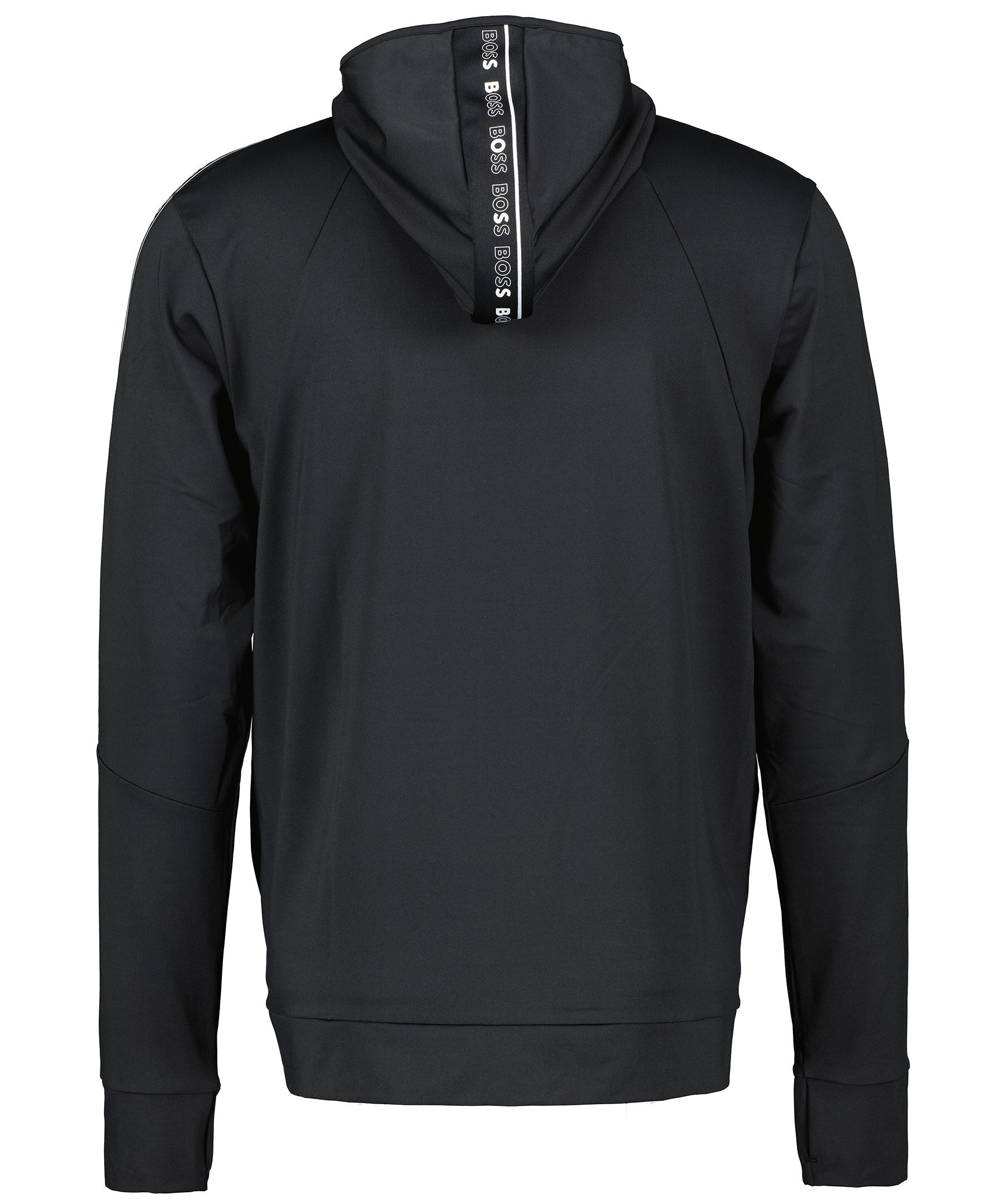 Svart tränings hoodie från BOSS Green. Stängs framtill med dragkedja. Två fickor framtill. tryckt logotyp på vänster bröst. Revärer med tryckta logotyper på ärmarna och luvan.