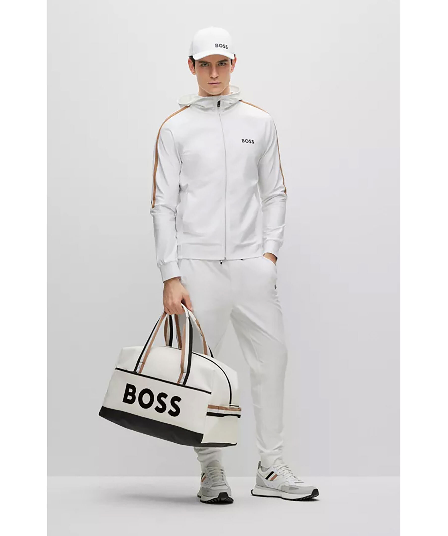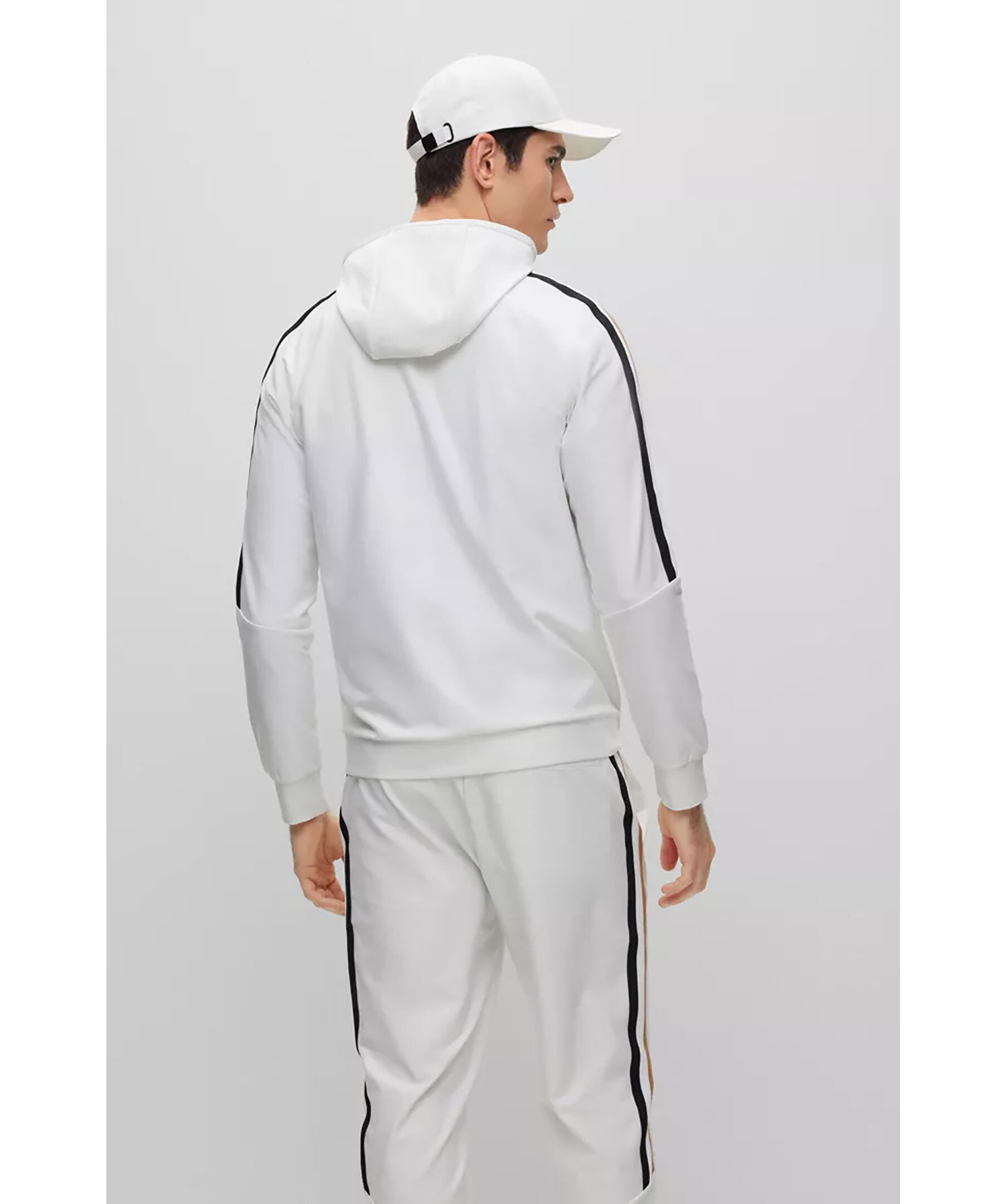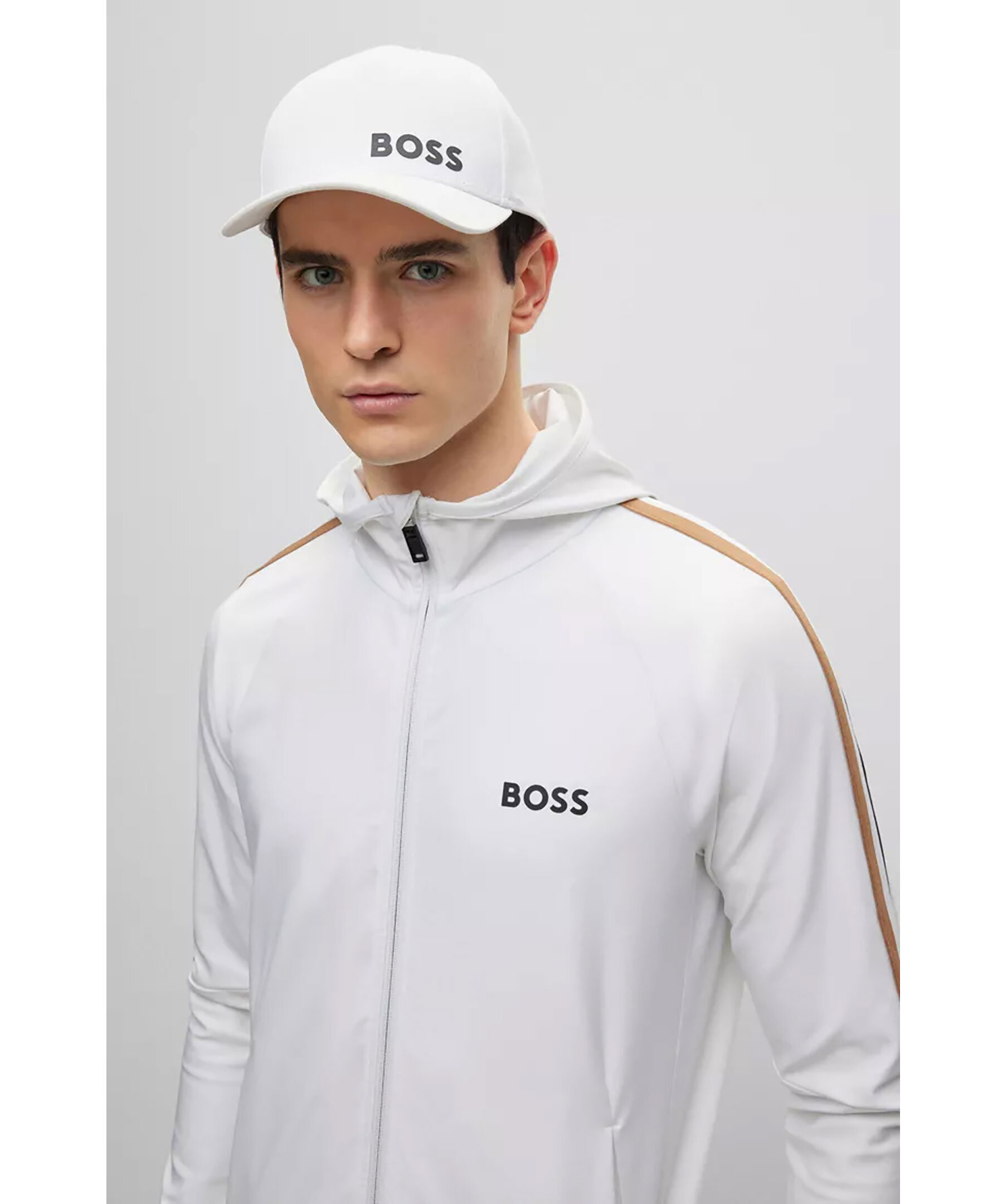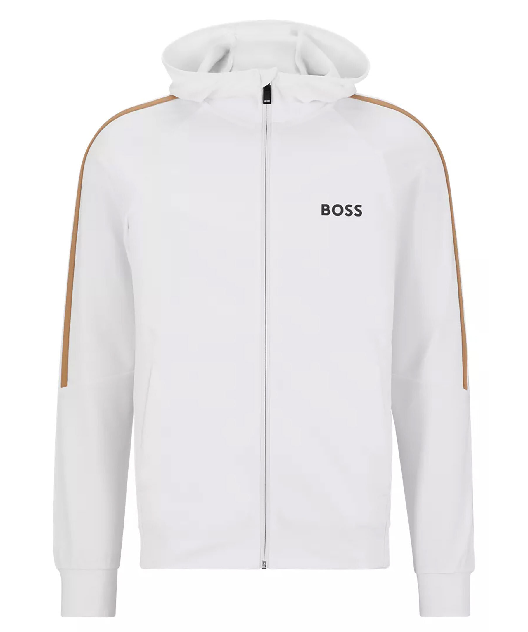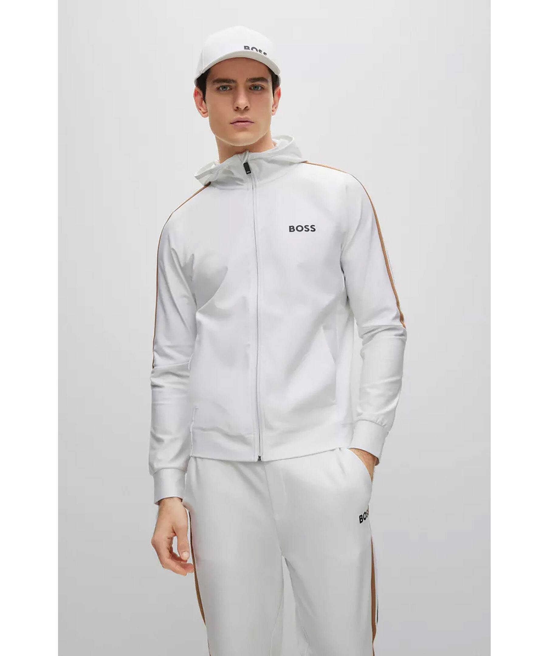 Vit hoodie med dragkedja i normal passform i stretchjersey från BOSS Green. Signaturrevär längs axlarna och logotyp på vänster sida på bröstet. Luva hög krage, sidofickor samt muddar i ärmslut och plaggslut. En del av den dynamiska kapselkollektionen BOSS x Matteo Berrettini, skapad av den italienska professionella tennisspelaren.
