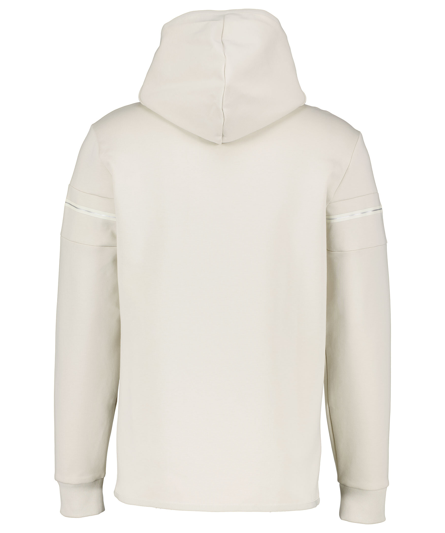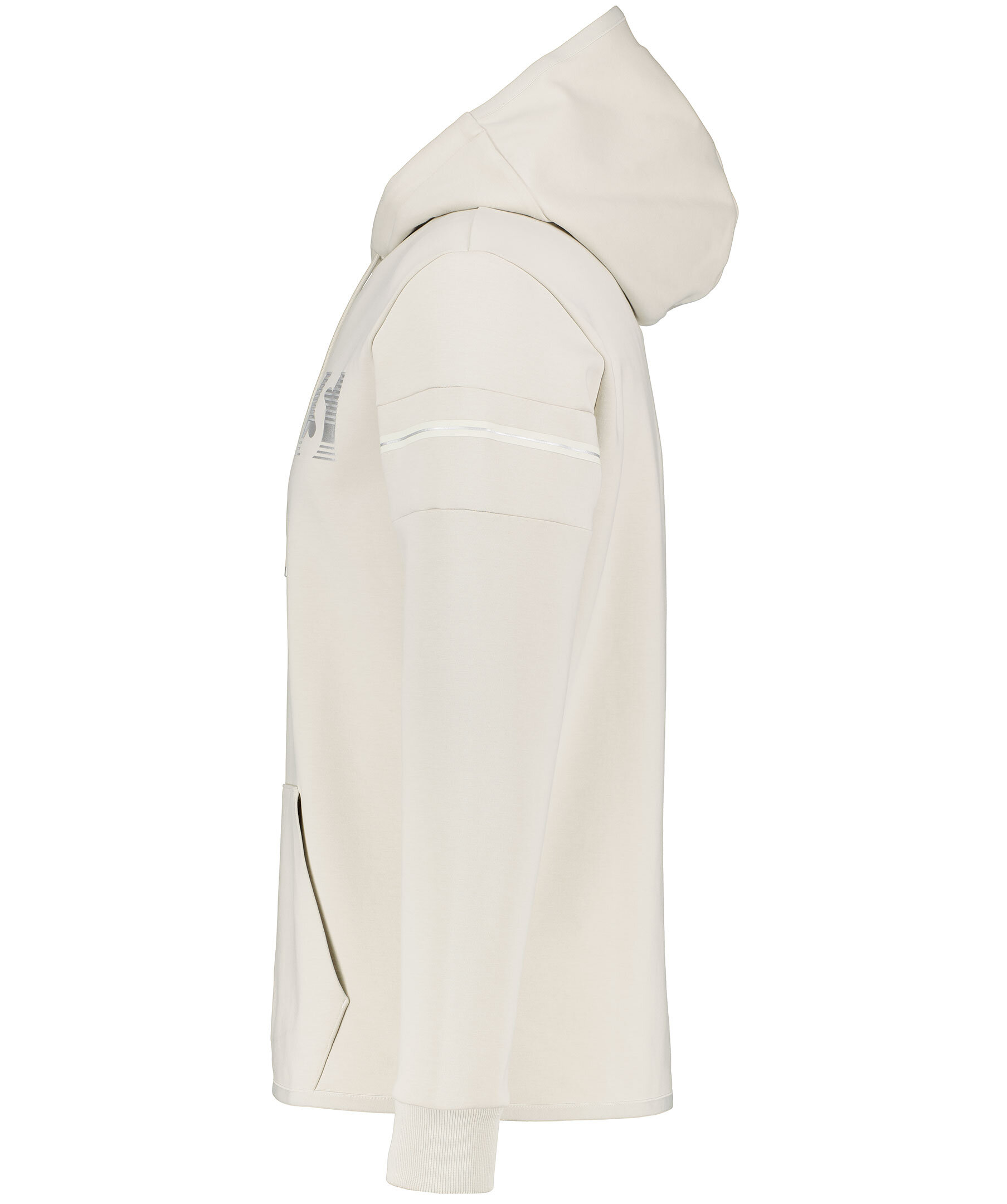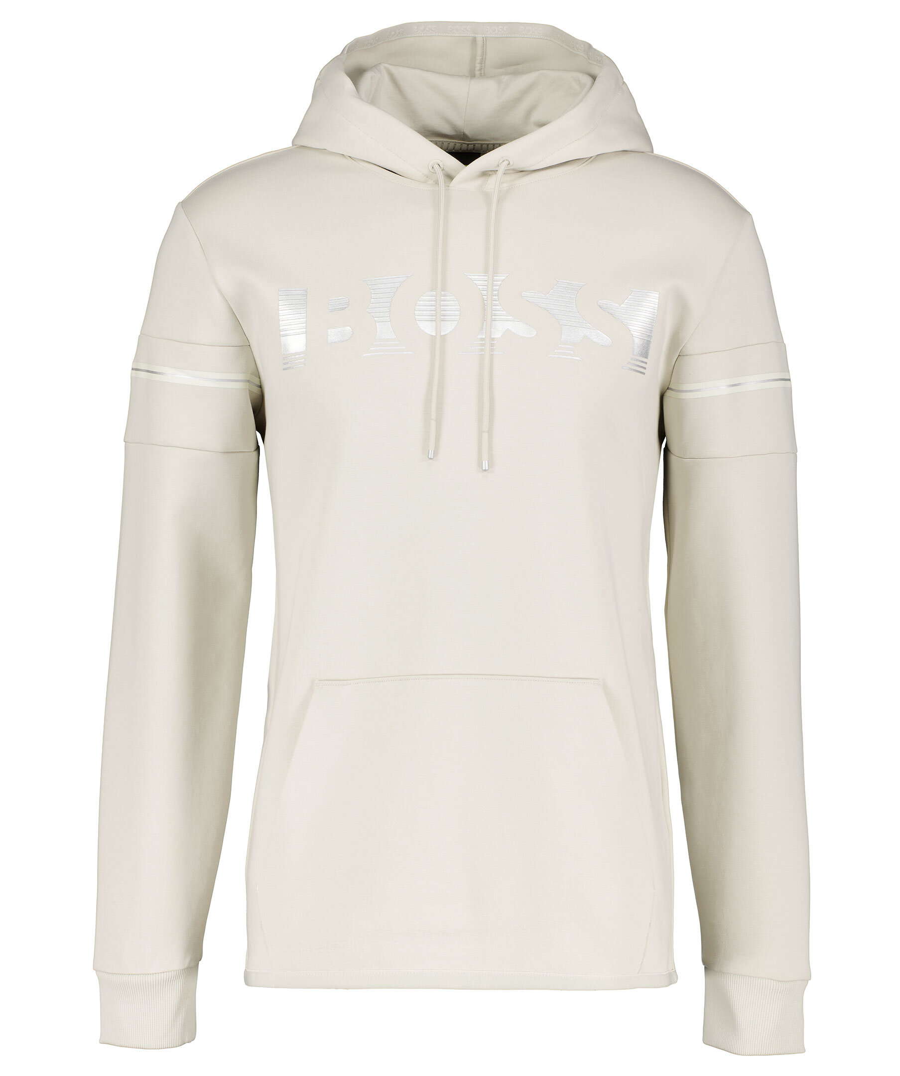 Sandfärgad hoodie från BOSS. Tillverkad i polyester och bomullsblandning. Silverfärgad, tryckt logotyp över bröstet, känguruficka på magen och ribbade muddar i ärmslut. Luva med snörning och dekorativa sömmar och tryckt streck i beige och silver runt överärmarna.