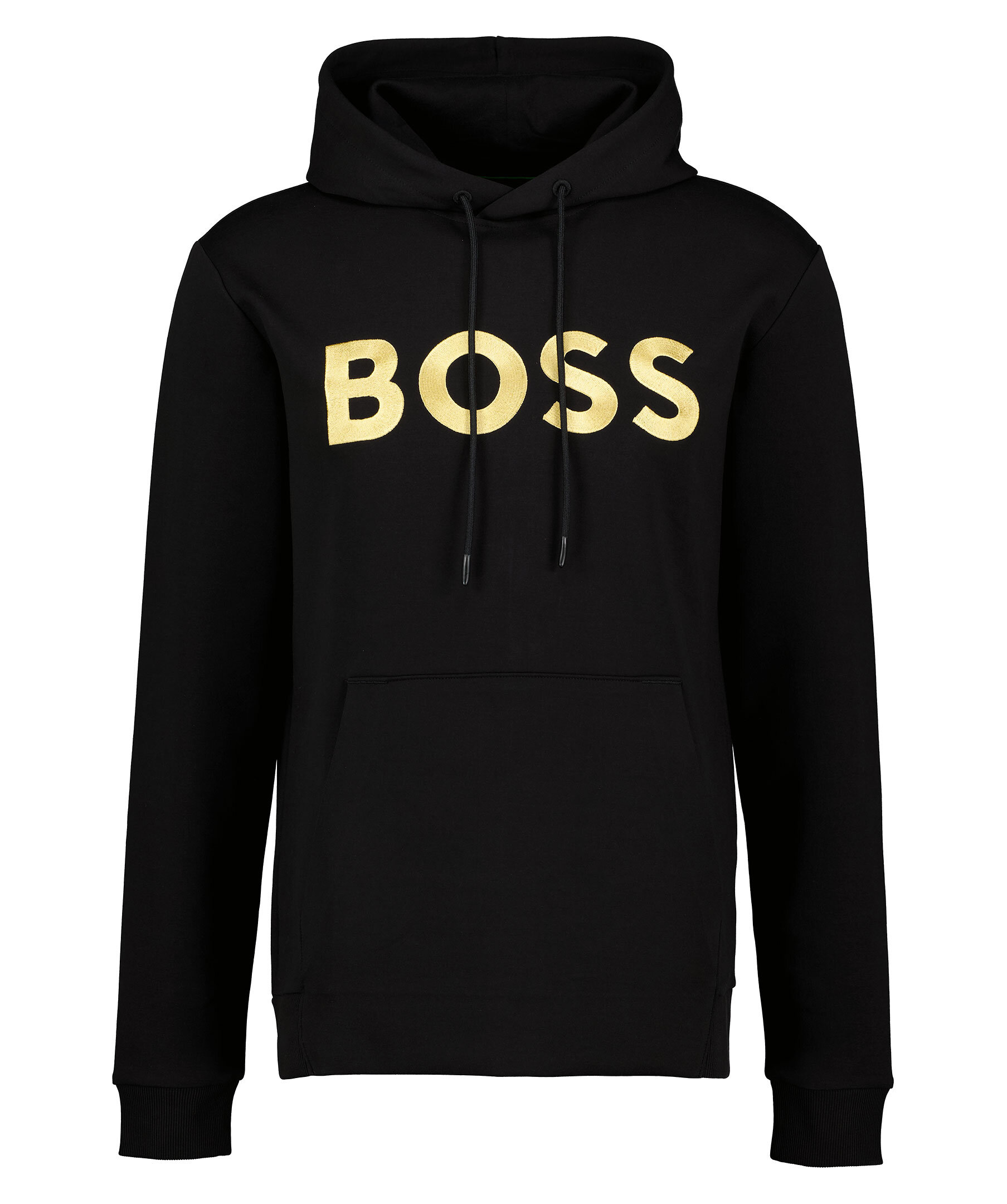 Svart hoodie från BOSS Green. Stor, guldfärgad logotyp broderad på bröstet, snörning i luvan, ficka på magen och ribbade muddar i ärmslut och plaggslut. Tillverkad i bomullsmix.