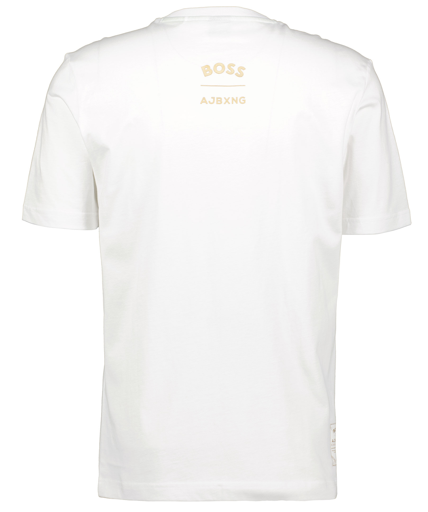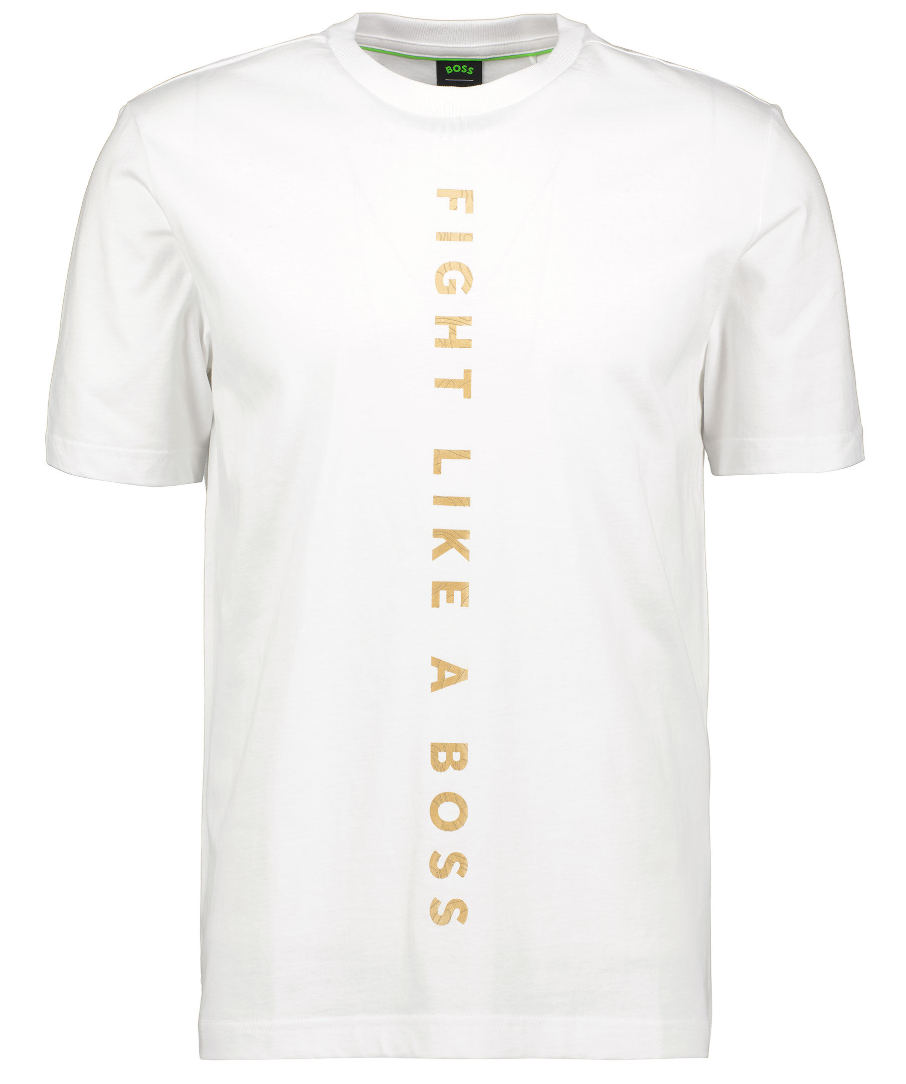 Vit T-shirt från BOSS Green med rundad halsringning. Guldfärgad text med textur mitt på magen och bröstet. Tillverkad i 100% bomull.