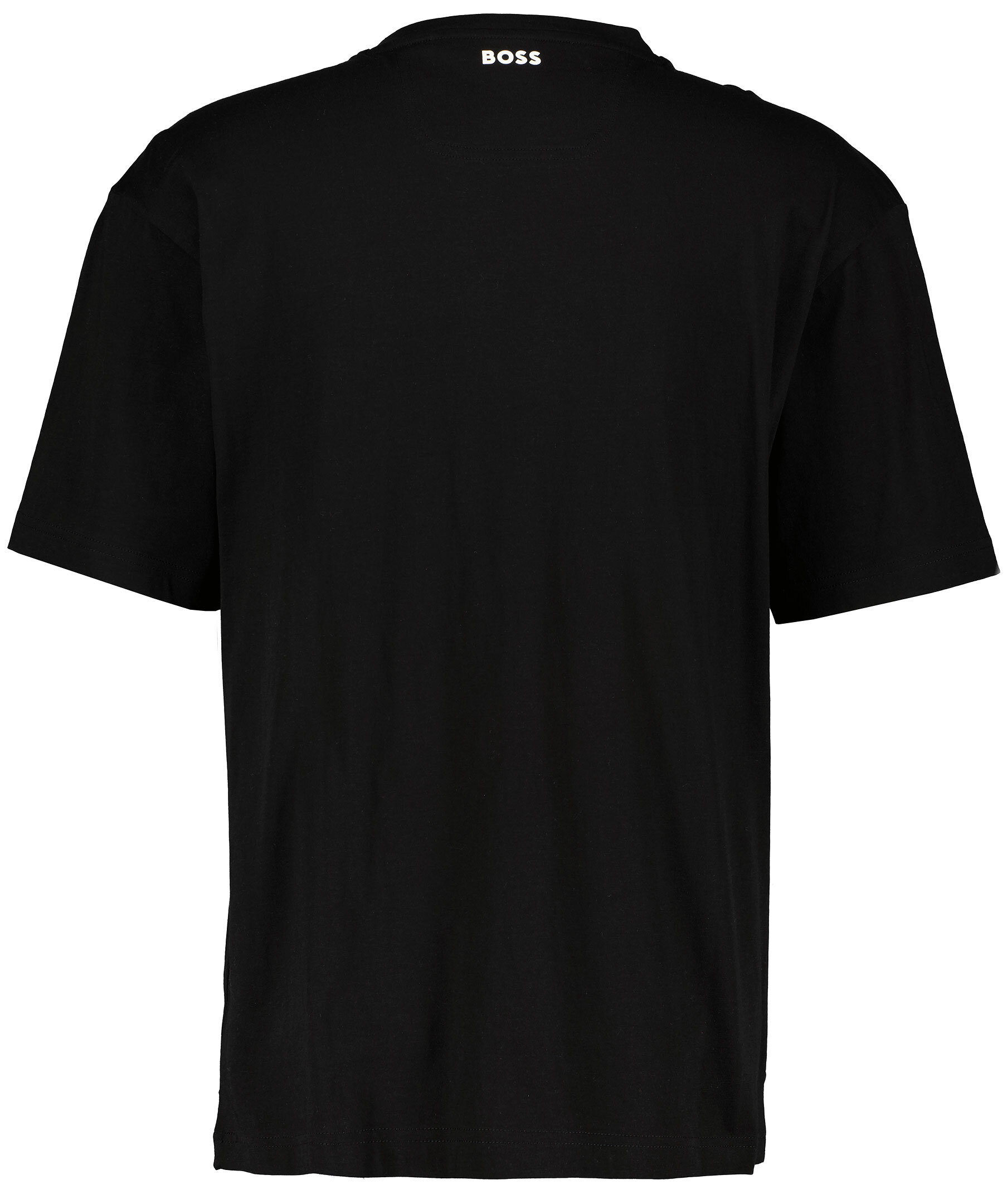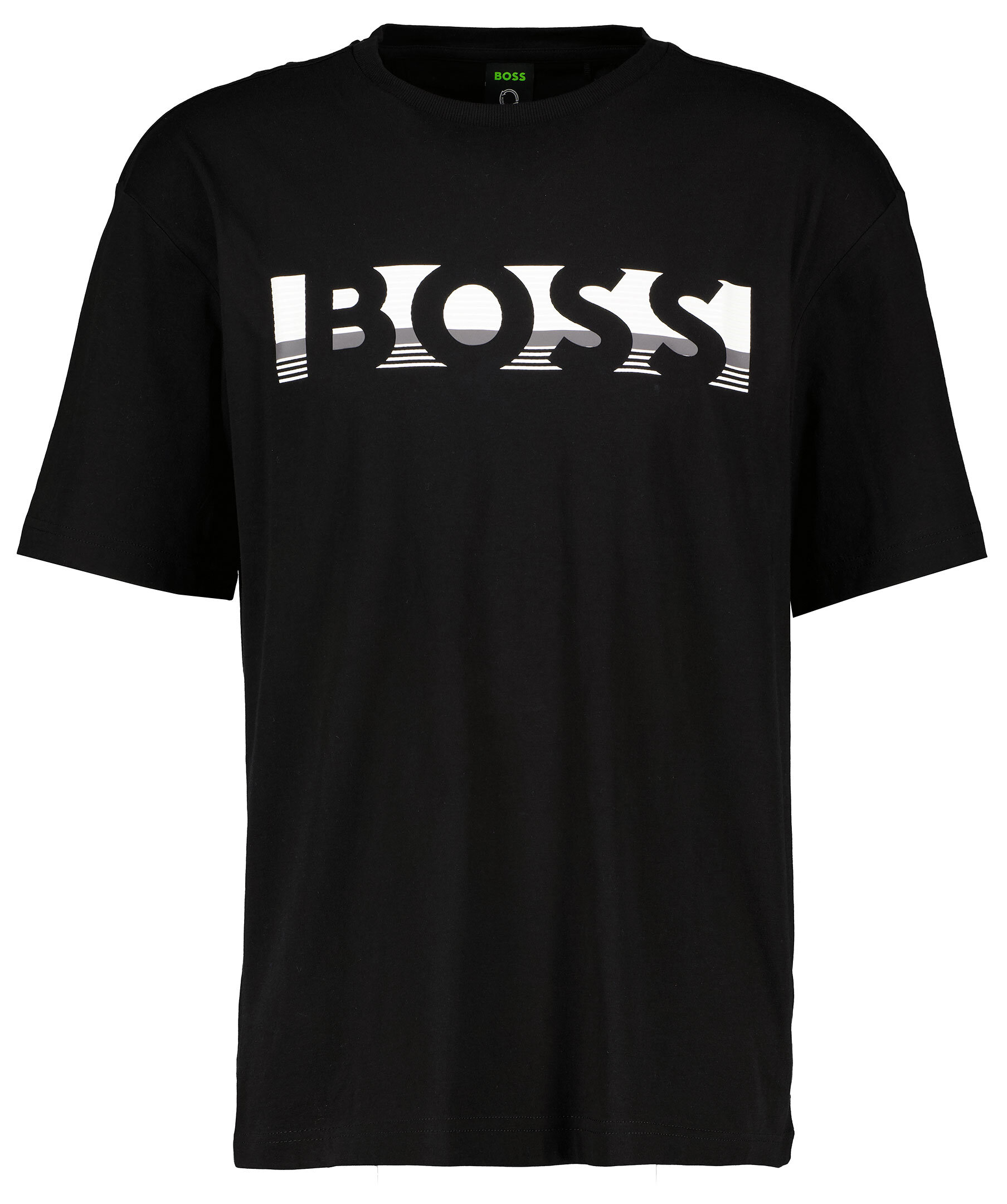 Svart t-shirt från BOSS. Gjord i bomullsblandning. Rundad hals med tunn mudd. Logotyp med en bredrandig bakgrund i grått, vitt och svart tryck över bröstet.