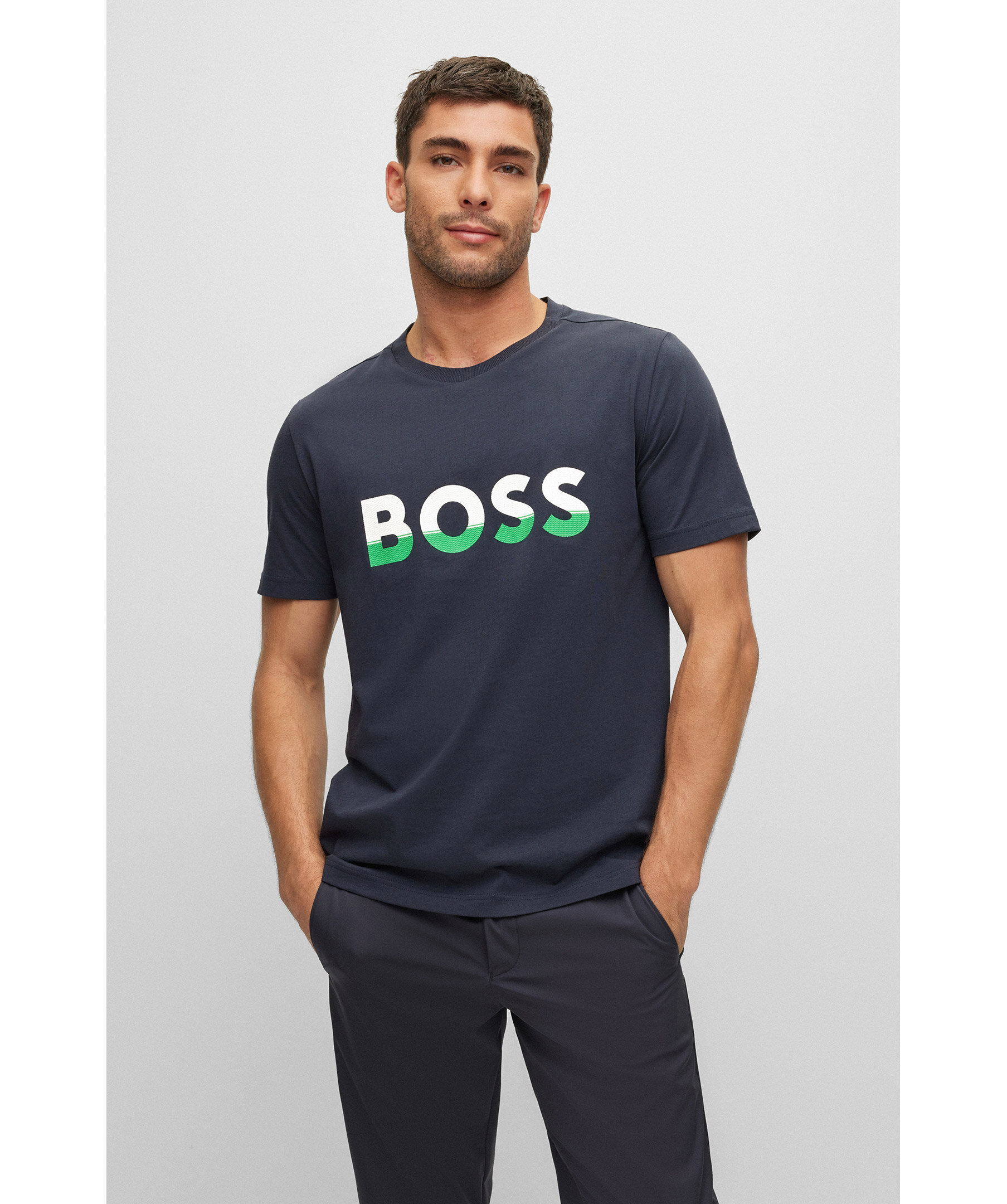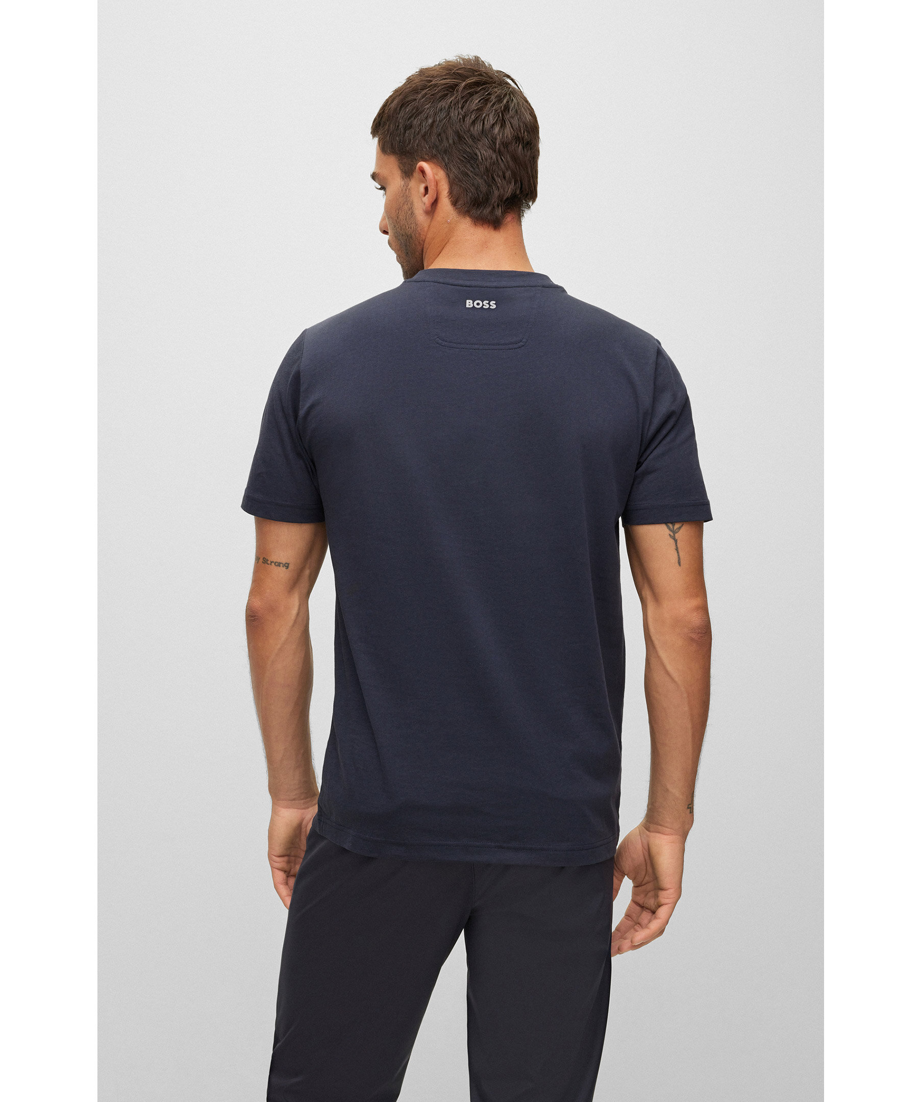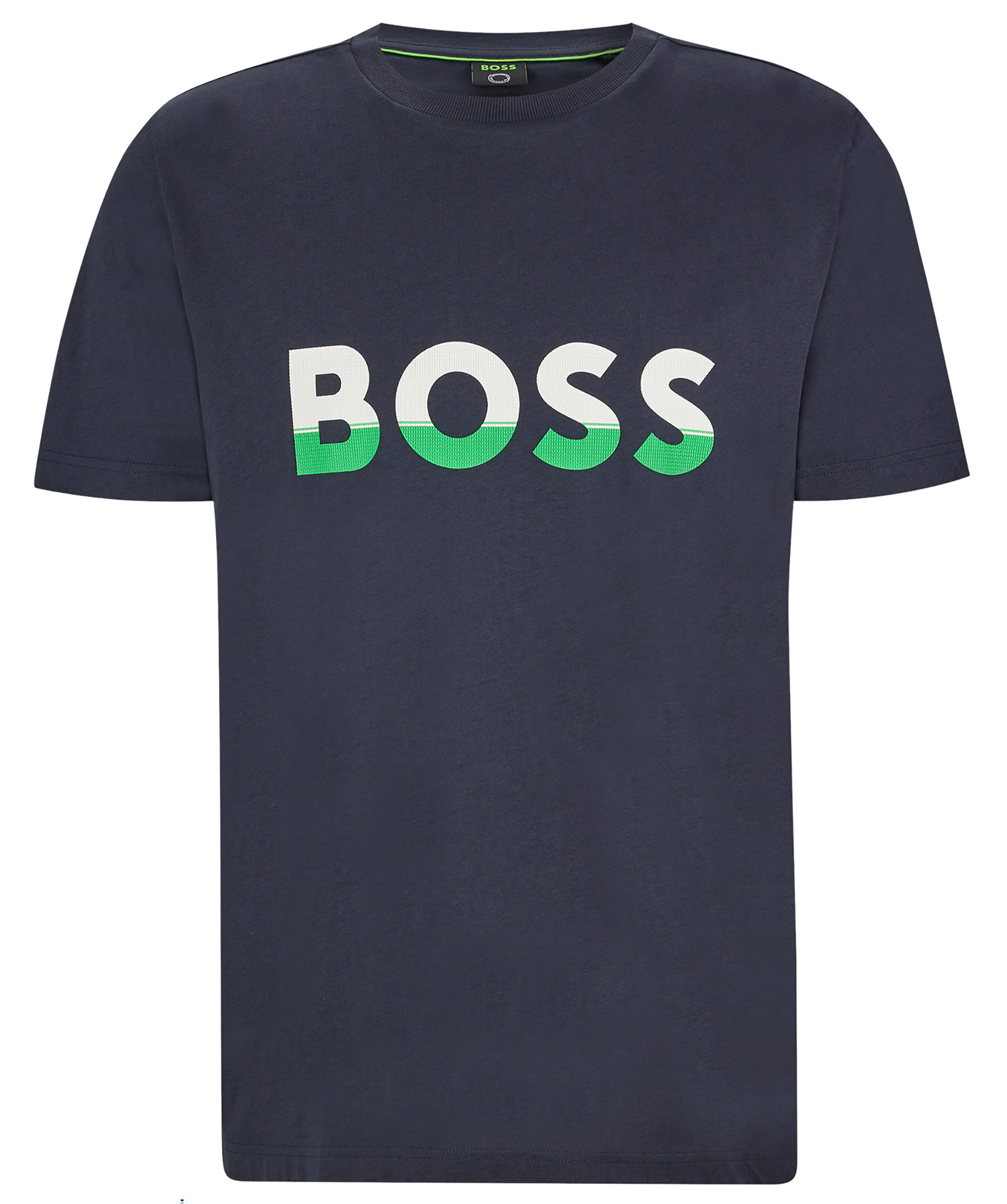 Marinblå t-shirt från BOSS Green. Tryckt tvåfärgad logotyp i över bröstet. Rundad halsringning. Tillverkad i bomull.