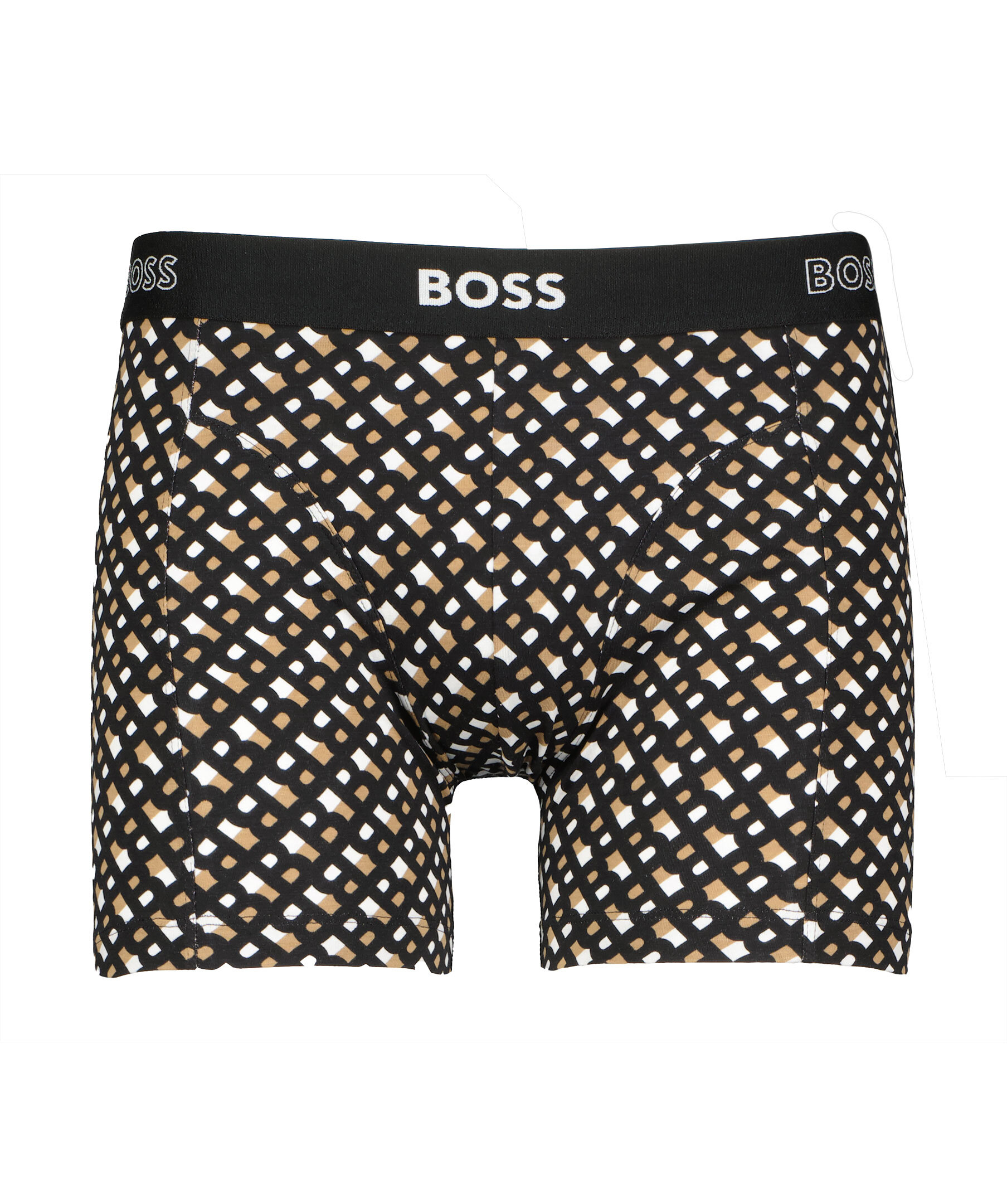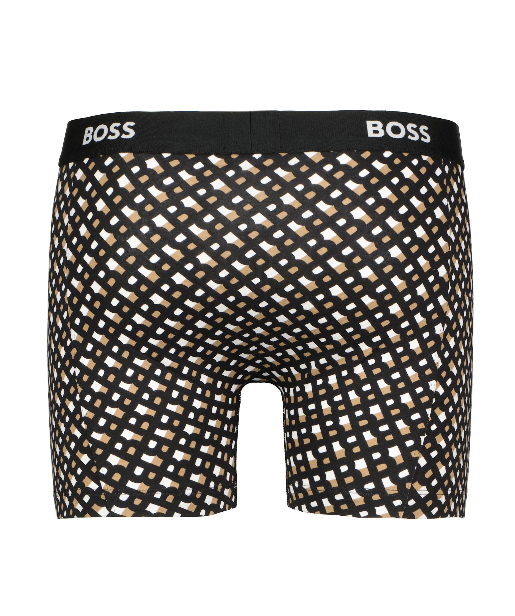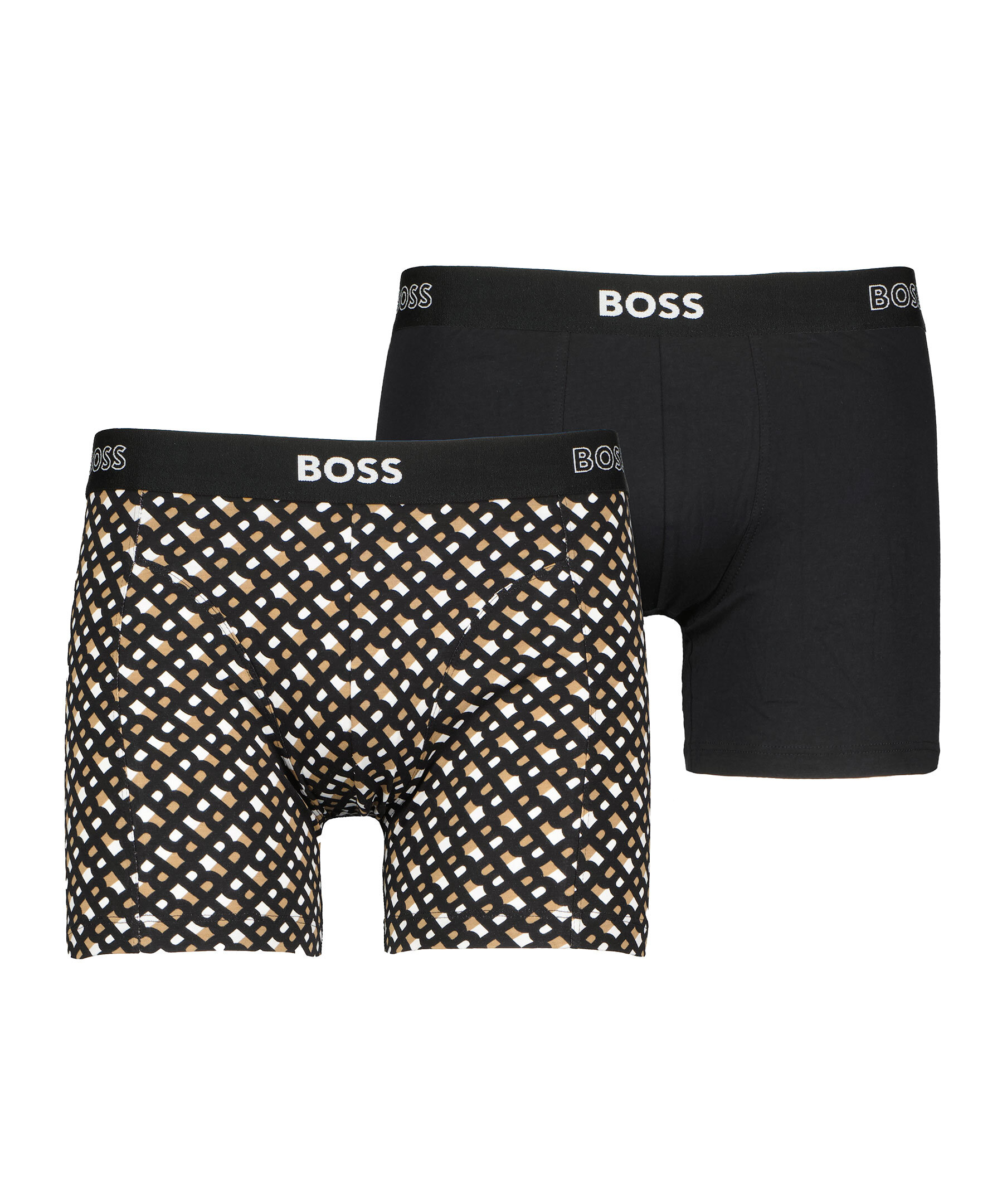 2-pack kalsonger från BOSS Black. en kalsong är svart och en har ett monogrammönster från BOSS Black i svart, beige och vitt. Svart resår i midjan med vita logotyper på. Tillverkade i stretchig bomull.