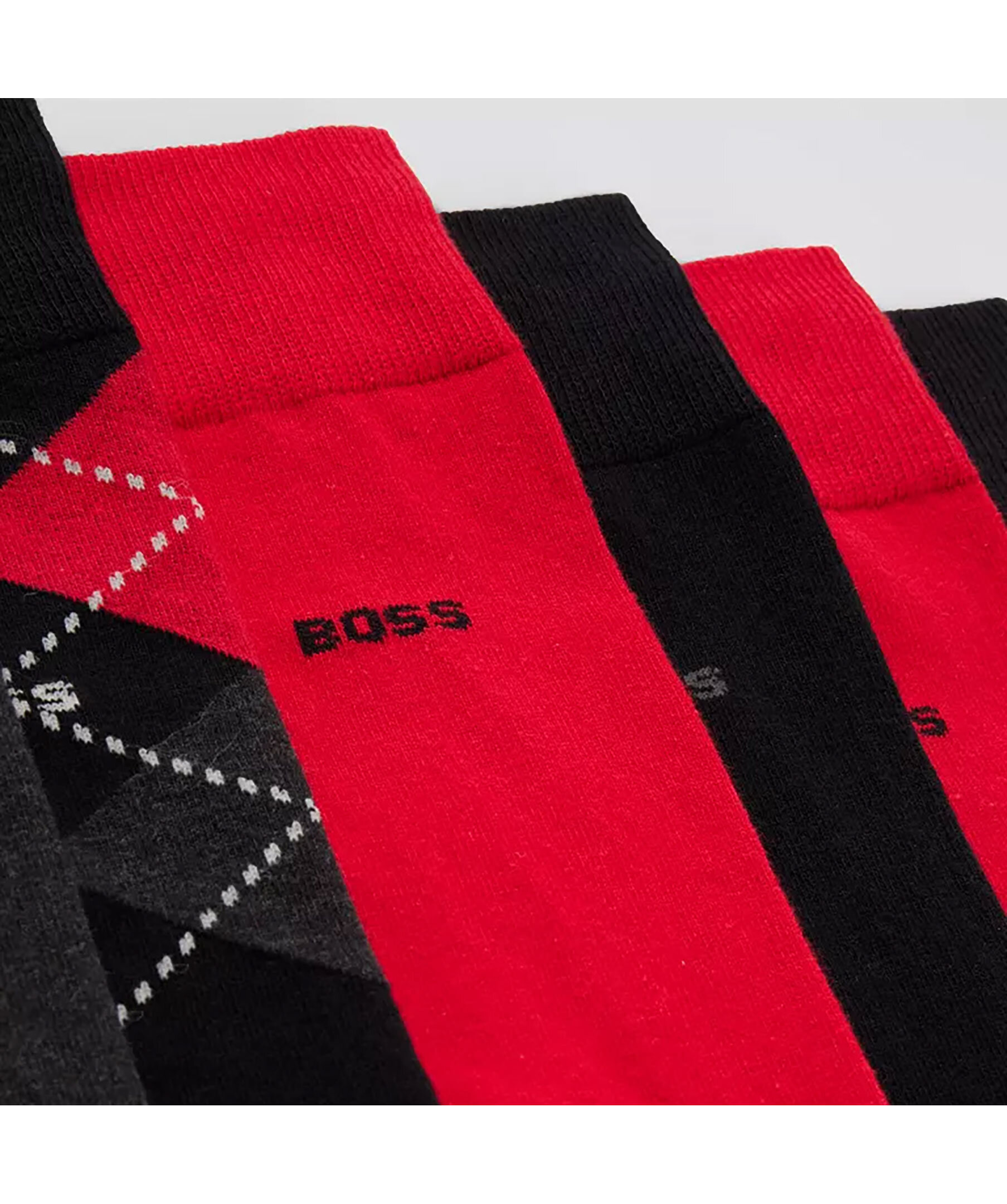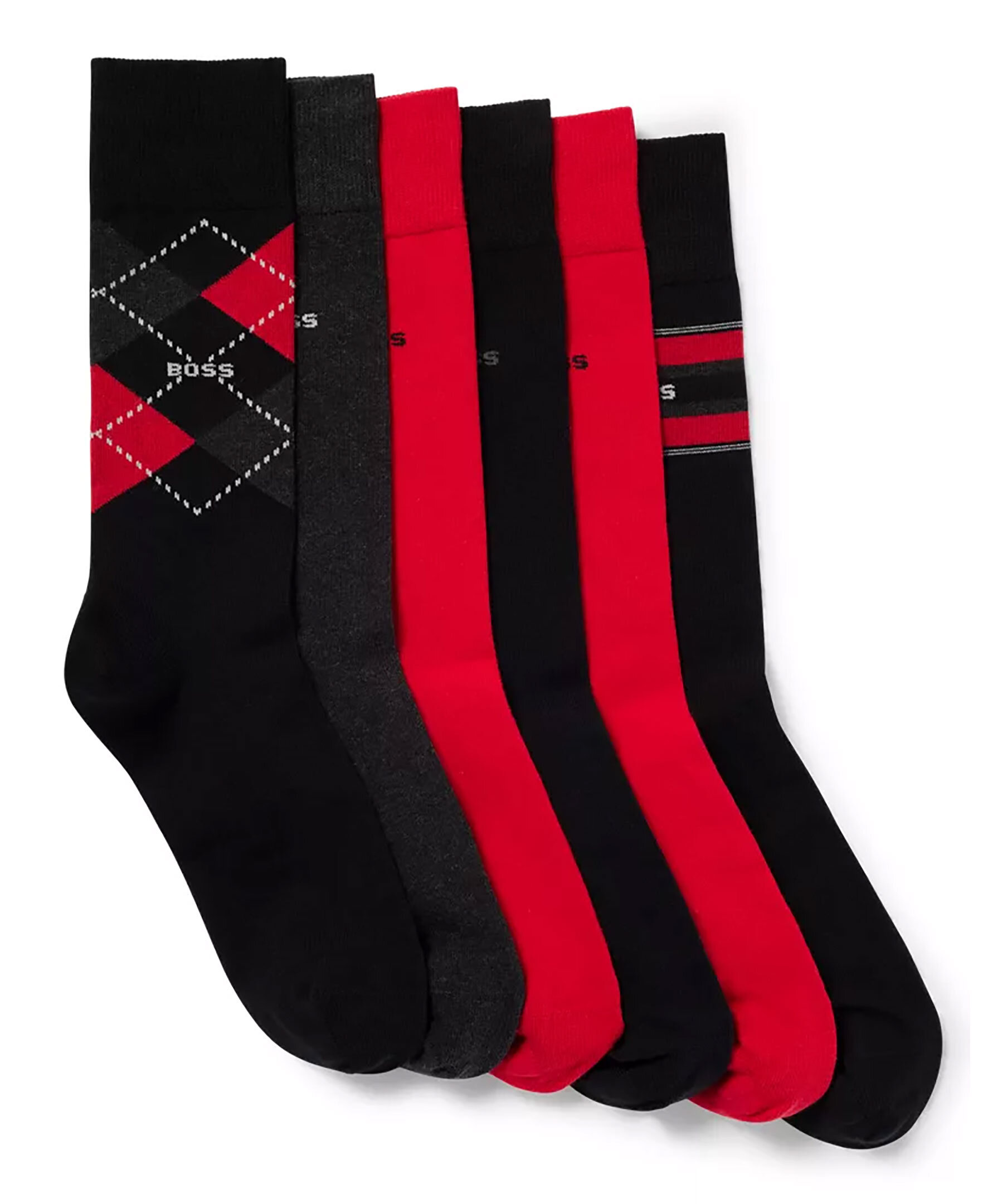 6-pack med strumpor i olika färger och mönster från BOSS black. Finns i färgerna röd, svart och grå. Strumporna presenteras i en present låda. Ribbad mudd i topp. Liten broderad logotyp vid resåren.