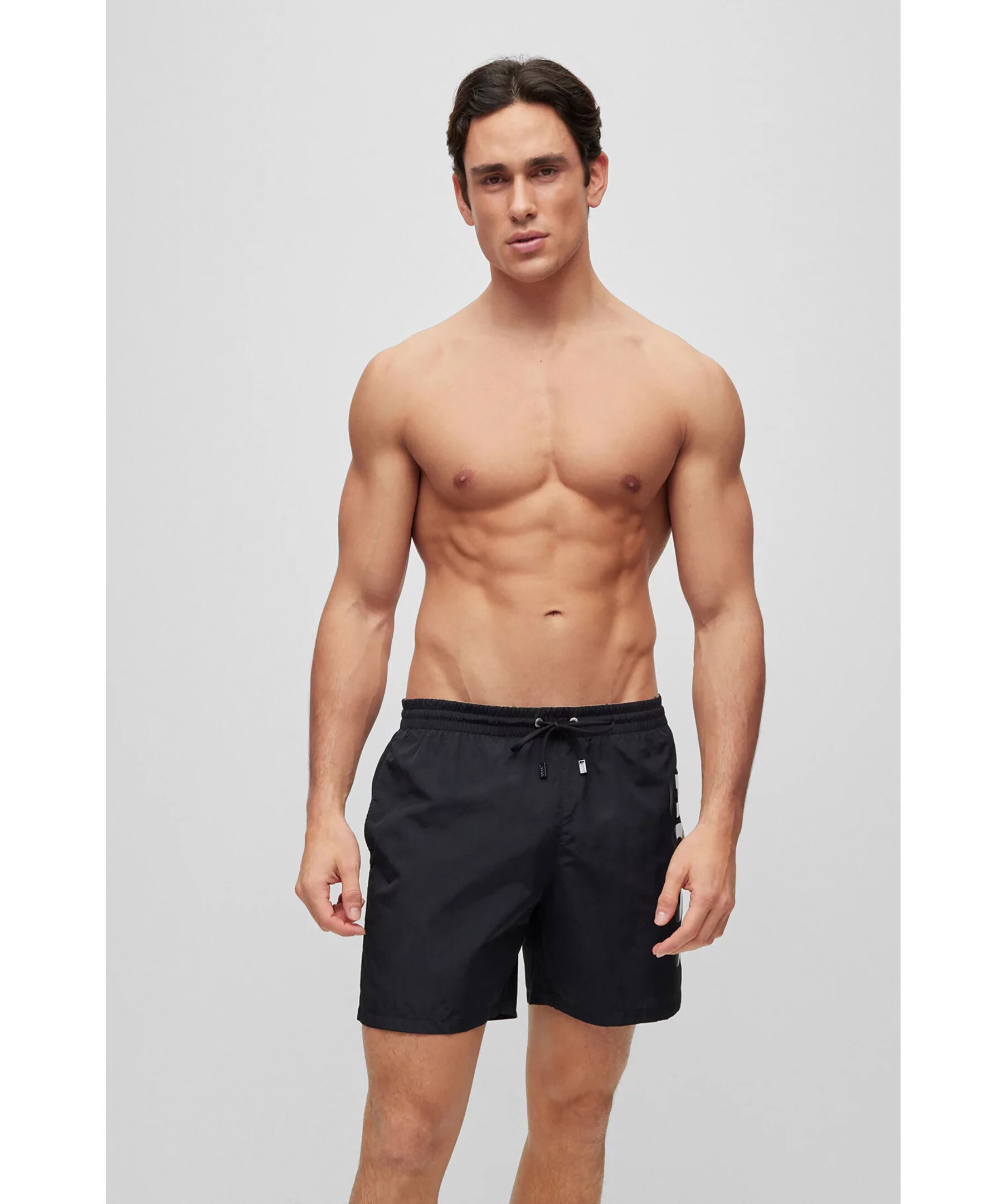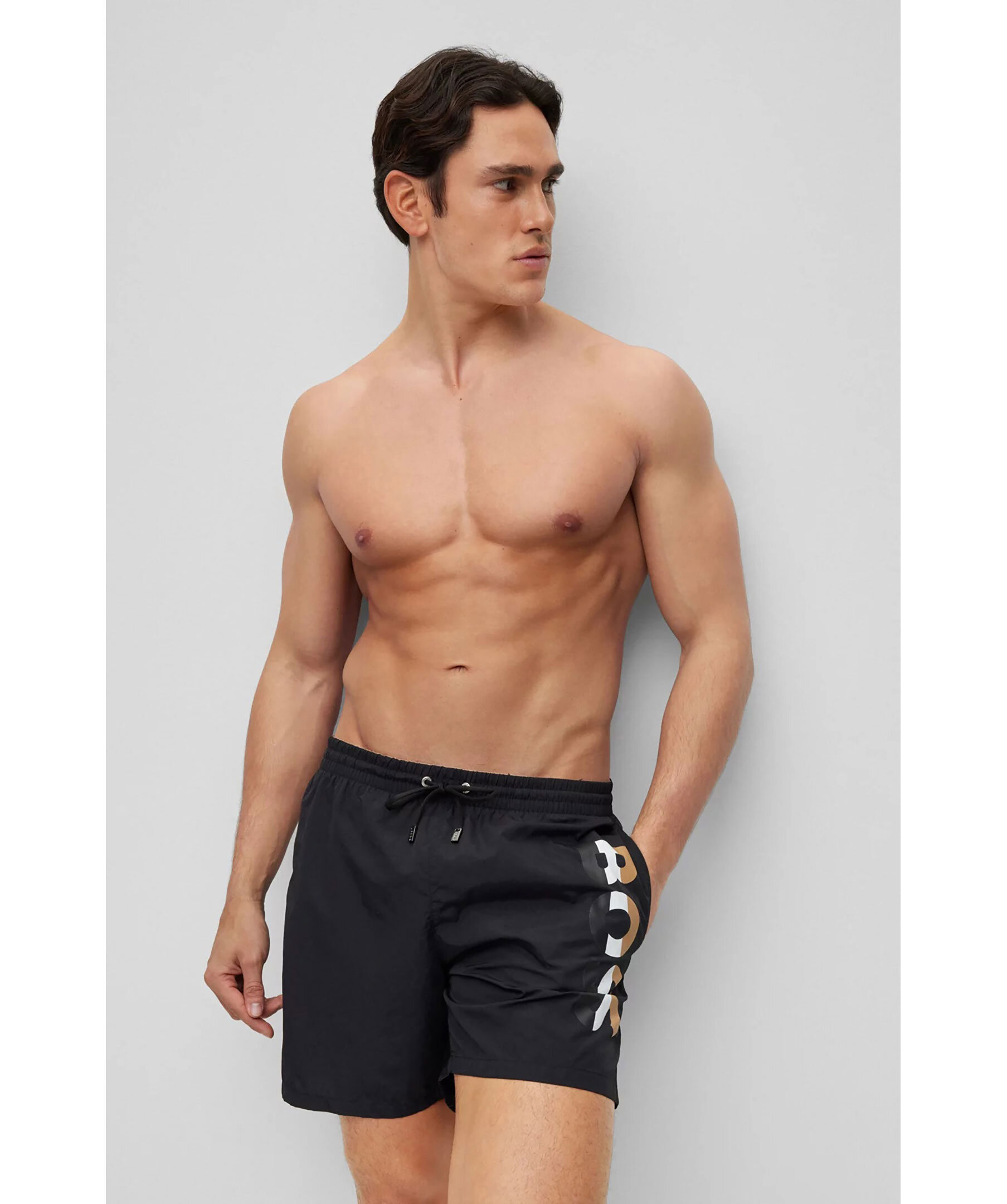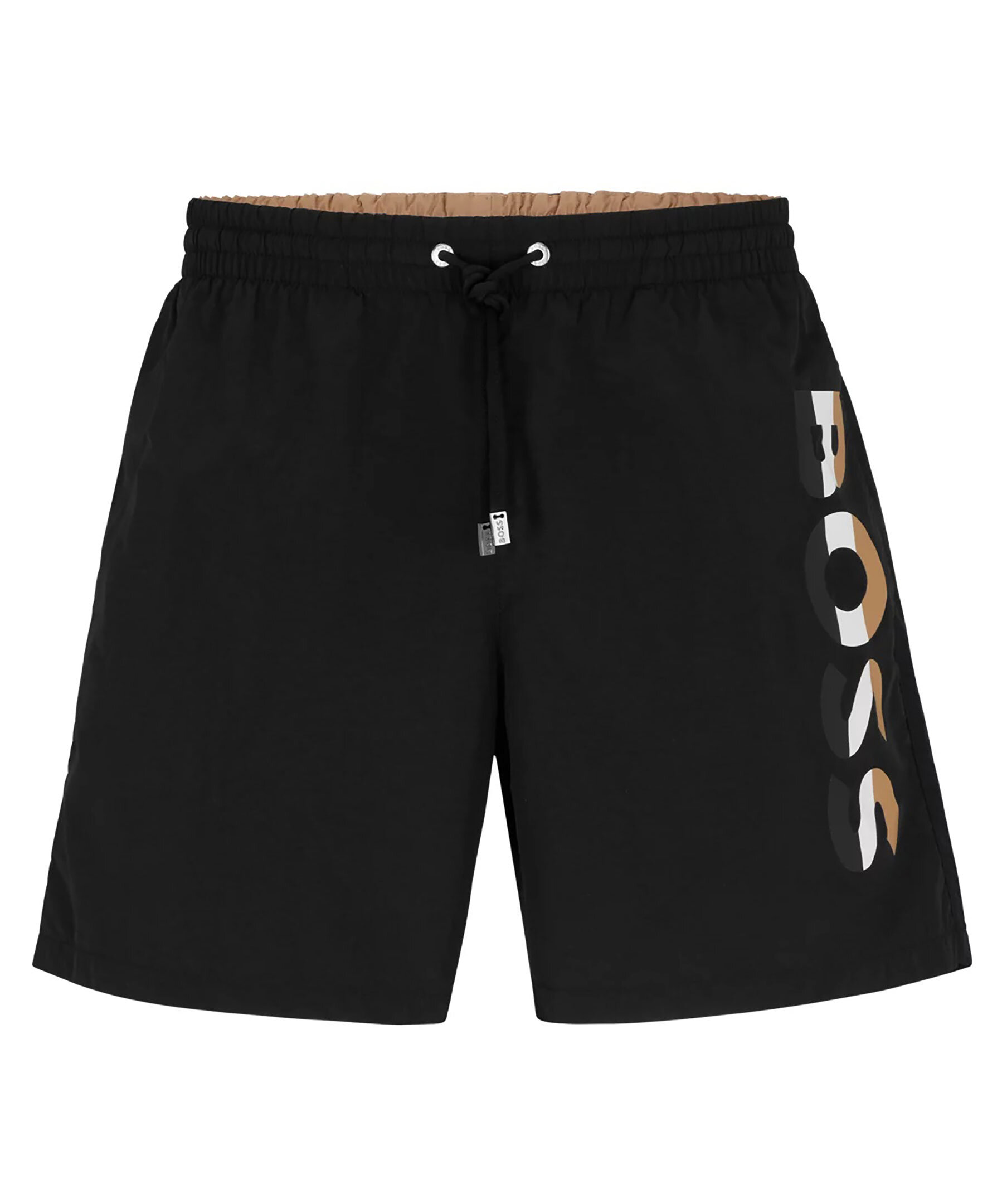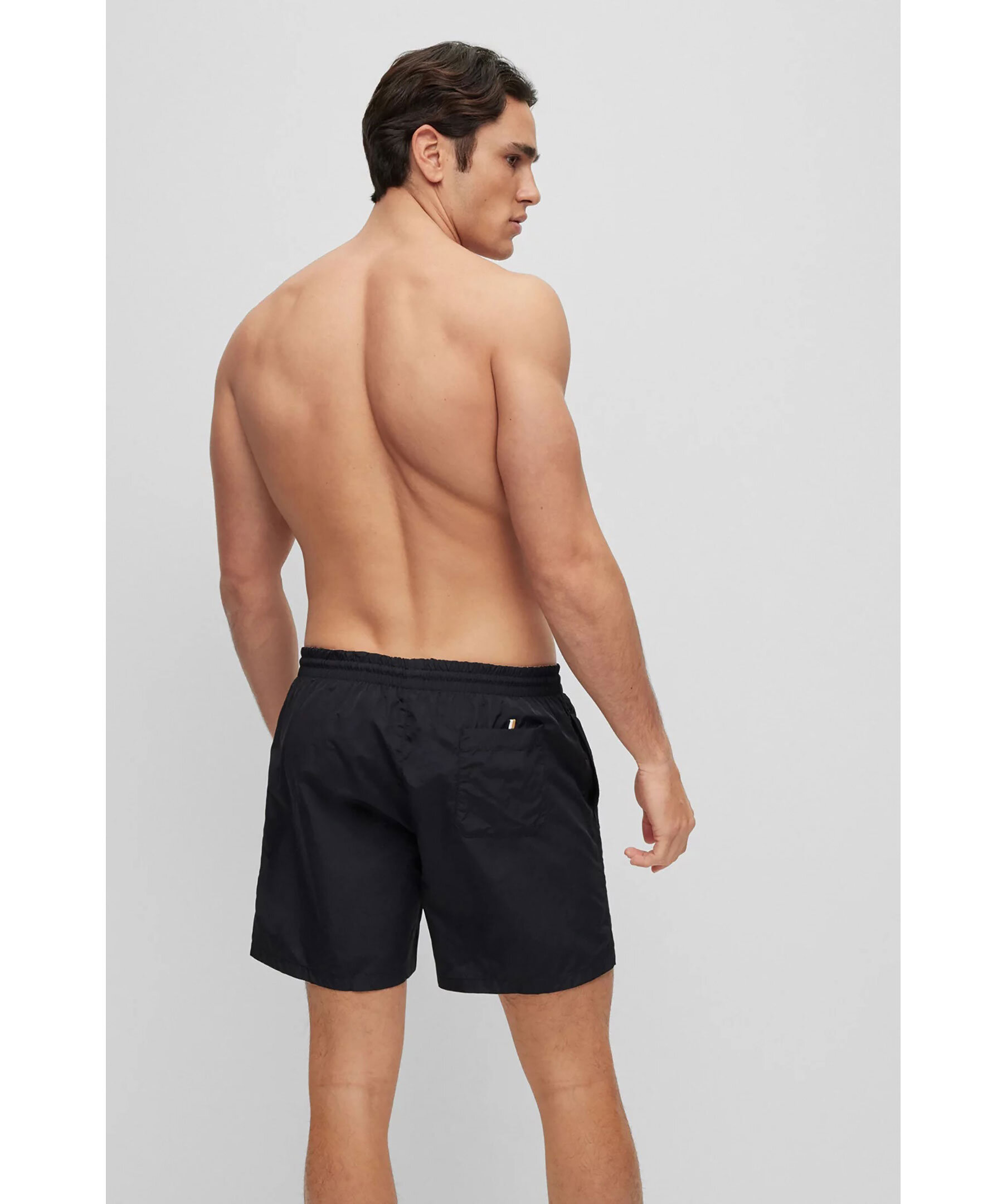 Svarta badshorts från BOSS BLACK. Dragsko och resår i midjan. Tryckt logotyp på vänster lår i guld, vitt och svart. Två fickor framtill, en bakficka som stängs med kardborre.