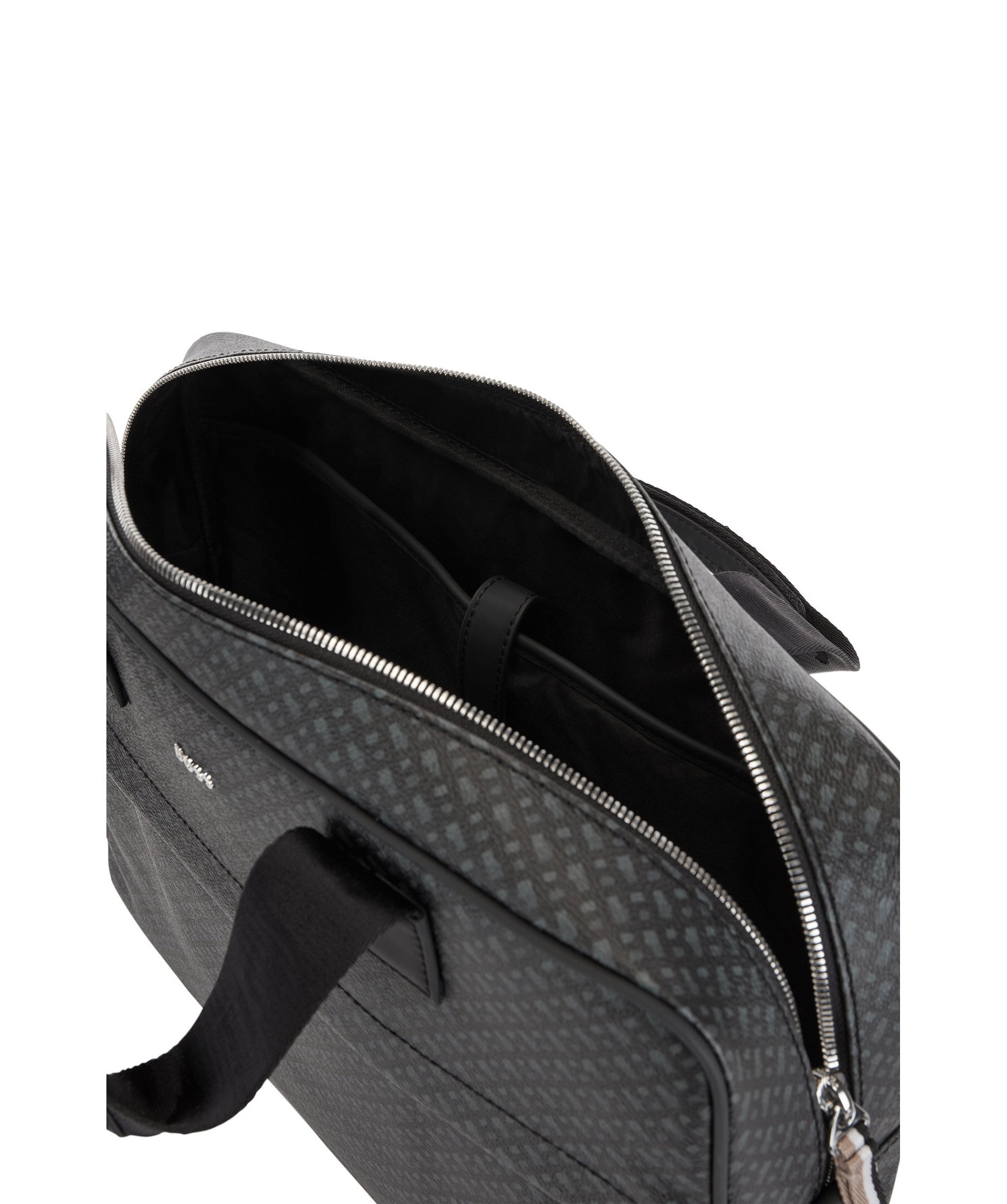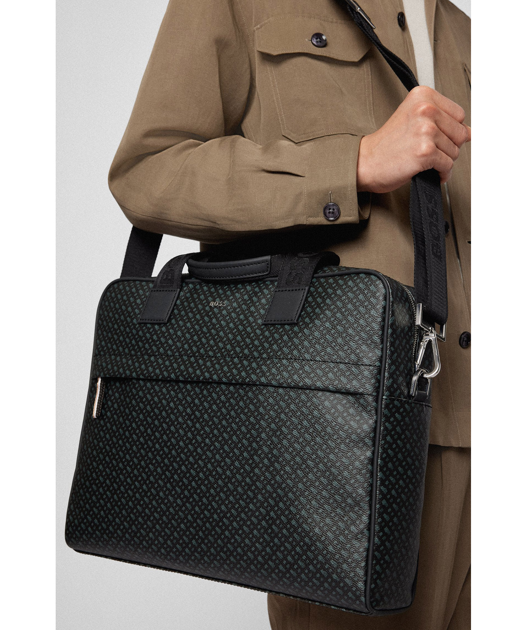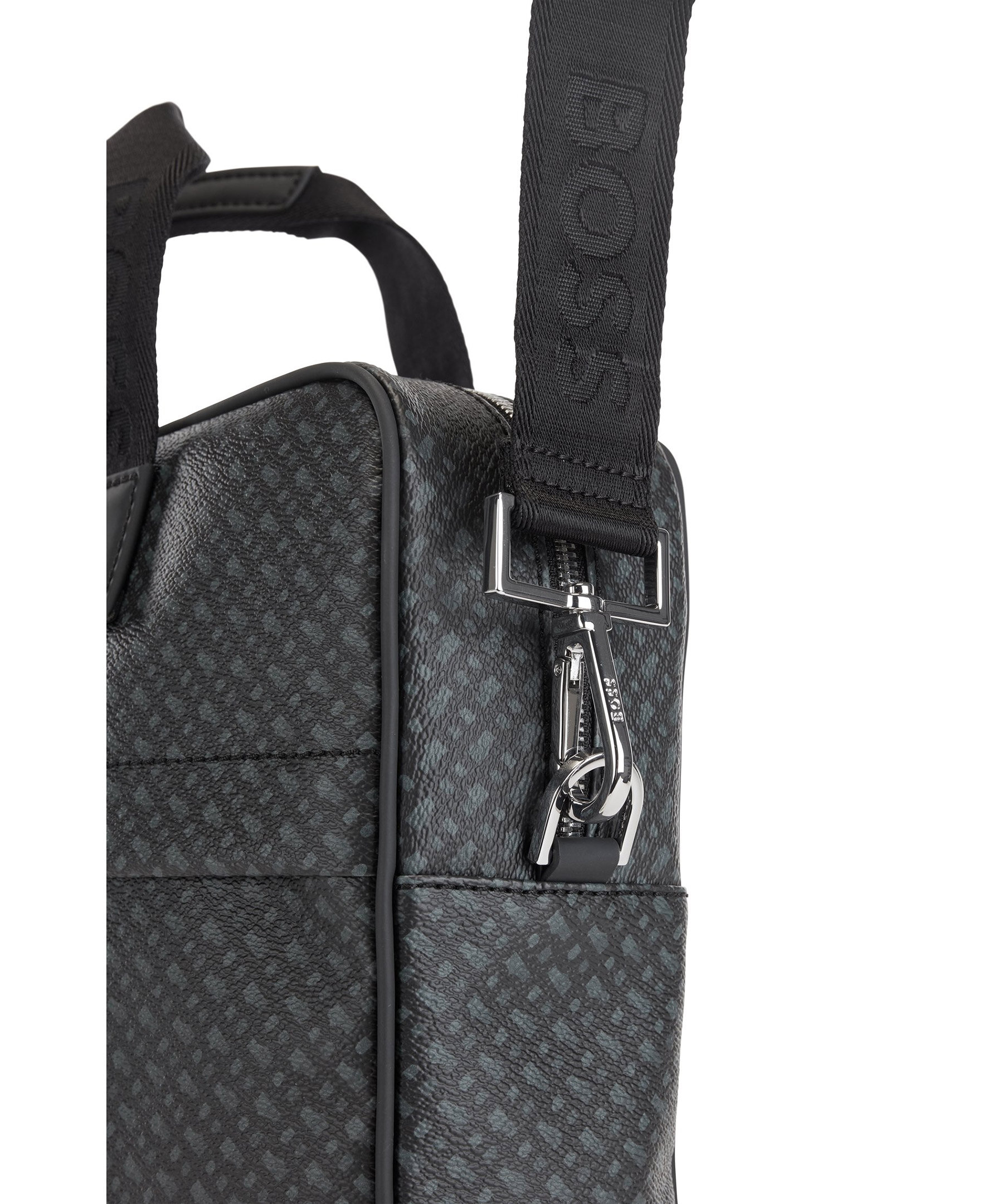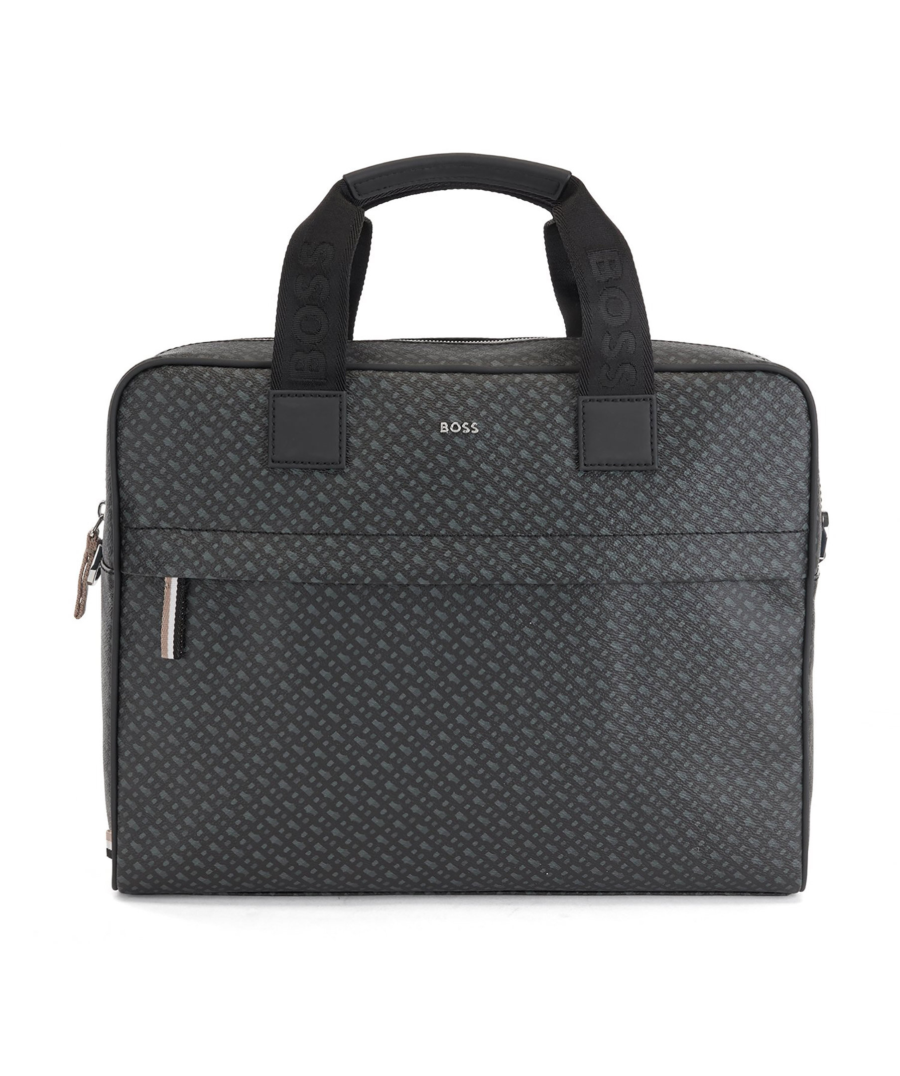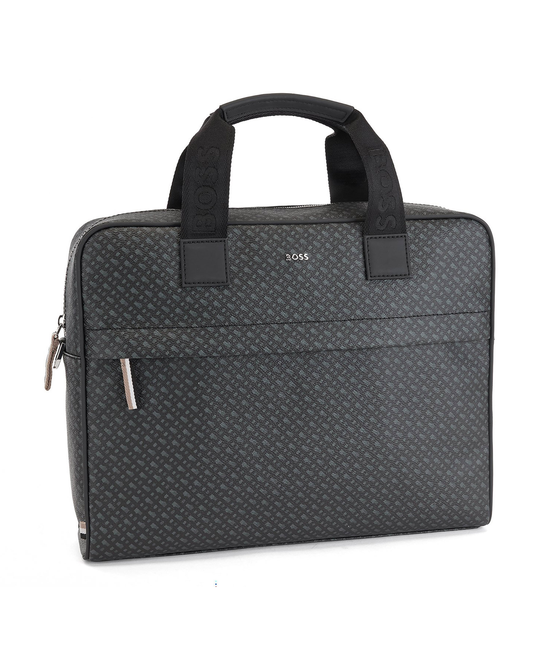 Svart, mönstrad datorväska i läderimitation från BOSS. Inre datorficka och smart ficka på baksidan så att väskan enkelt kan fästas på ett rullväskhandtag. Monogramtryck och justerbar, avtagbar axelrem med BOSS-märkning. Ficka med dragkedja med signaturränder fram och liten silverfärgad logotyp i metall fram. Dubbelhandtag och stängning med dragkedja upptill. Mått: 30 x 39 x 9 cm.
