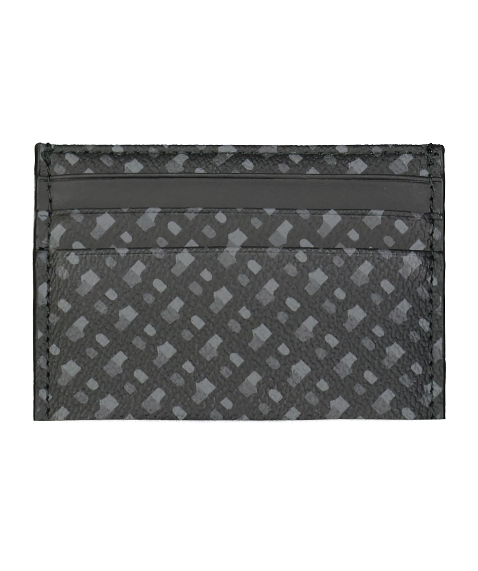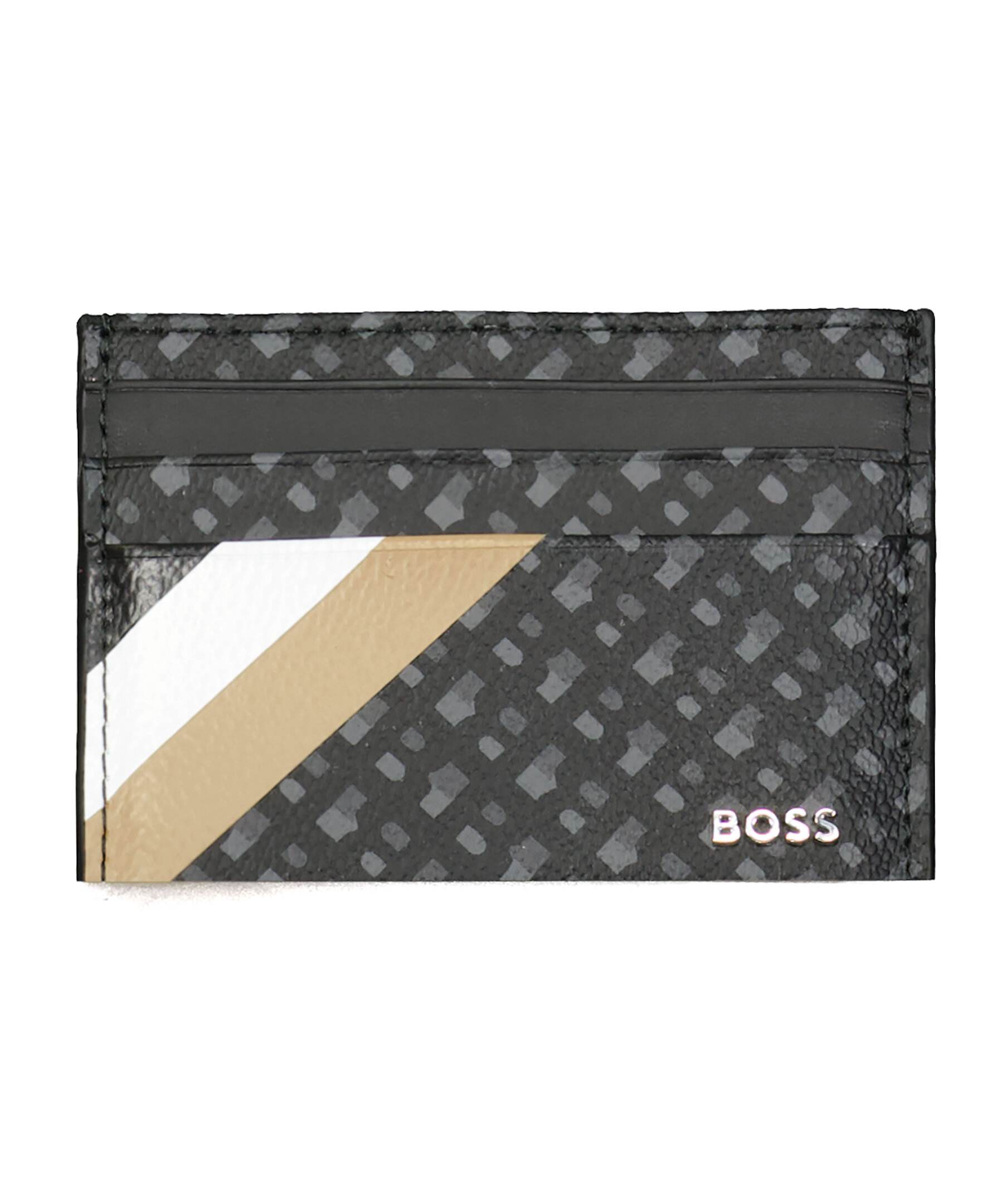Svart, mönstrad korthållare från BOSS. Upprepande monogram som mönster, tre diagonala streck i svart, brun och vitt framtill samt logga i polerat silver fram. 1 öppen innerficka och 4 fack för kreditkort.