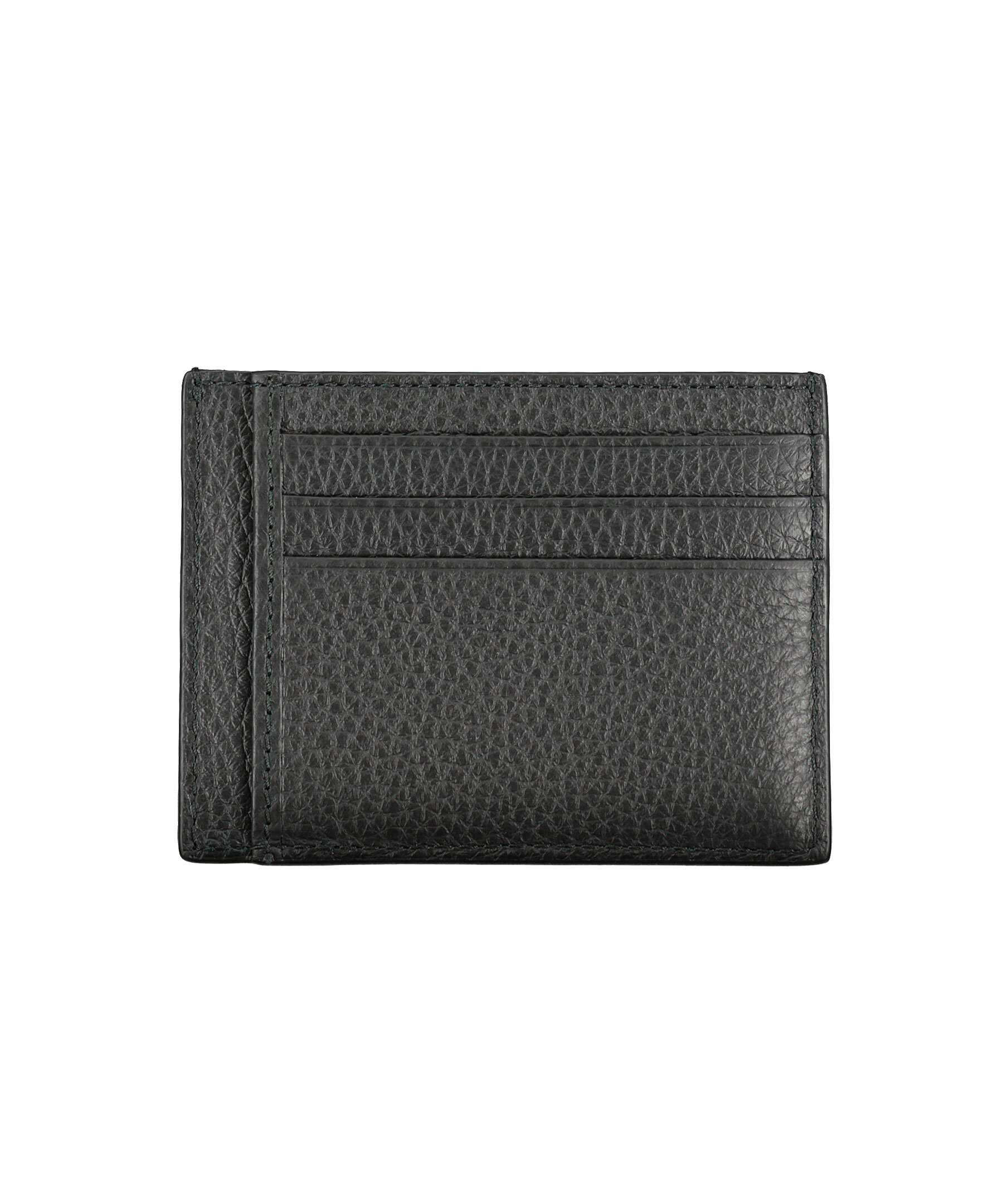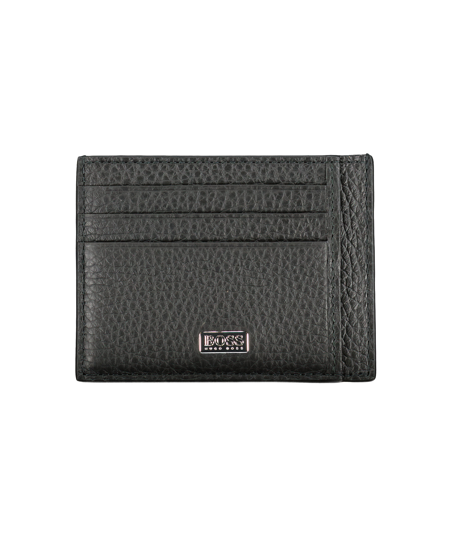 Svart korthållare mönstrat läder från Hugo Boss. Liten ruta i silverfärgat stål med logotyp på framsidan. Plats för tre kontokort på varje sida samt mittenfack och ett sidofack på varje sida. Korthållaren är fodrad med ett RFID skydd. Mått: 0,5 x 8 x 11 cm.