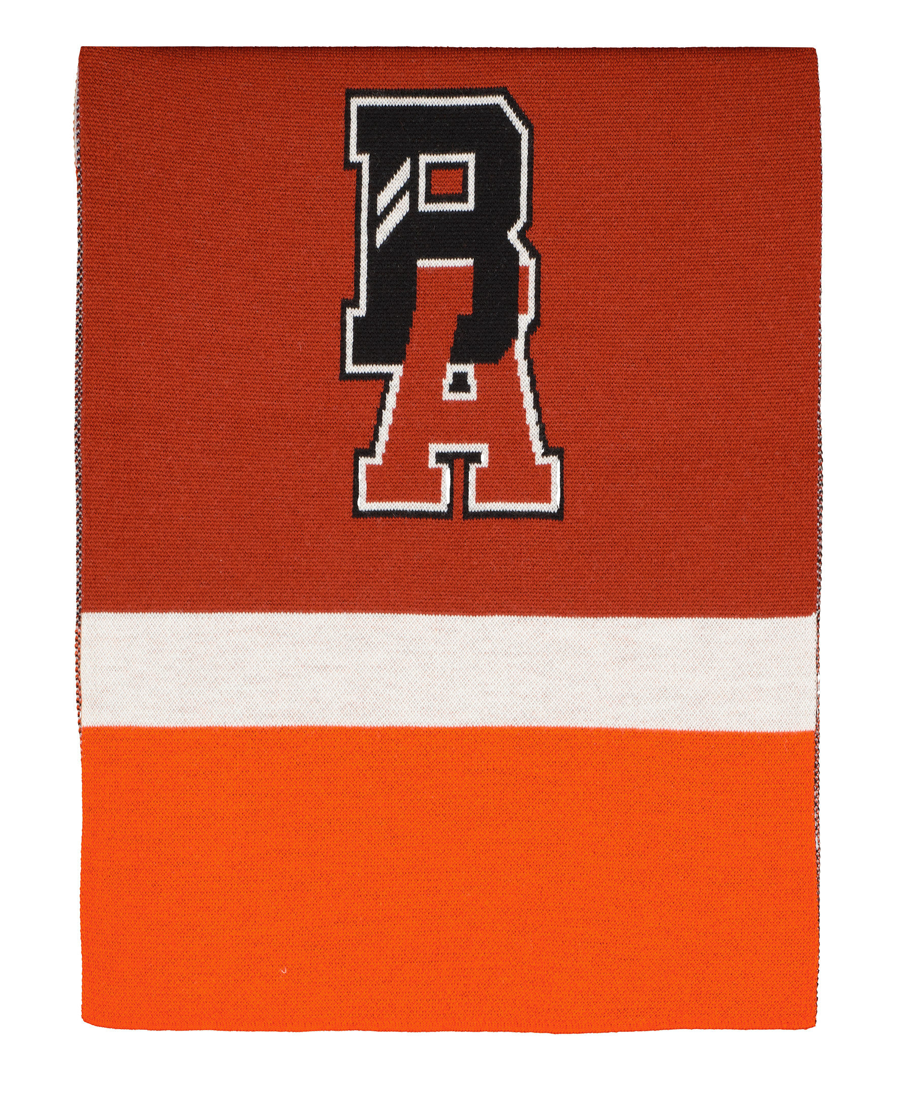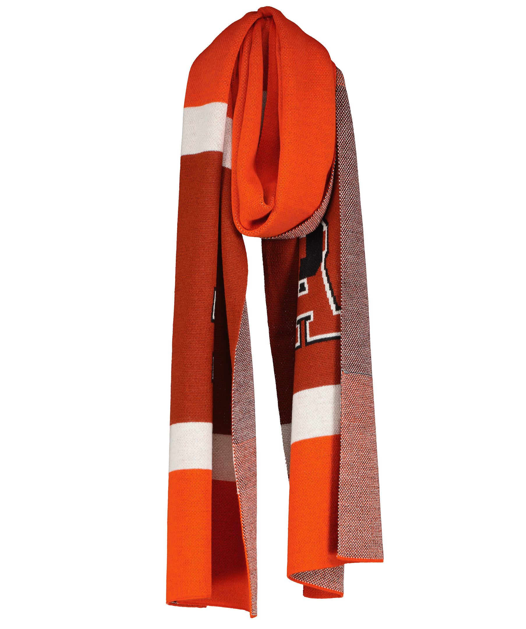 Bred, randig halsduk i ullmix från BOSS x Russell Athletic. Breda ränder i rött, vitt och rost och stor logotyp på ena sidan, småstickat mönster på andra sidan.