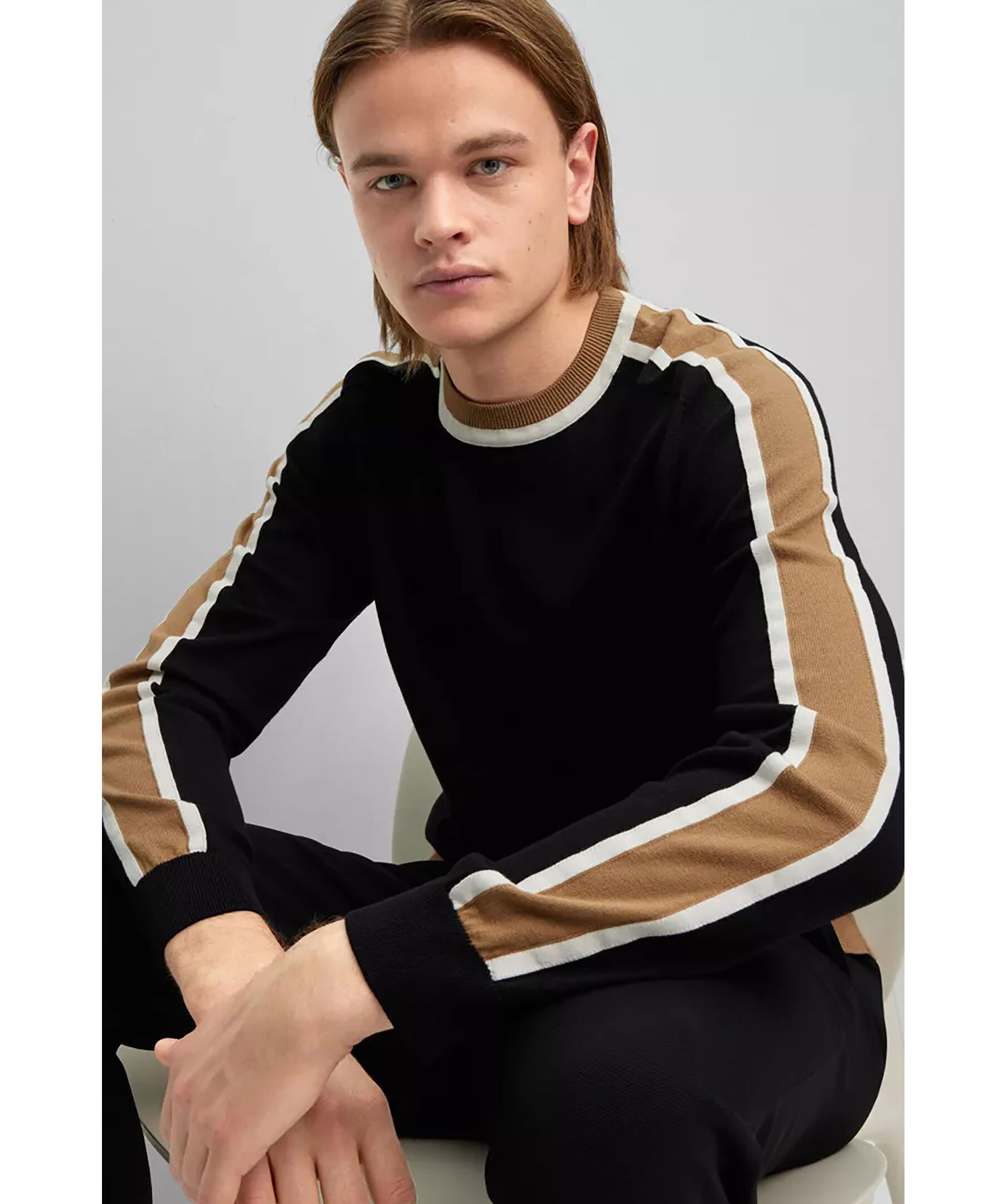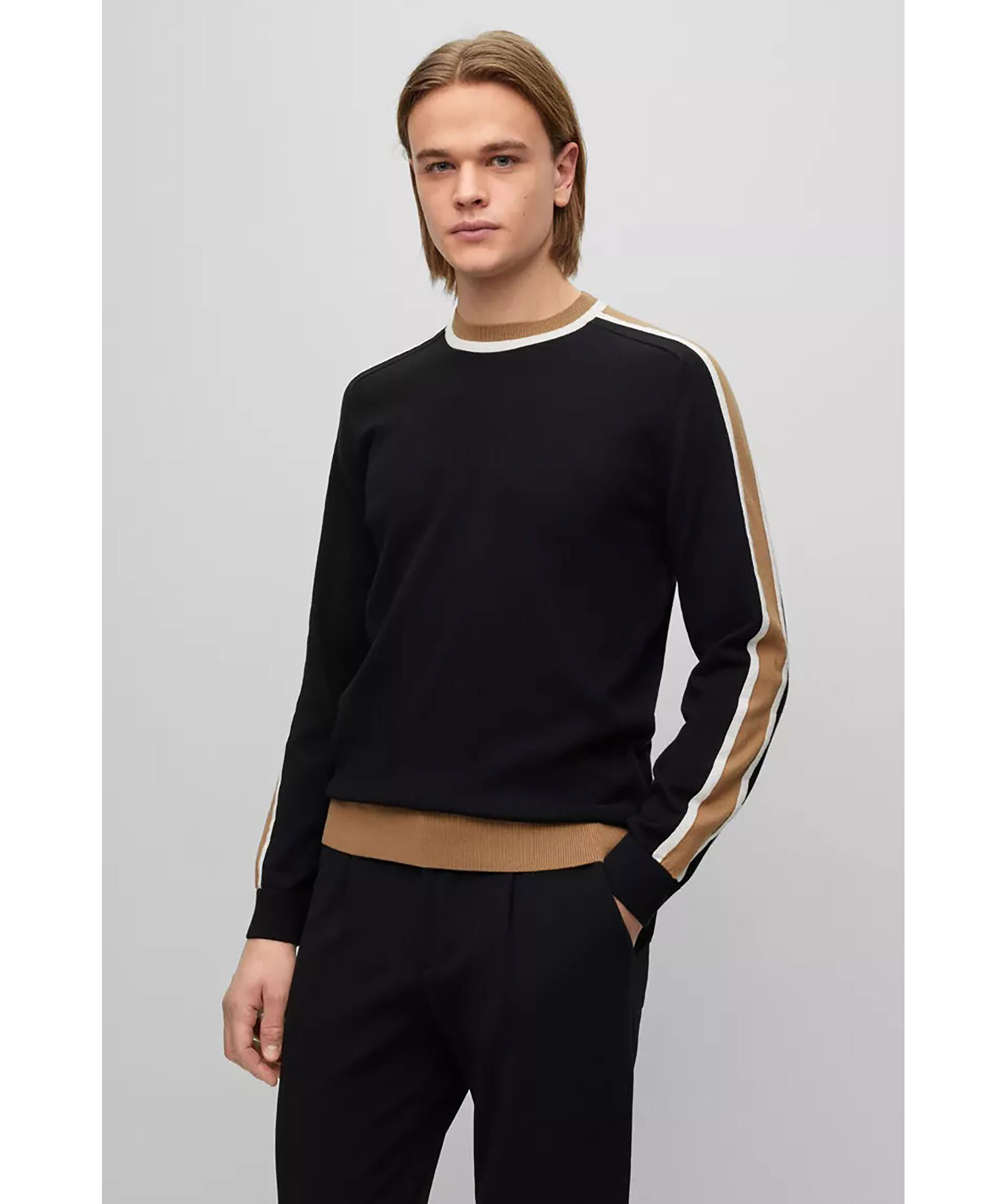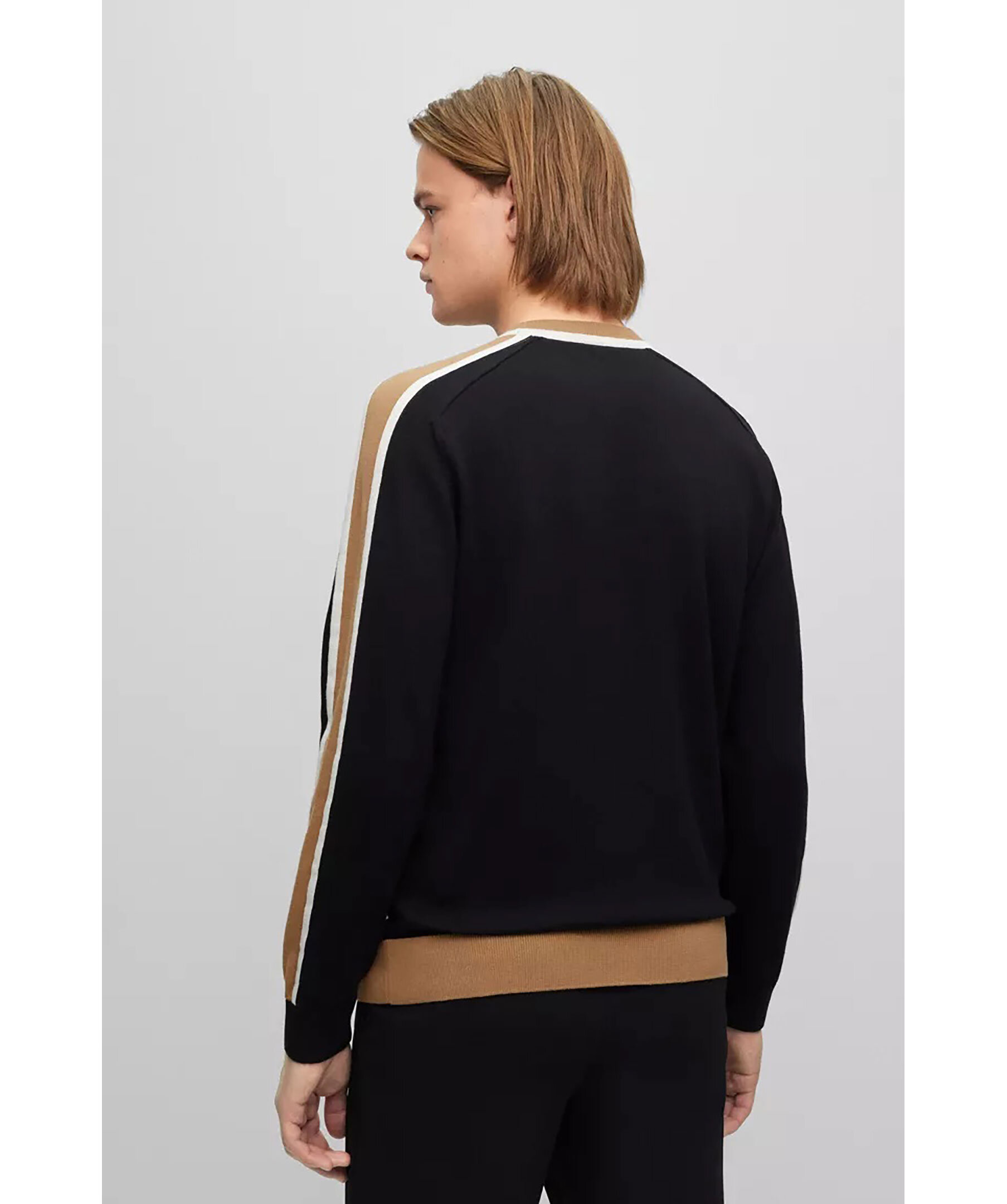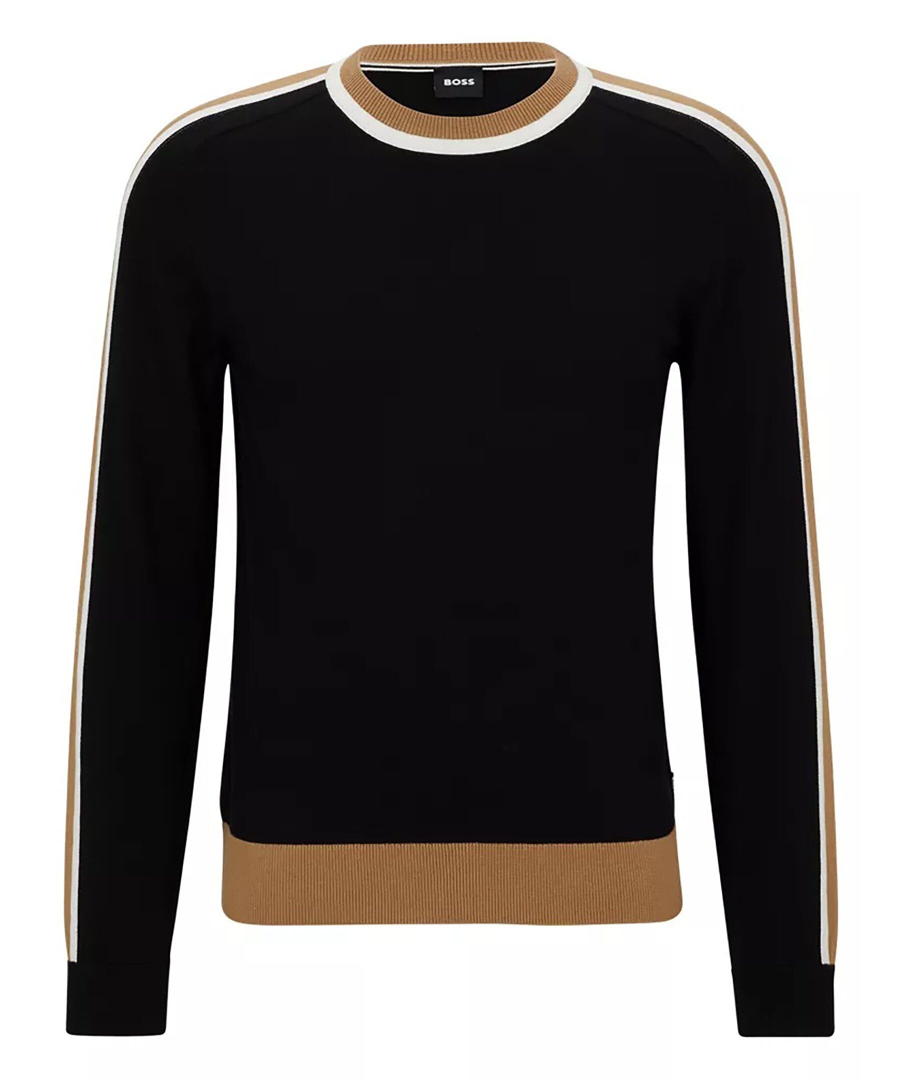 Svart finstickad sweatshirt från BOSS Black. Tröjan är gjord i tunt bomull och har en normal passform med ribbstickade muddar. Blockfärgad revär i beige och vitt längst ärmarna. Modellen är 189 cm lång och har storlek L.