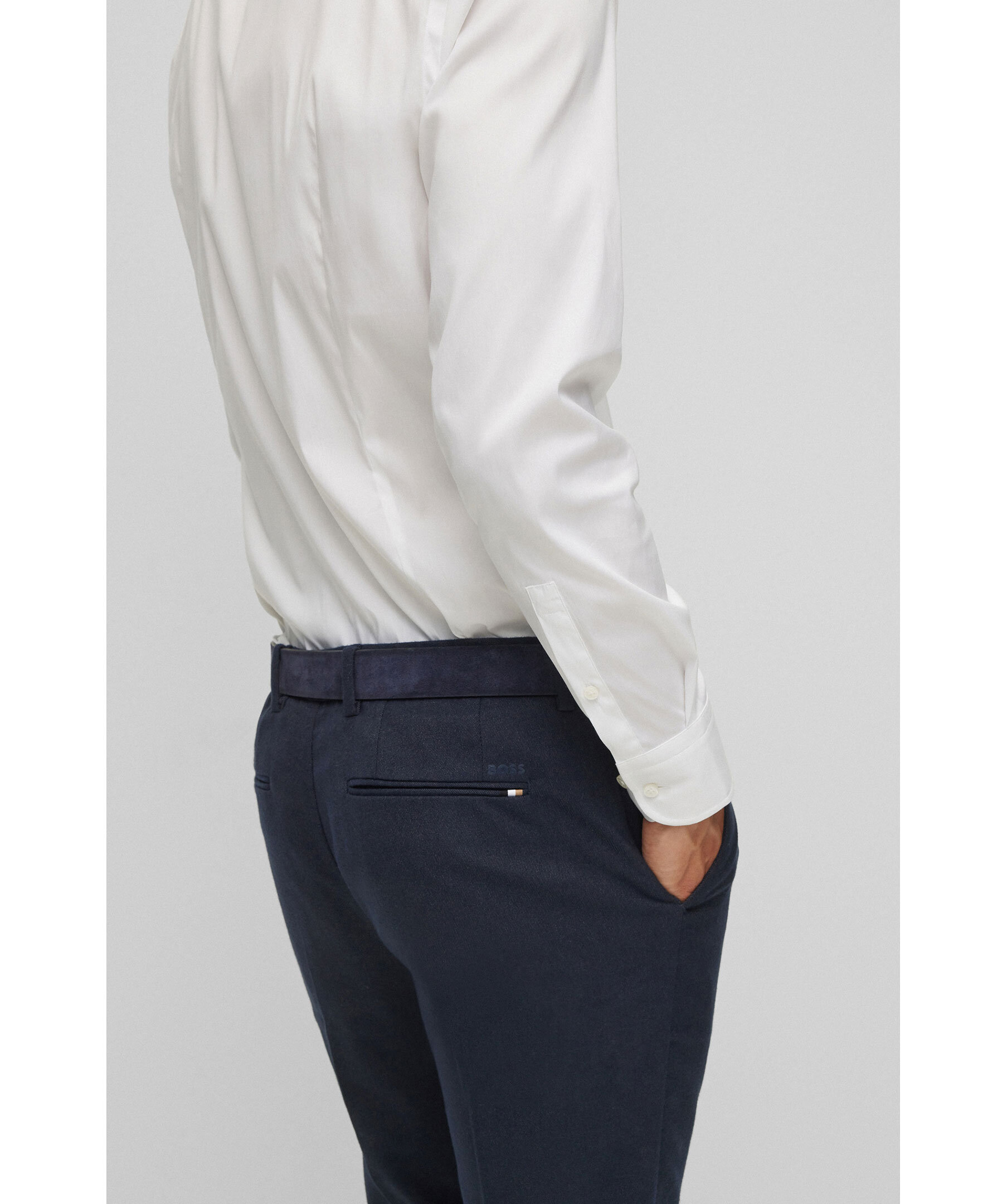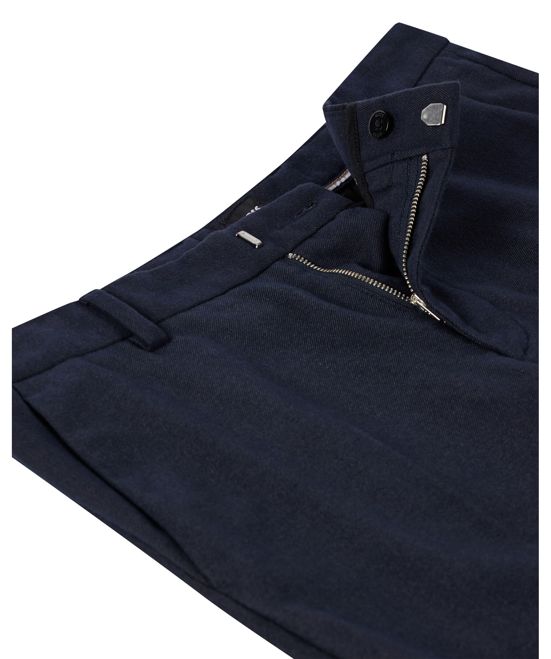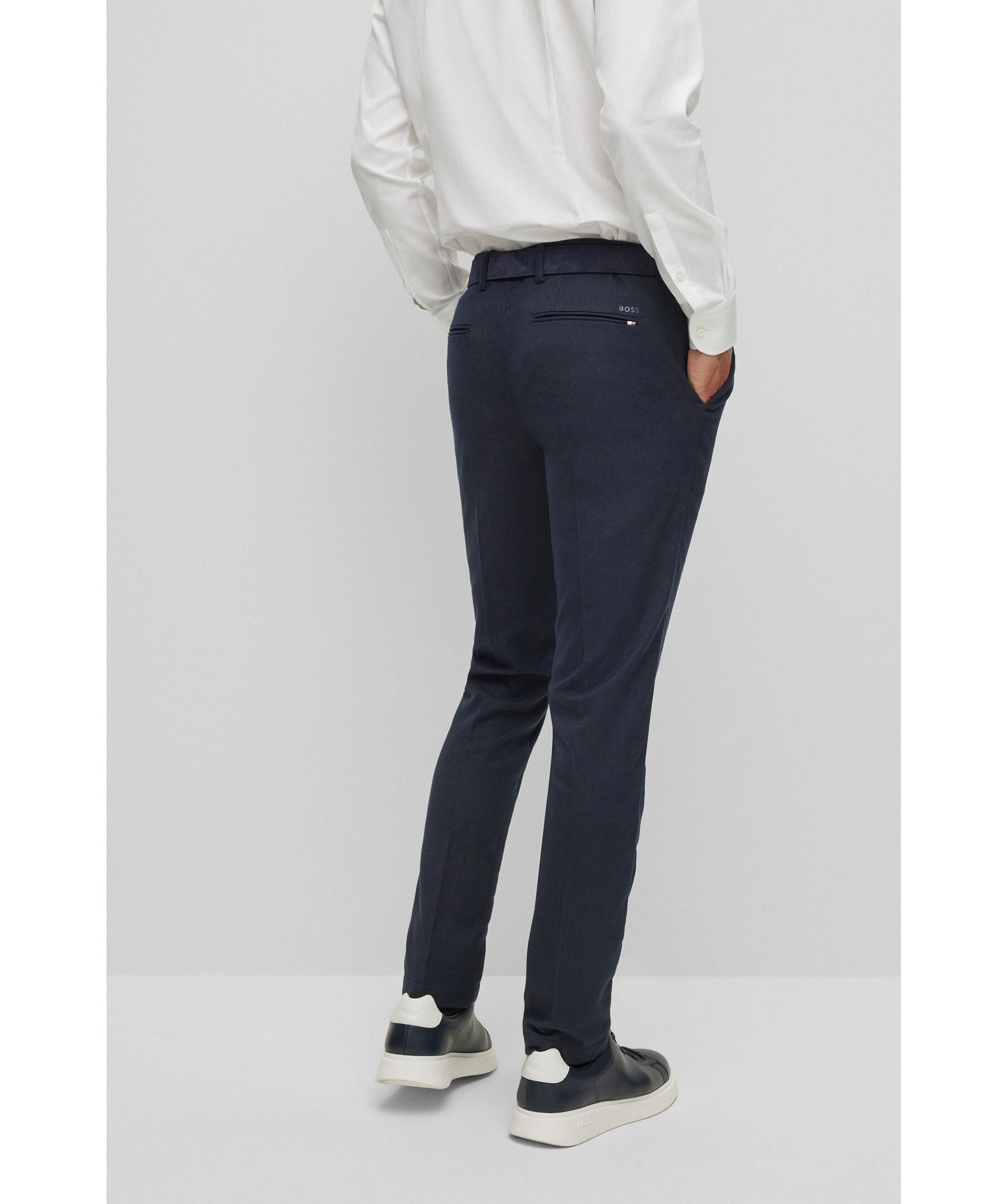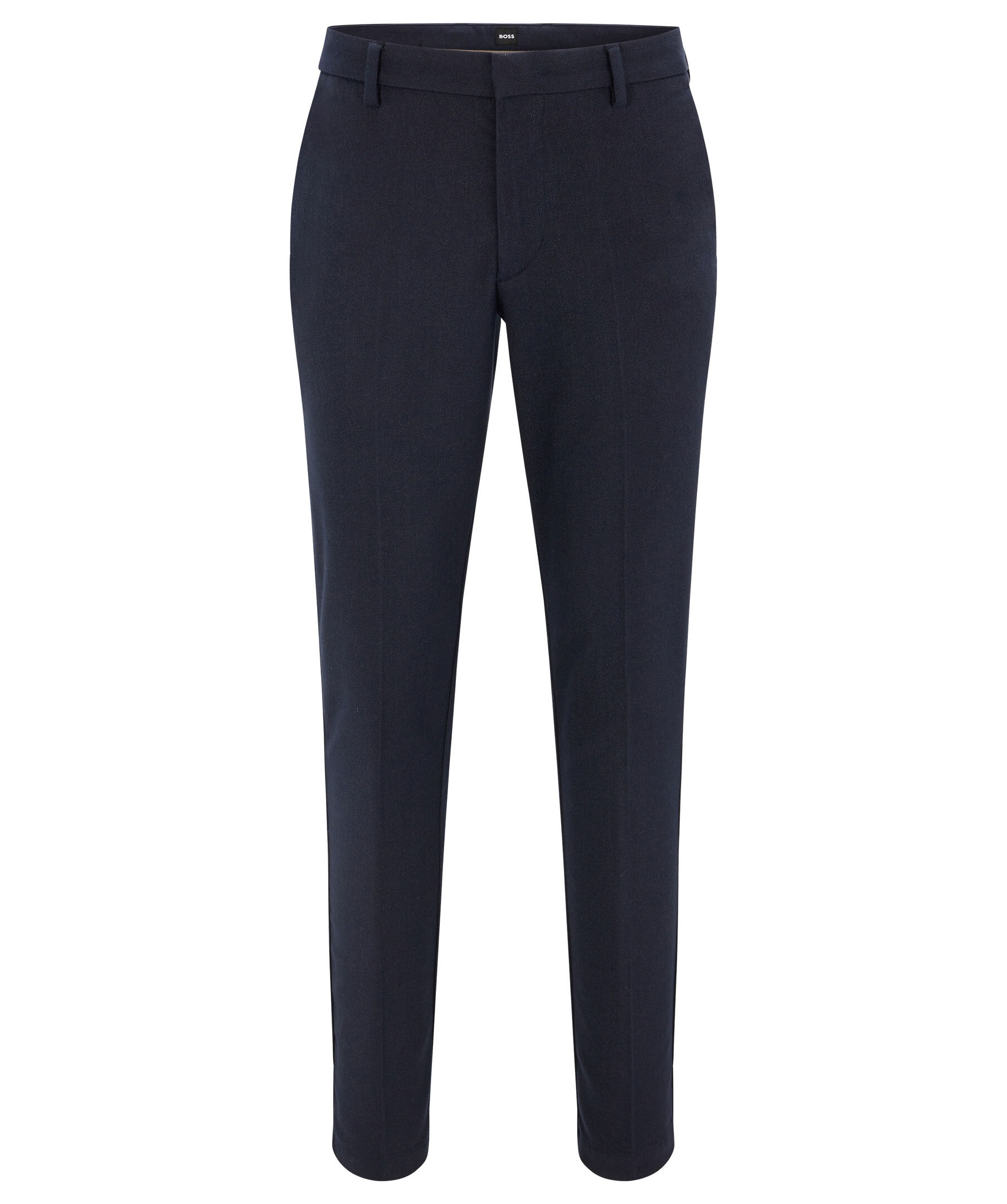 Marinblå kostymbyxor i slim fit modell från Hugo Boss Business. Fickor fram samt raka bakfickor med liten tryckt logotyp ovanför den högra fickan. Hällor för skärp och gylf med dragkedja, knapp, hake och hälla. Tillverkade i mjuk polyester ochviskos blandning.
