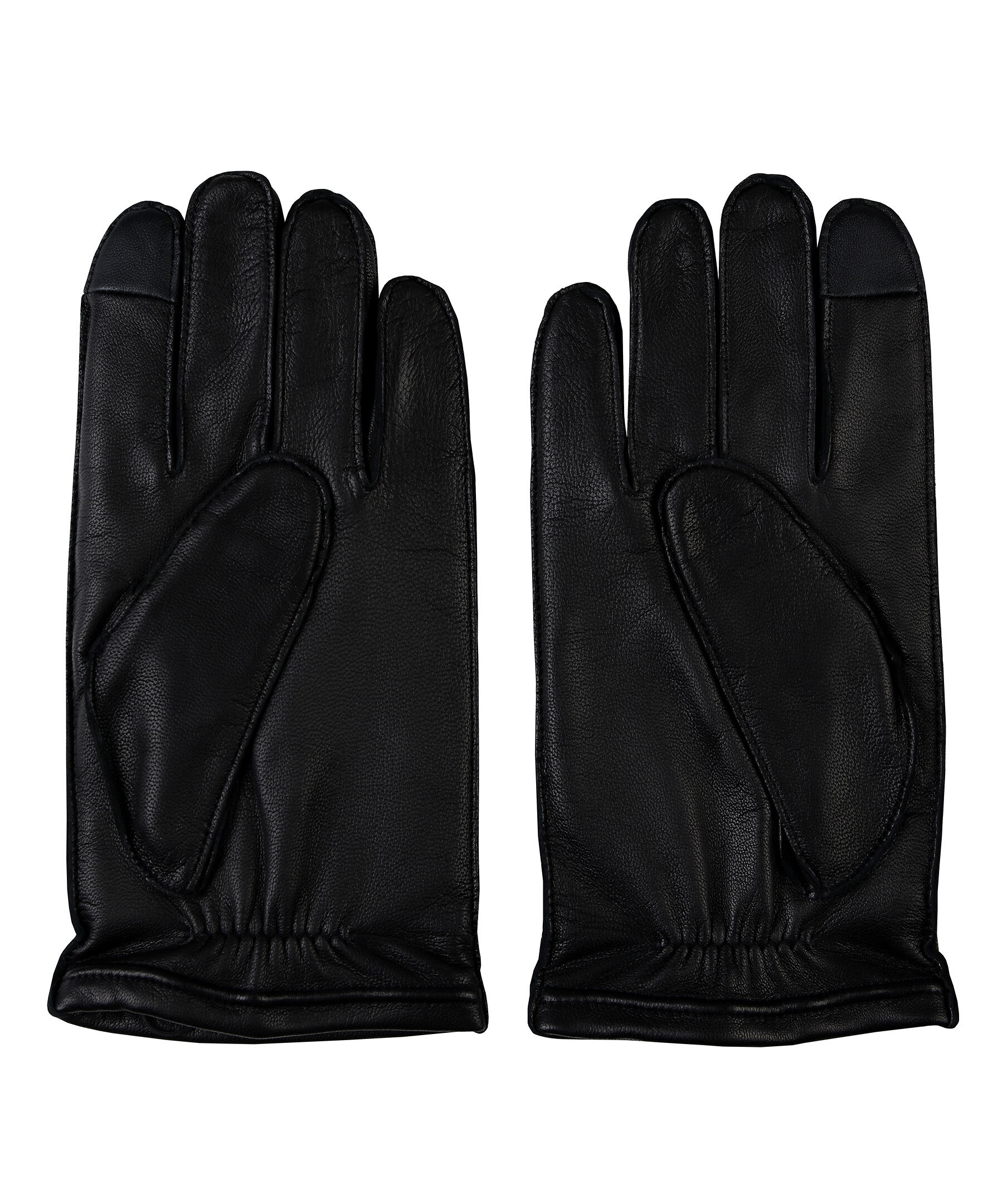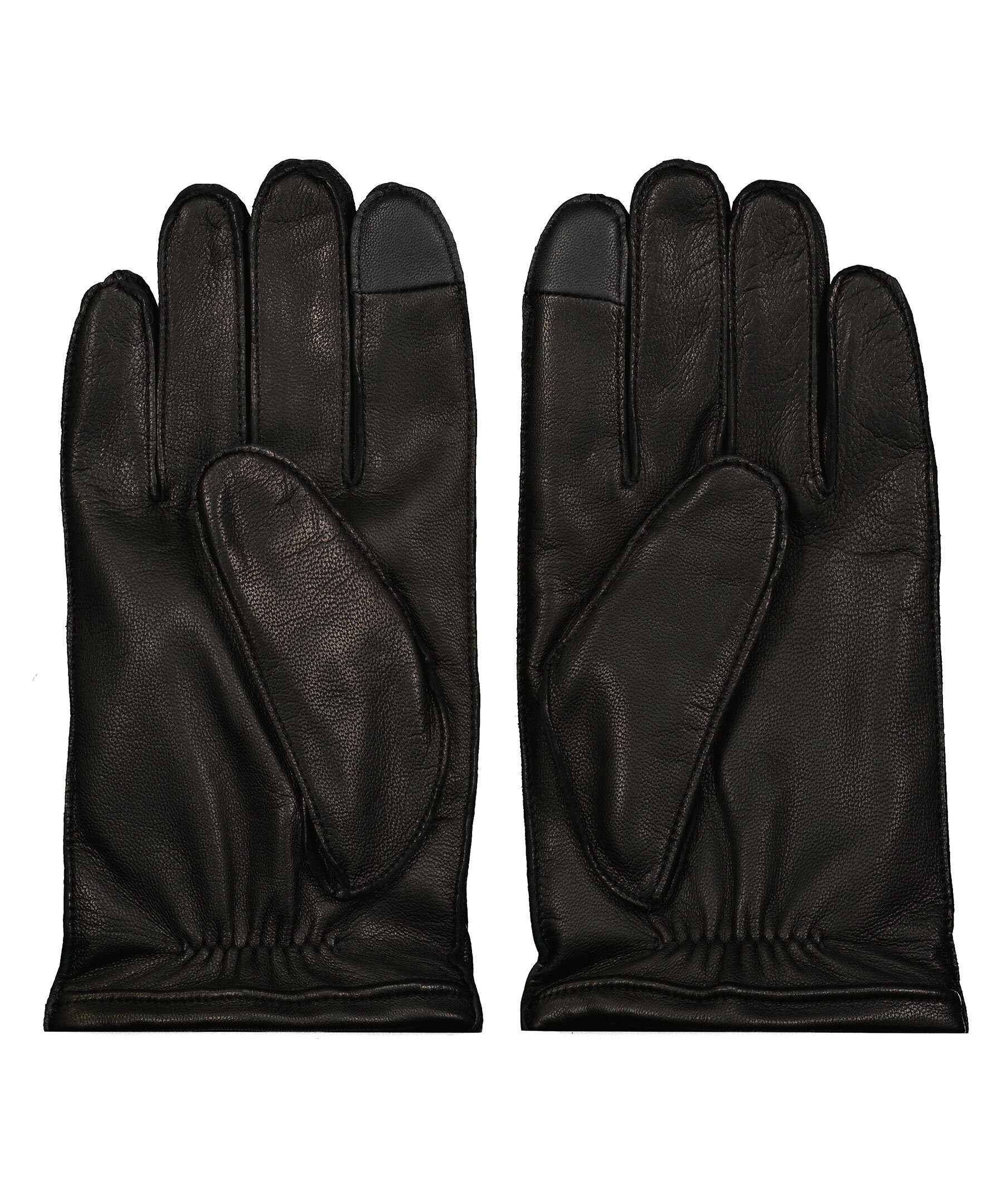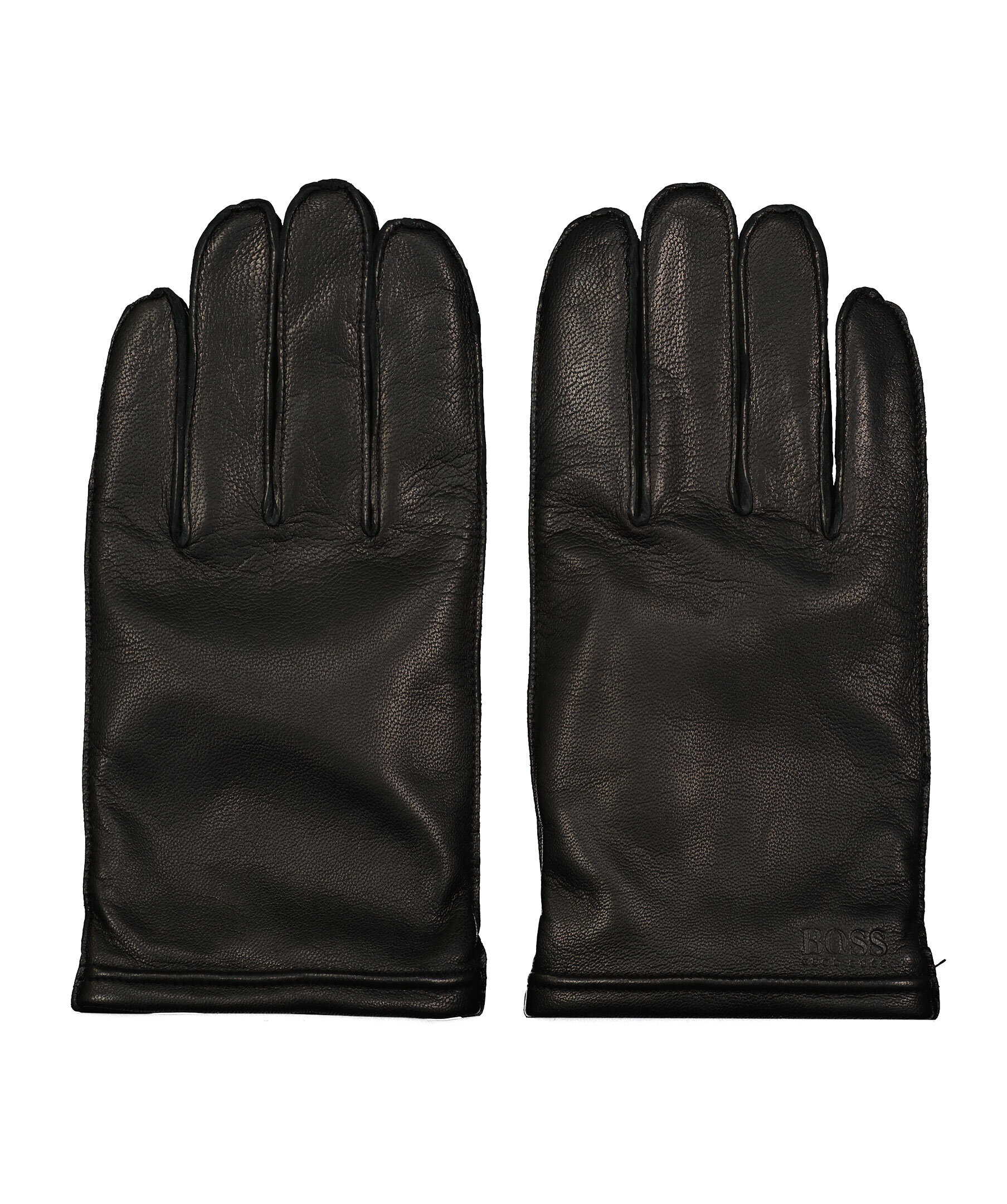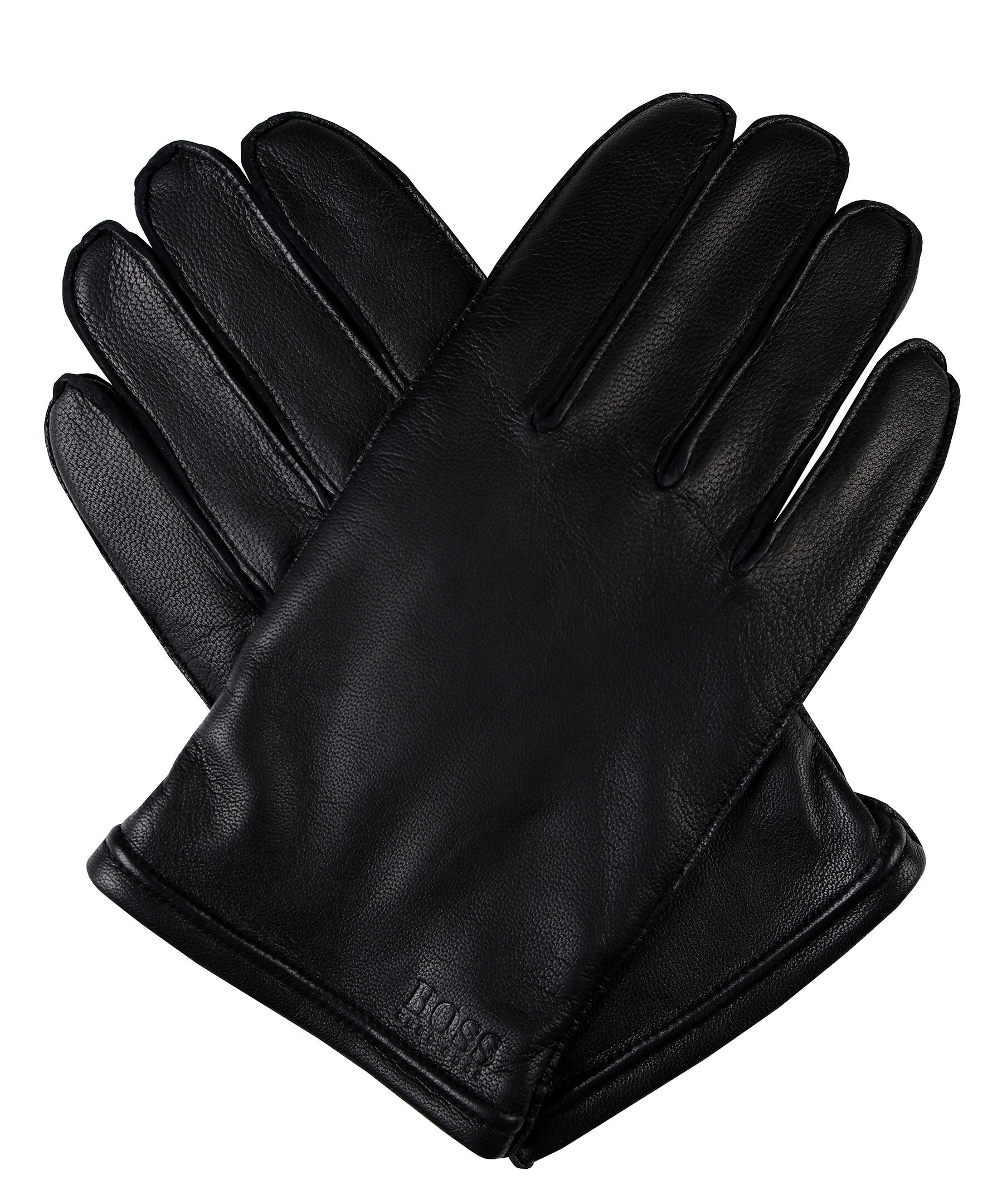 Svarta läderhandskar från Boss Business. Fodrade med ull. Detalj på pekfingrarna i annat tyg, som fungerar på touch skärm. Embossad logotyp på höger handske. Resår på handledens insida.