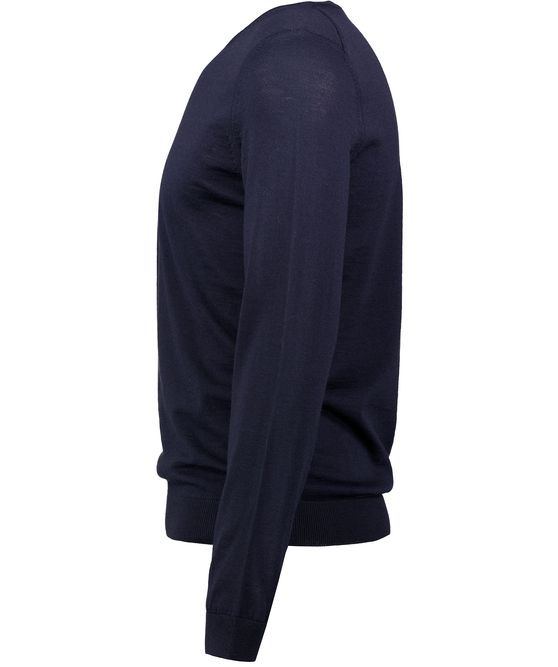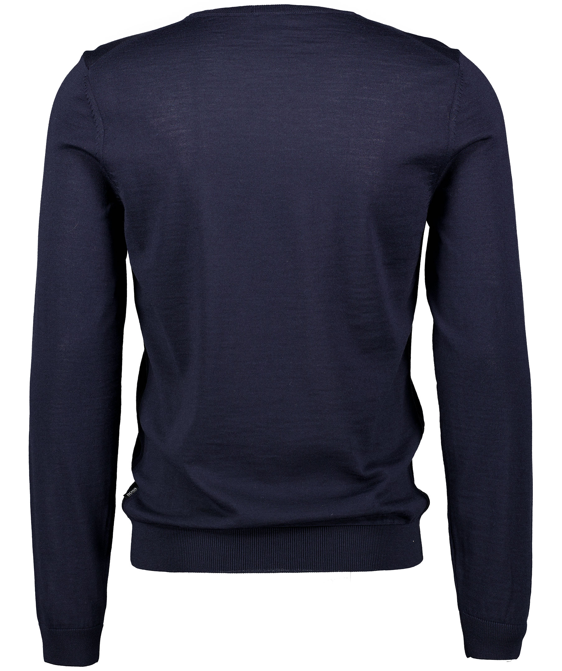 Marinblå finstickad tröja från Hugo Boss. Rundad hals, ribbade muddar, 100% ull.