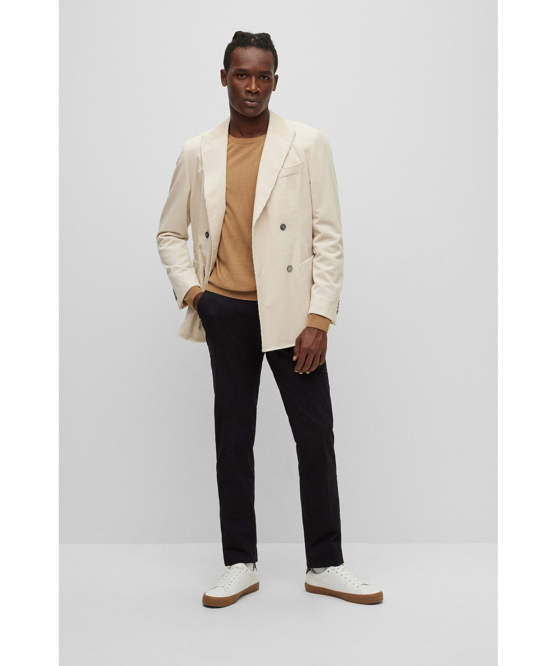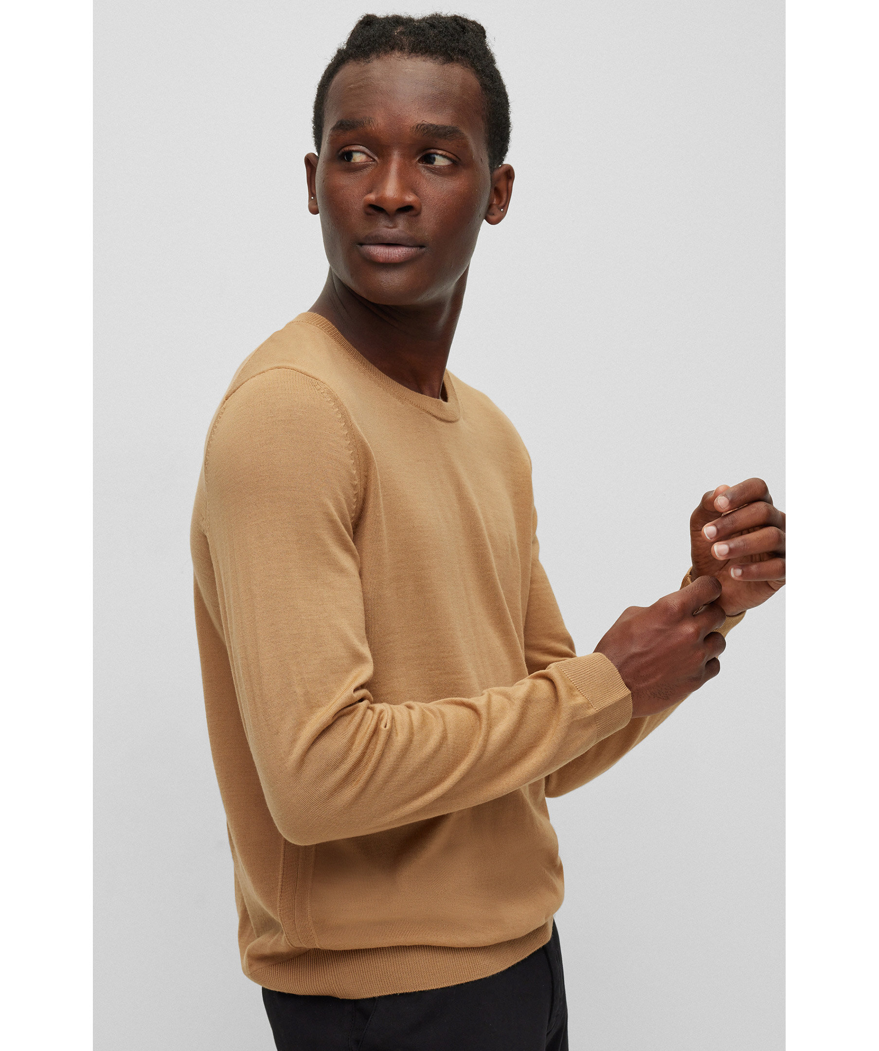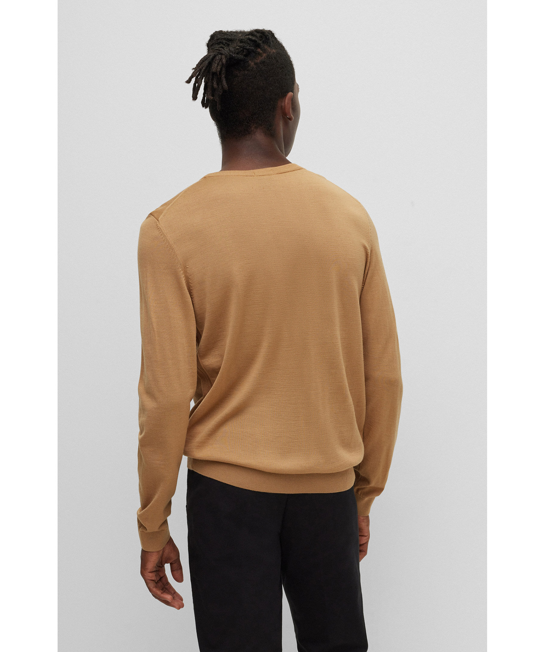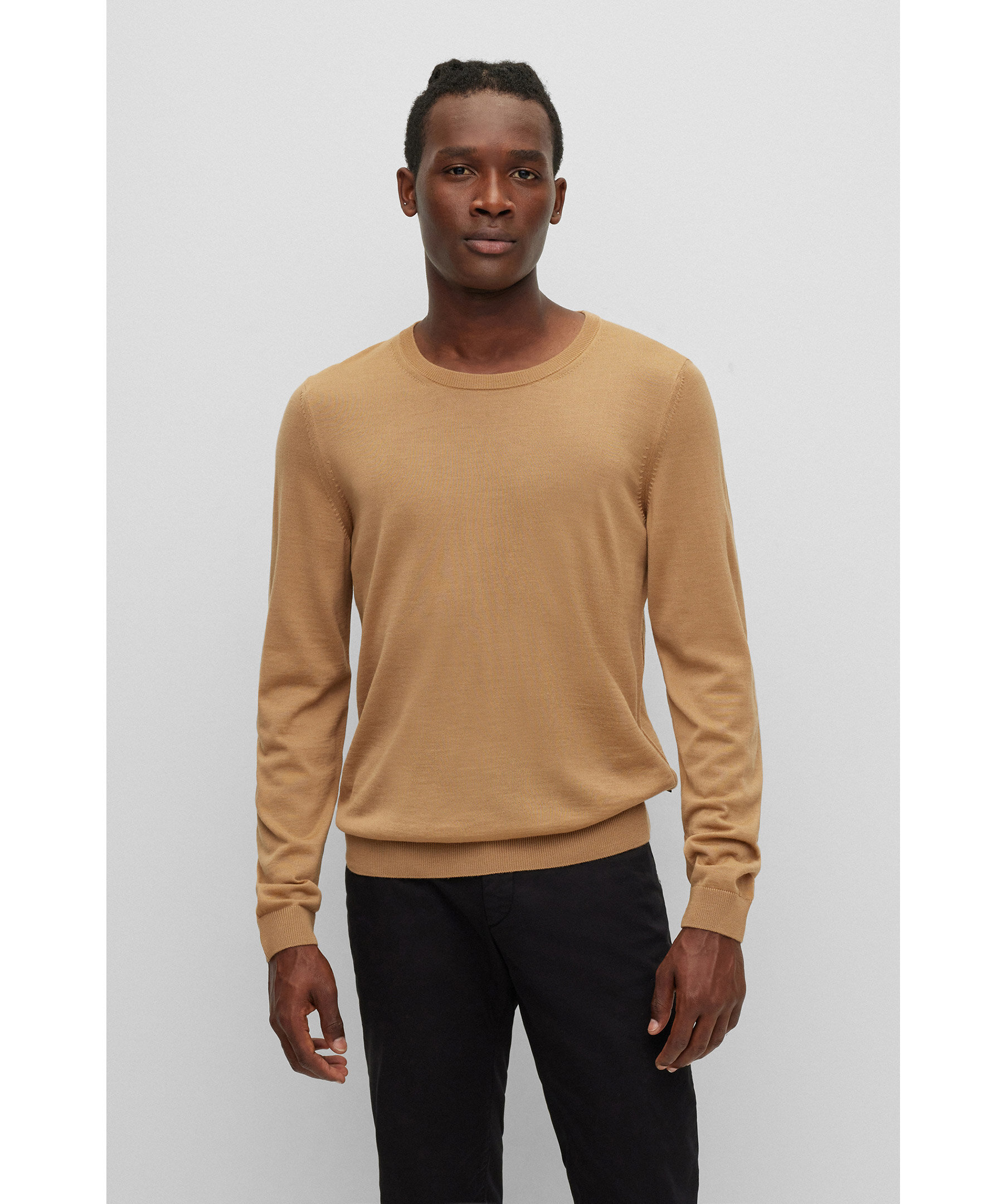 Kamelfärgad, finstickad tröja från BOSS Black. Rundad hals, smal passform, tillverkad i 100% ull. Ribbstickade muddar i ärmslut och plaggslut samt i halsringningen. Liten, vit logotyp på svart tyglapp fastsydd i sidsömmen på vänster sida längst ner på tröjan.