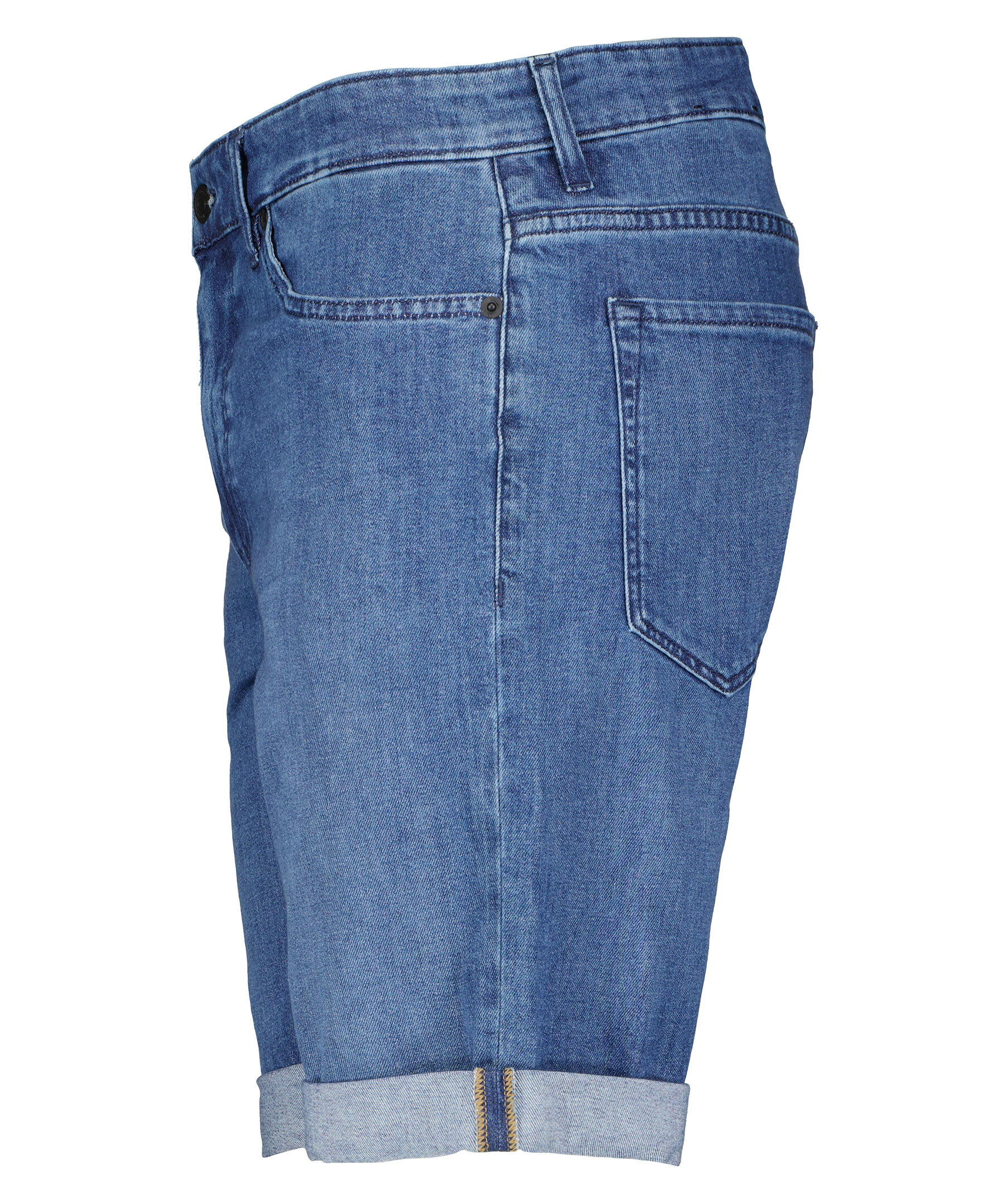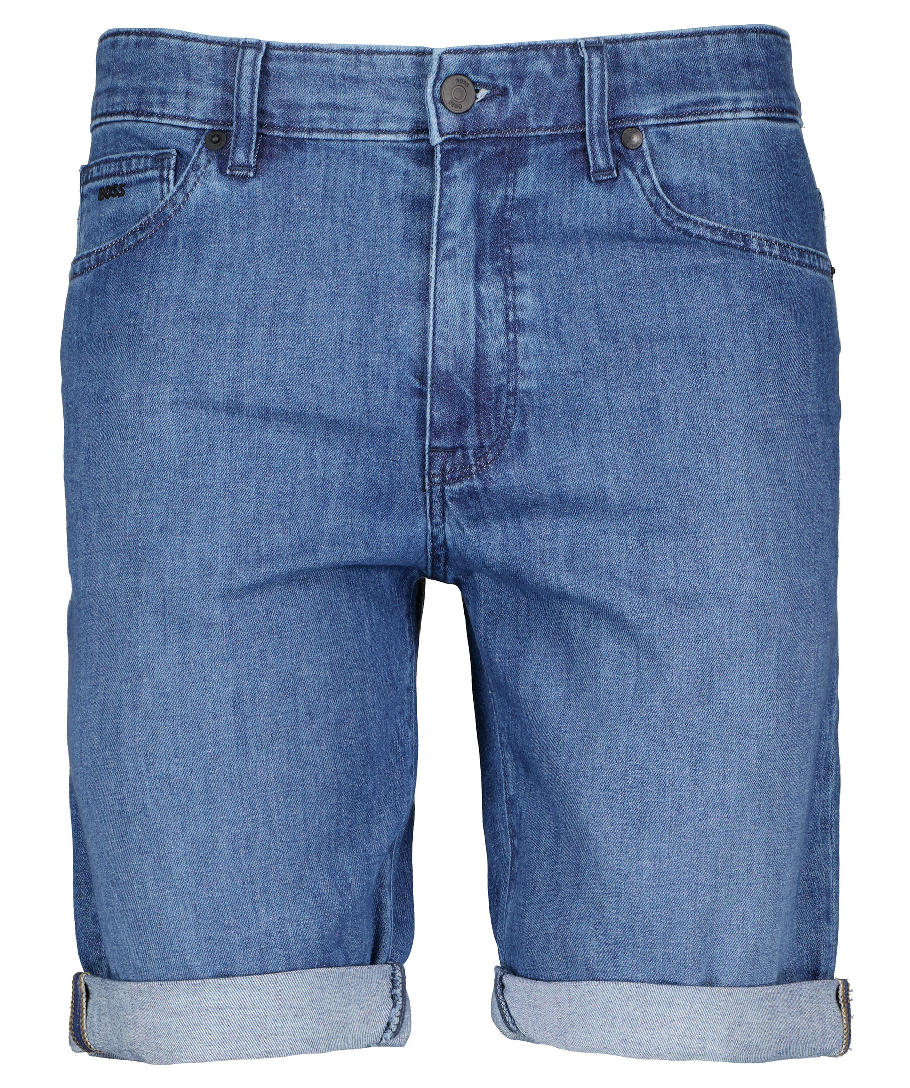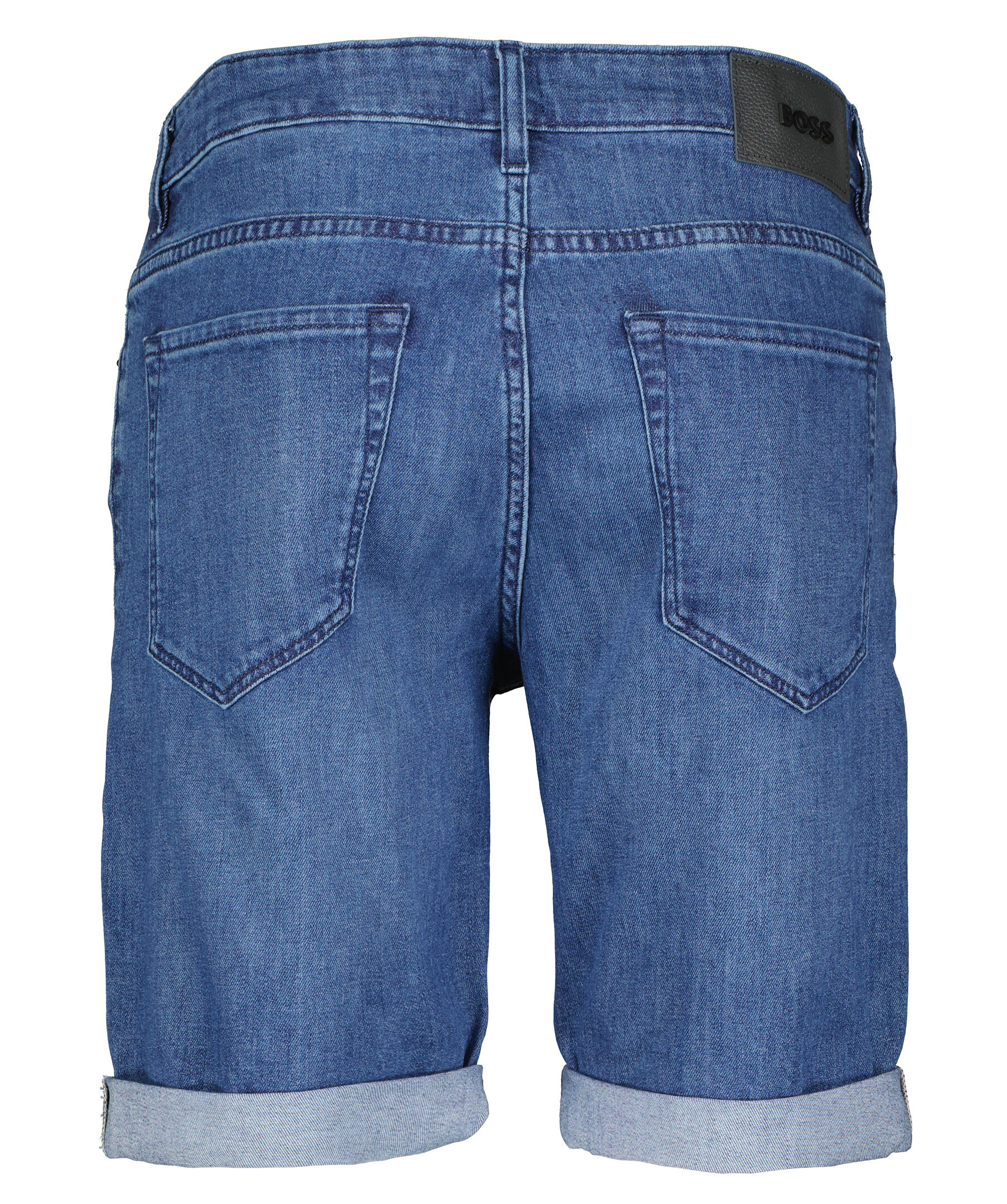 Blå jeansshorts från BOSS Black. Femficksmodell och hällor för skärp. Uppvikta nedtill. Logotyp i metall både vid fickan och baktill på patch i läder.