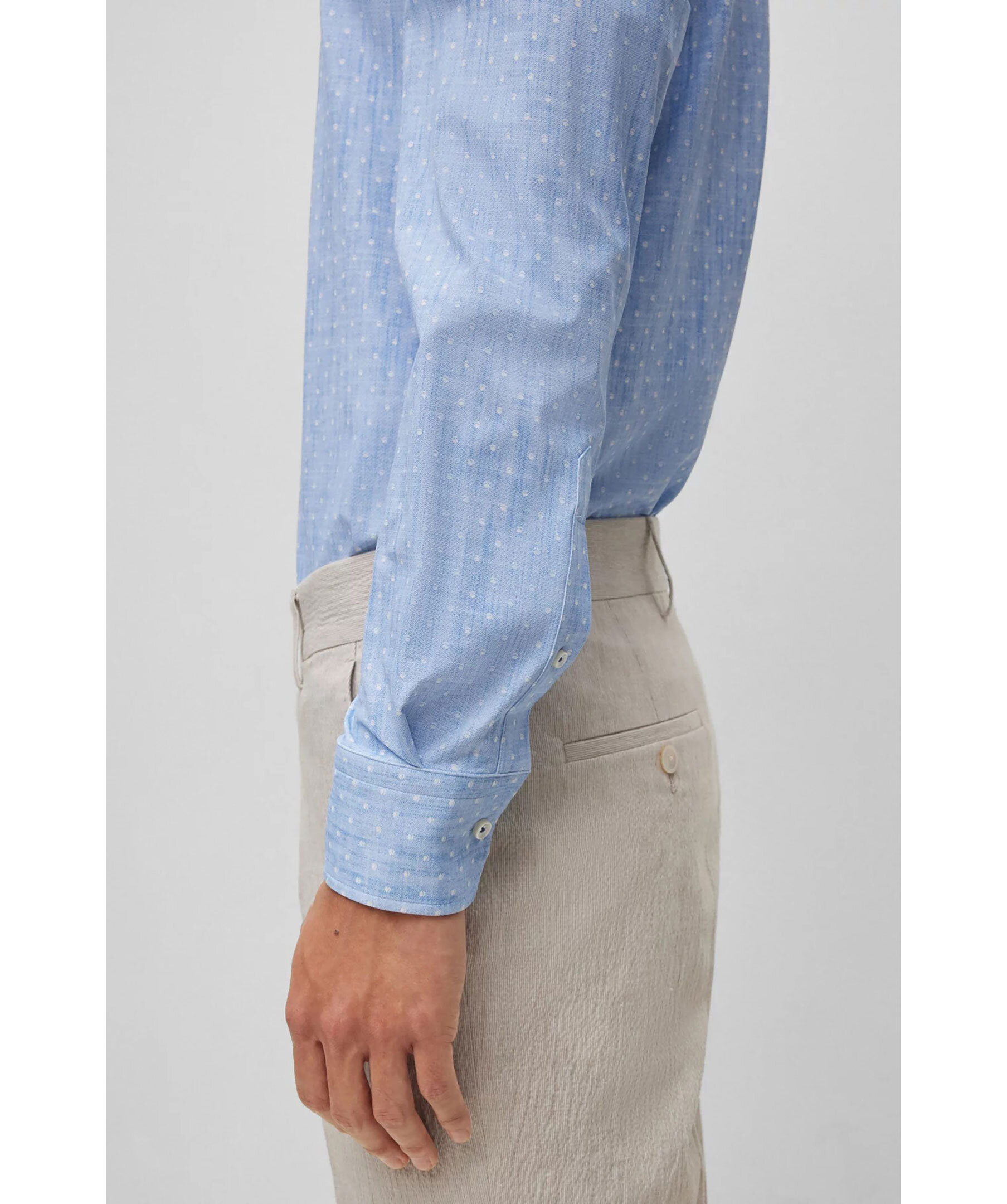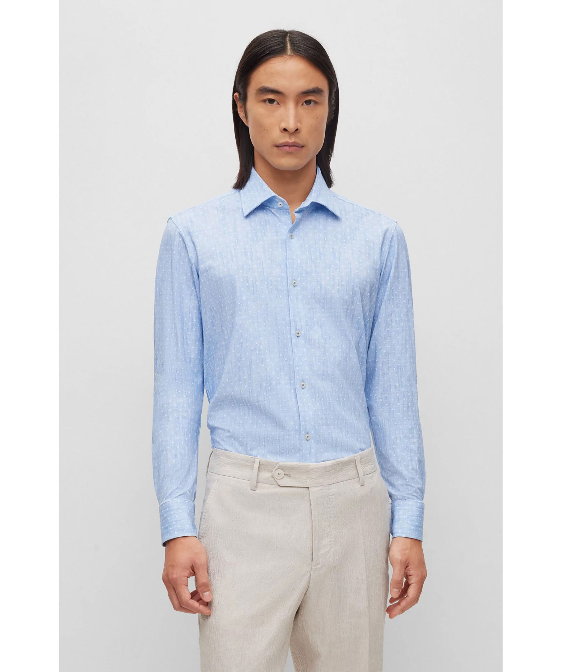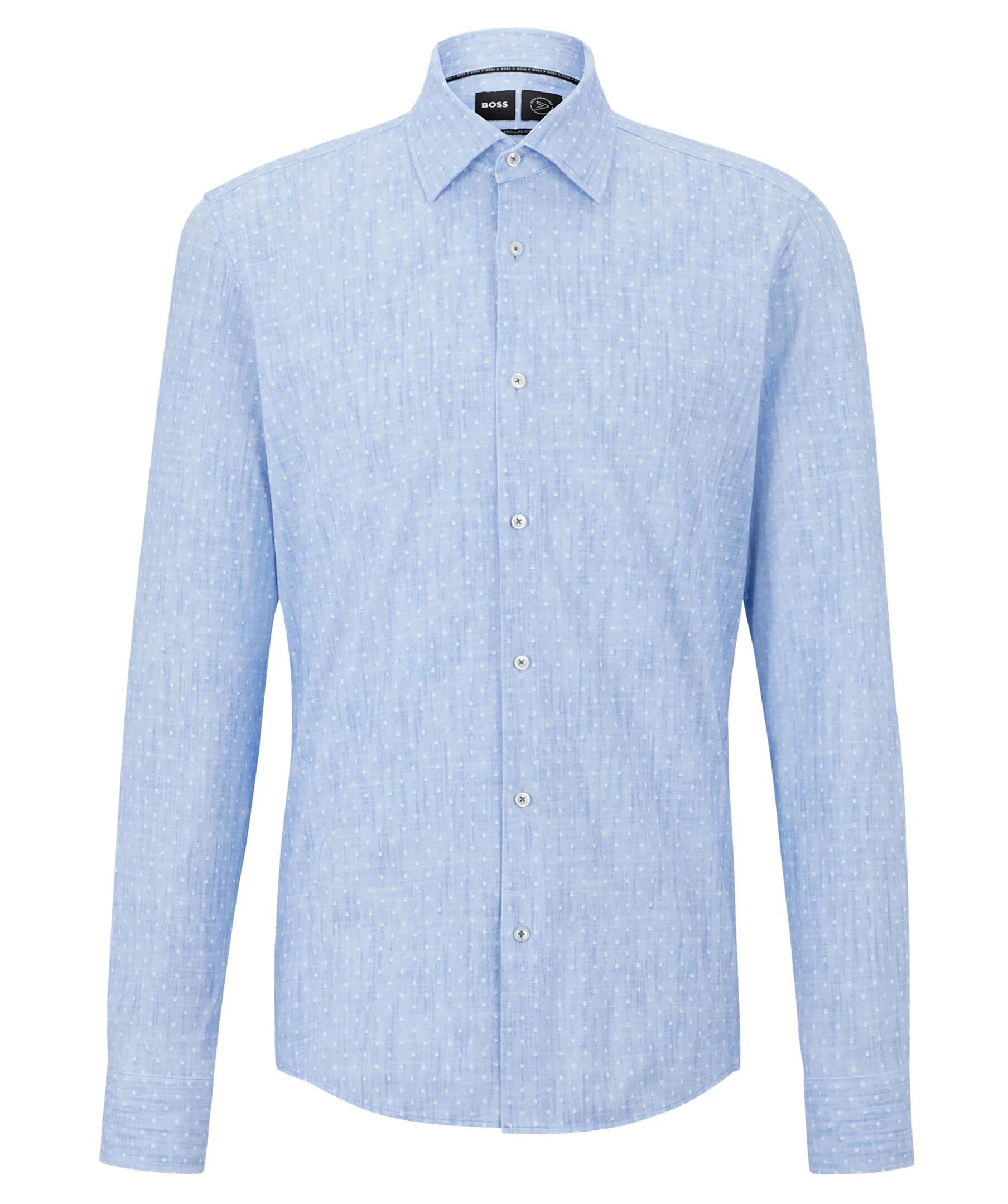 Ljusblå och vit mönstrad skjorta från BOSS Black. Enkla manschetter. Spetsig krage. Tillverkad i återvunnen polyamid.