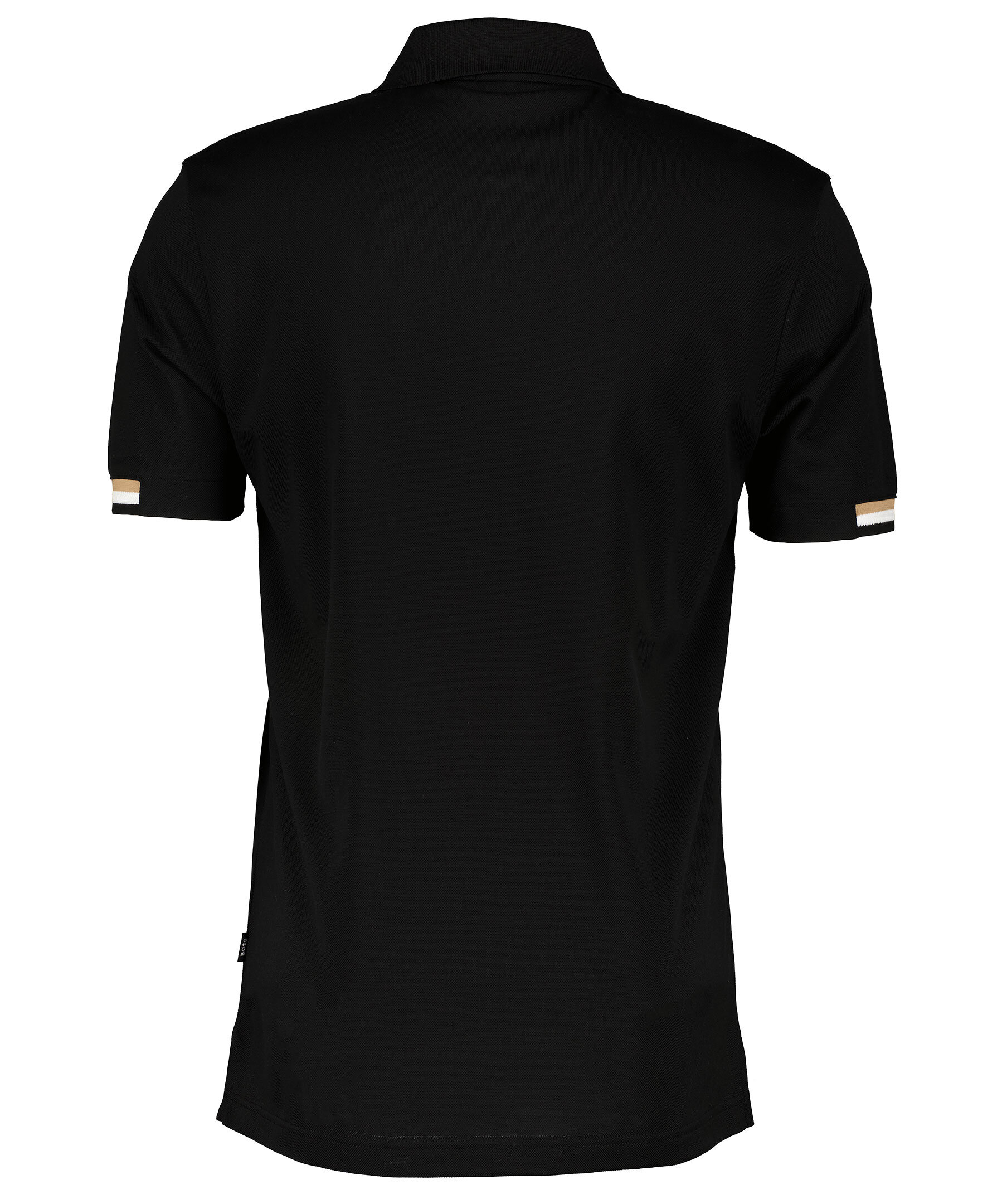 Svart piké från BOSS Black. Logg tryckt på vänster bröst, två knappar fram, spetsig krage och korta slitsar i sidorna. Beige vit och svart elastisk mudd vid ärmslut.