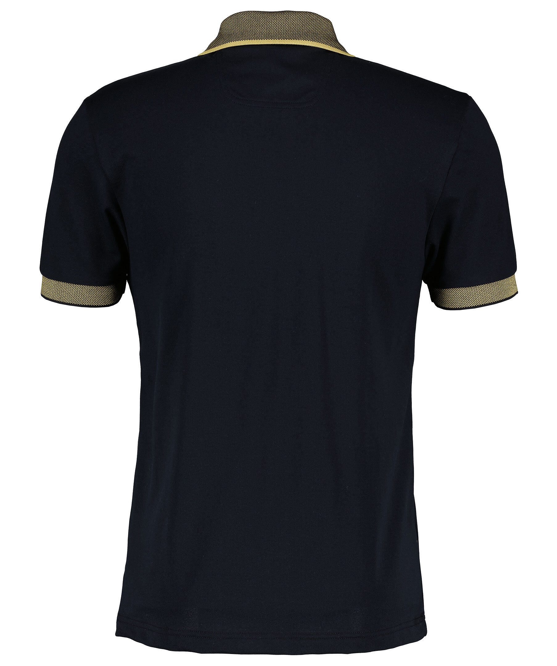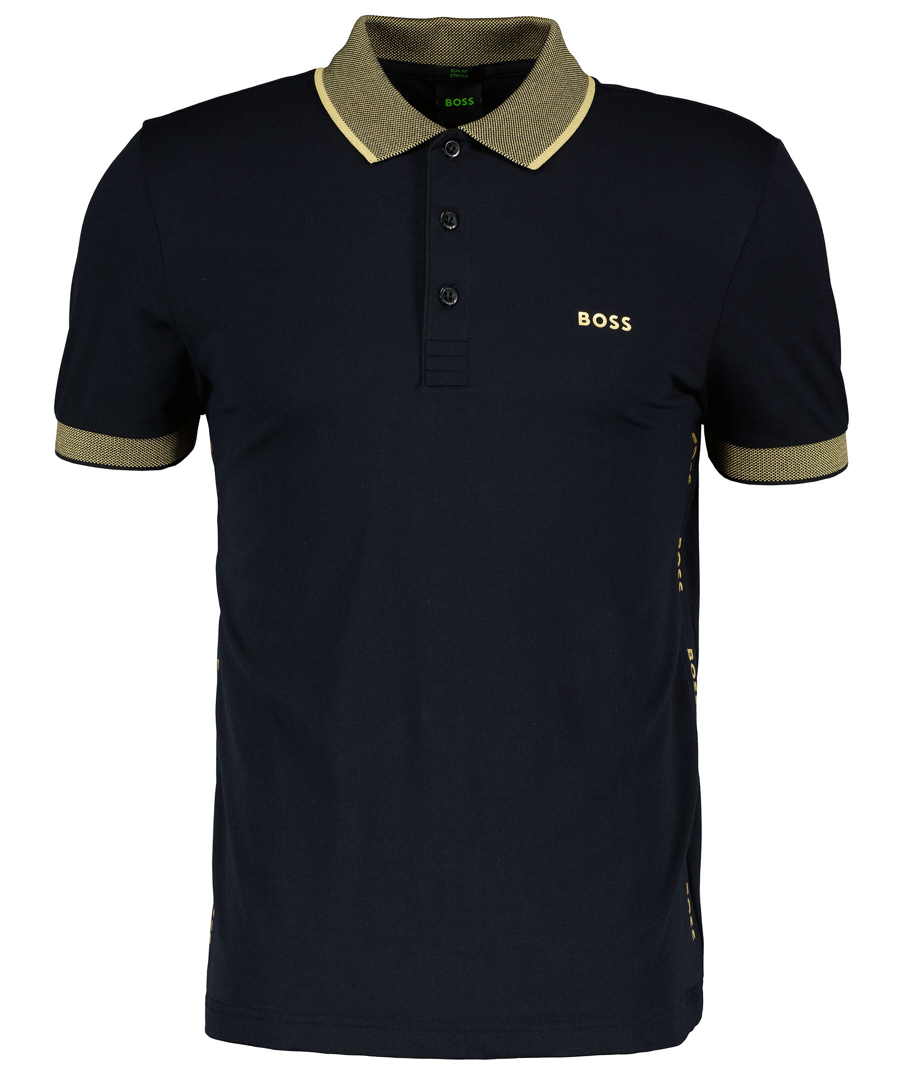 Svart Piké från BOSS Black. guldfärgad tryckta logotyper på bröstet och i sidorna. Tre knappar fram, spetsig krage. Guldfärgade och svart stickade detaljer på kragen och i ärmslut.
