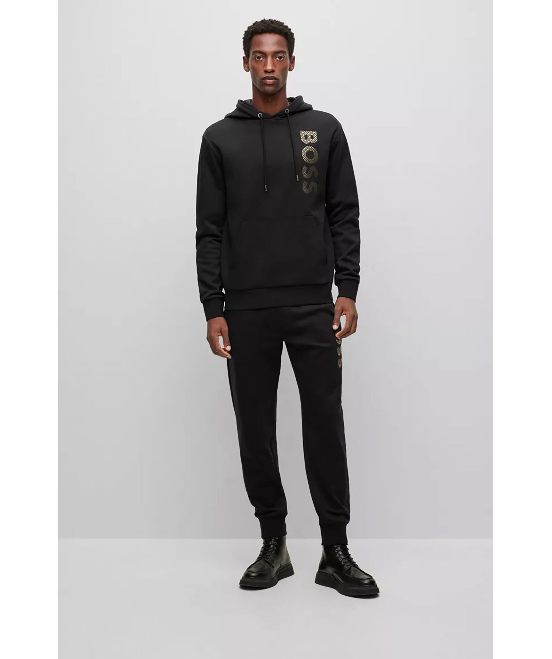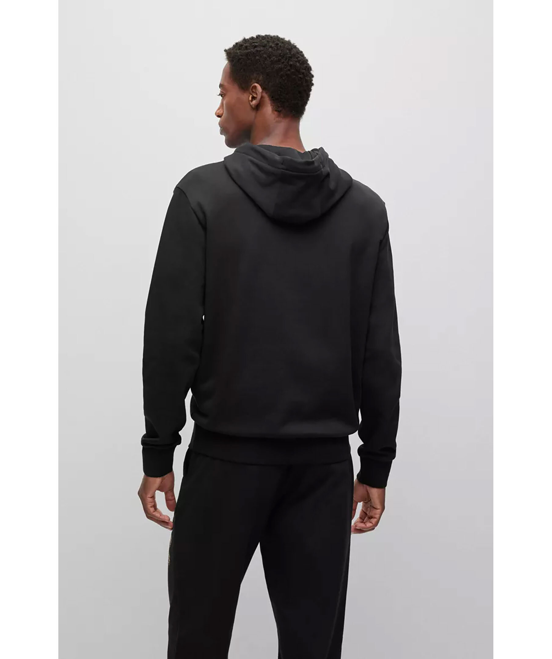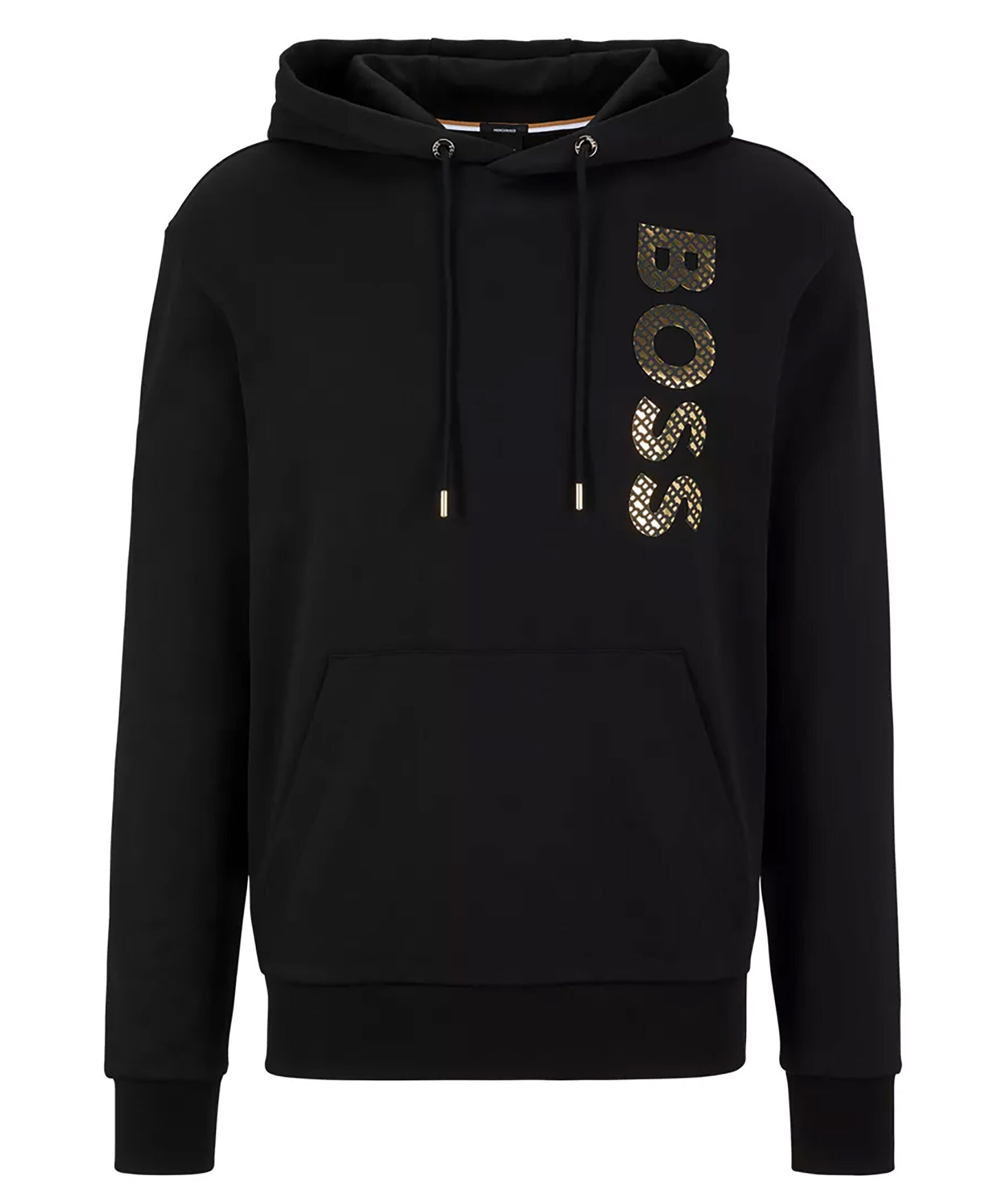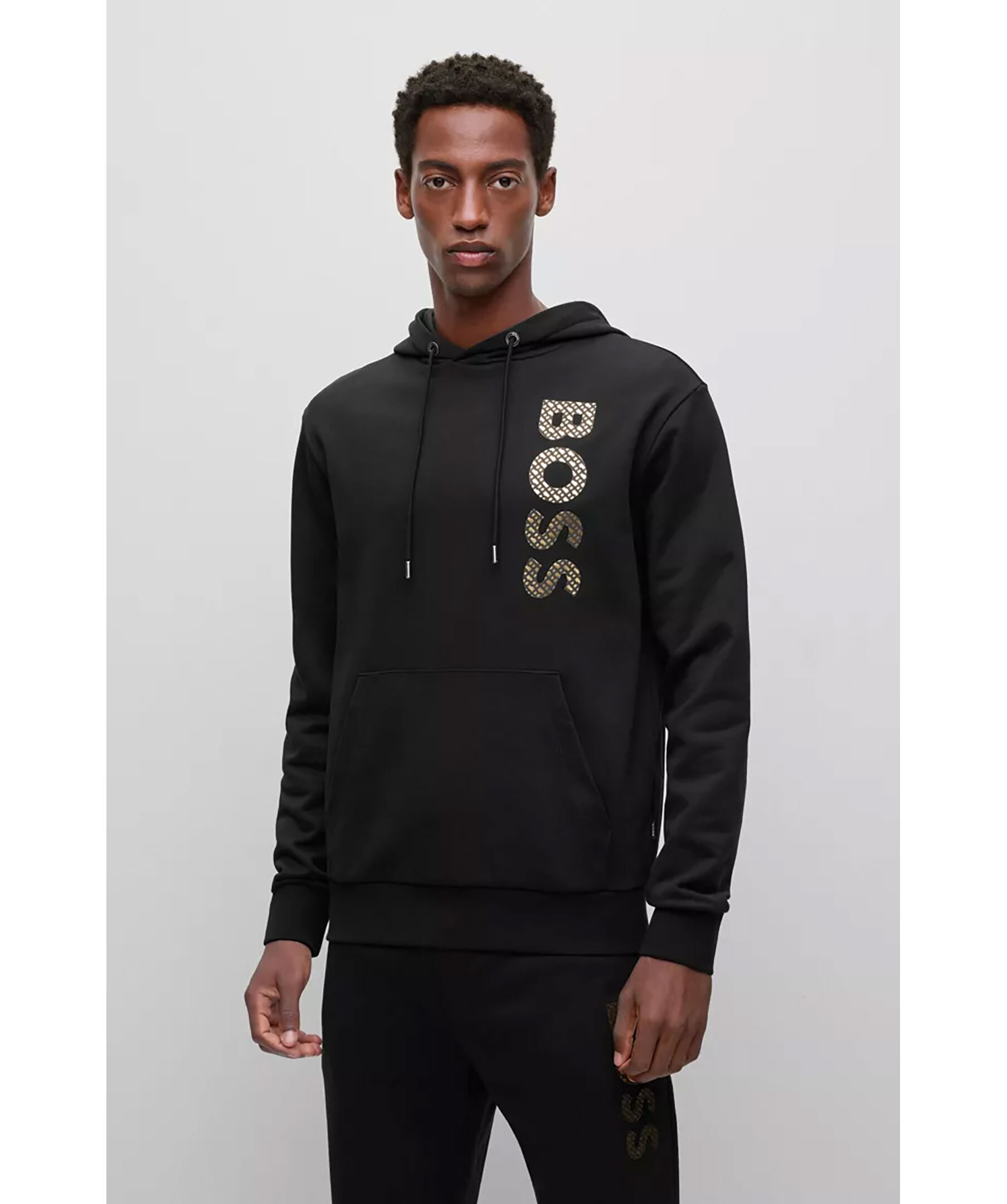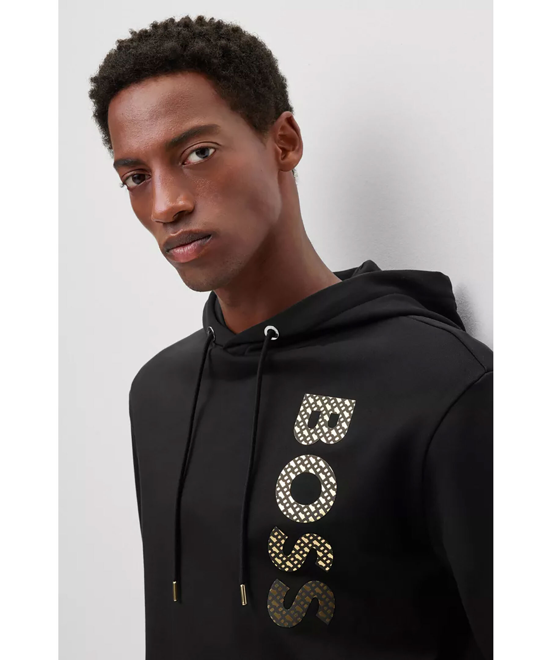 Svart hoodie från BOSS black. Luva med svart snörning. Ribbstickade muddar vid ärm och plaggslut. Stor vertikal logotyp med mönster på vänster bröst. Känguruficka på magen, normal passform. Tillverkad i 100% bomull. Modellen är en storlek M och är 189 cm lång med en, 97 cm byst, 75 cm midja och 93 cm höft.