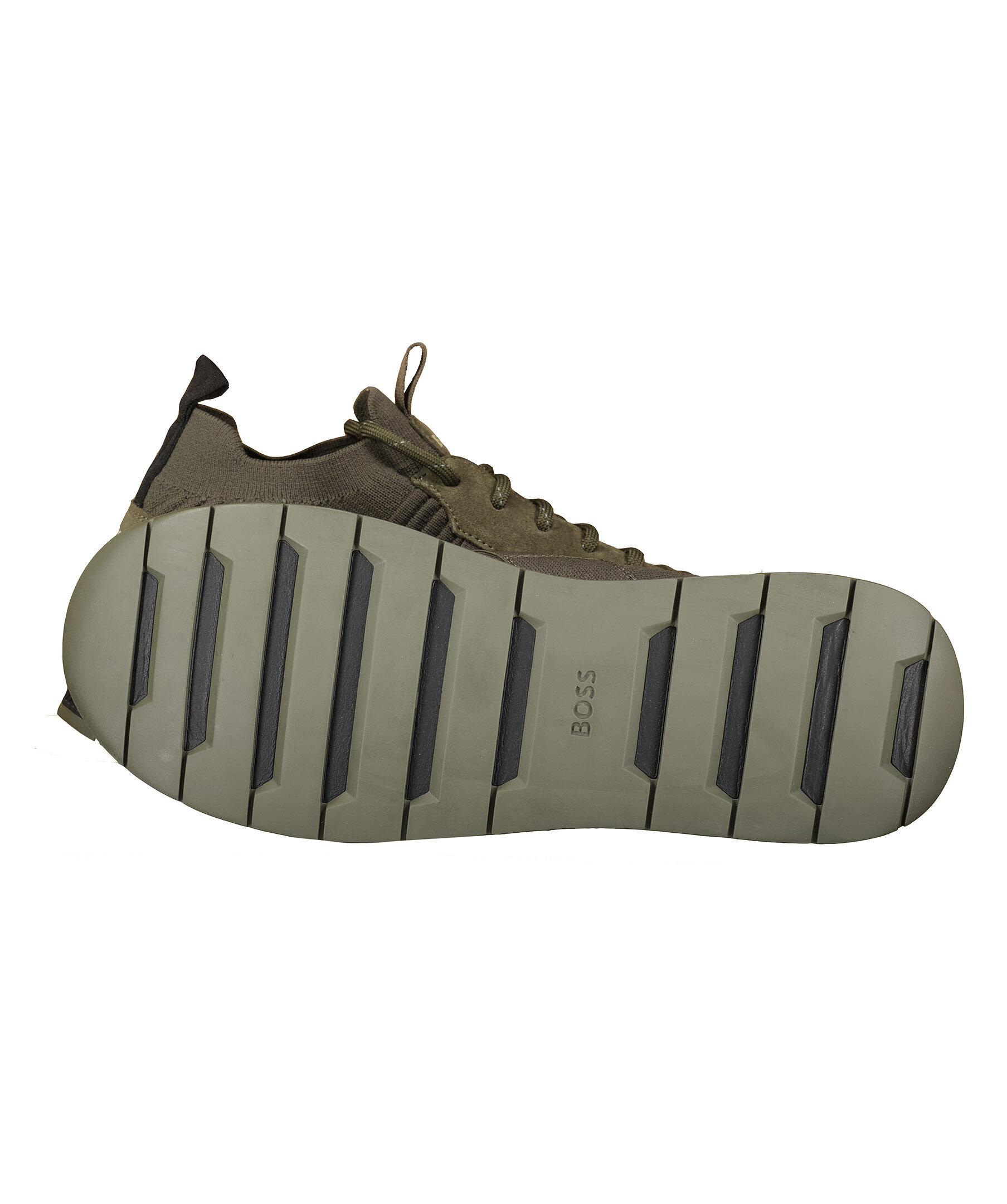 Gröna sneakers från BOSS Black. Beige logotyp fram, bak och på sidan. yttersula. Tillverkad i återvunnet material.
