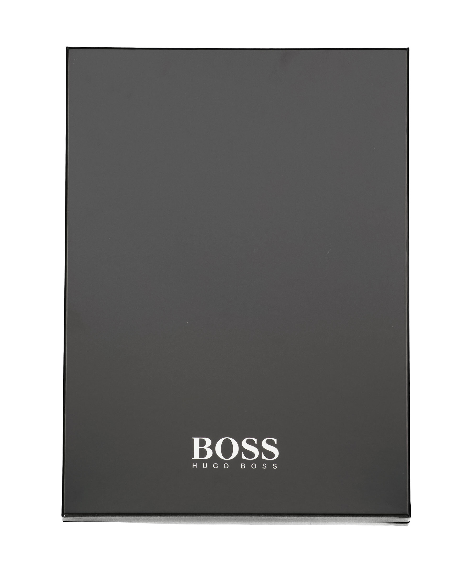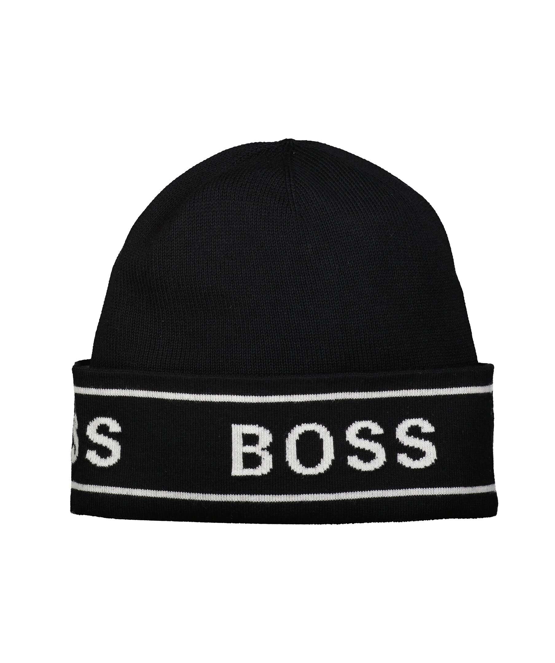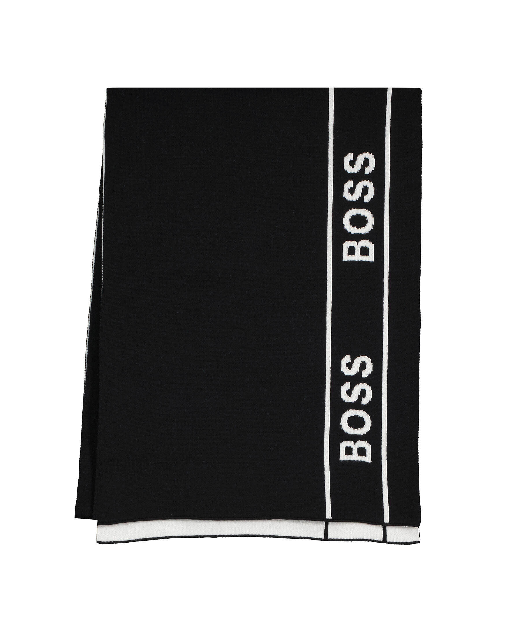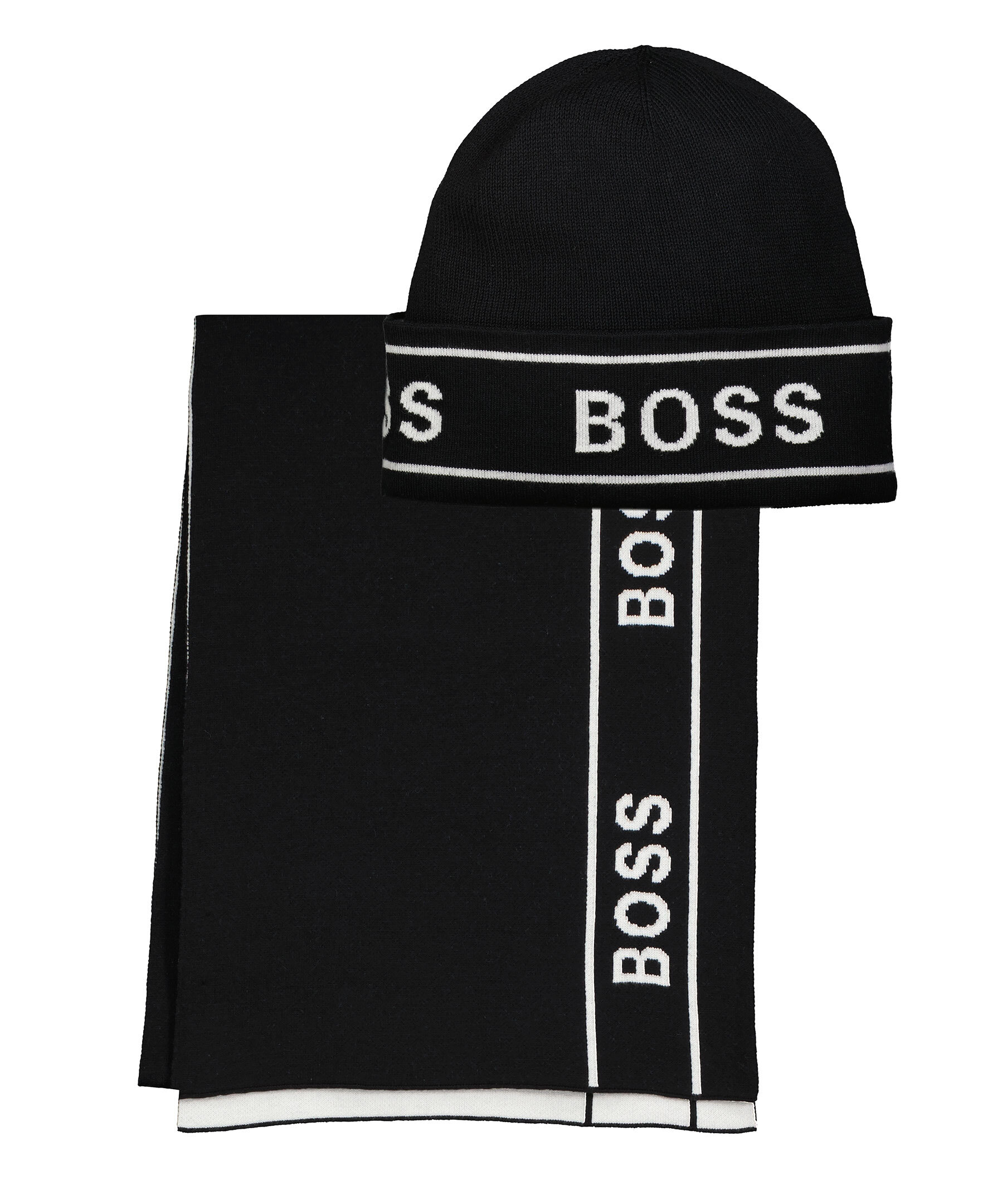 Svart mössa och halsduk från Boss business. Mössan har uppvikt kant och stickade logotyper i vitt. Dubbelstickad halsduk ned logotyper i vitt.