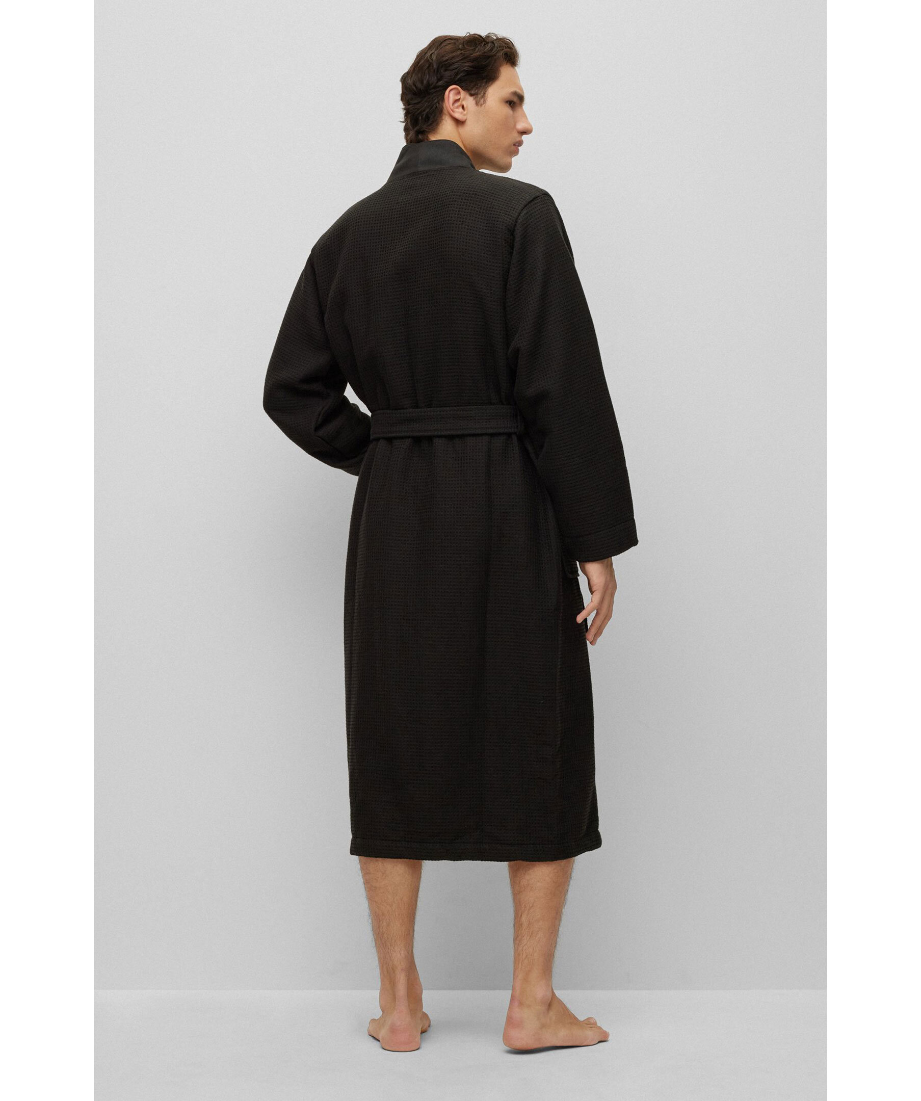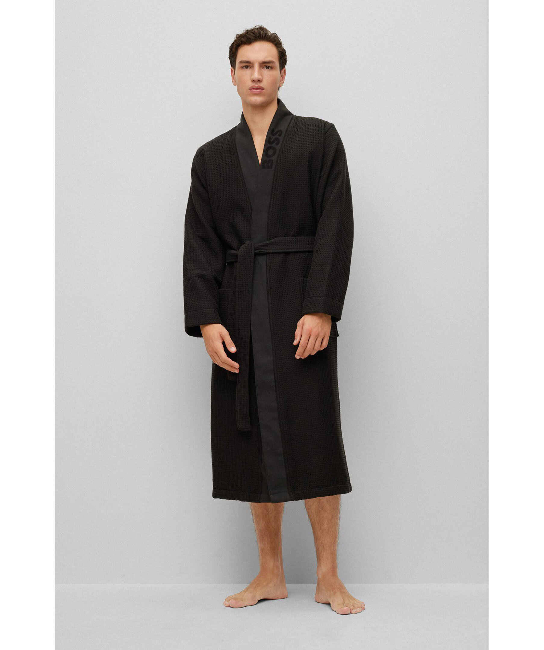 Svart morgonrock i avslappnad modell från BOSS Black. Hällor och bälte i midjan, har en våffelstrukturerad yta med ett foder av bomullsfrotté och är tillverkad i bomullsblandning. Insydd logga vid ringningen fram och två framfickor.