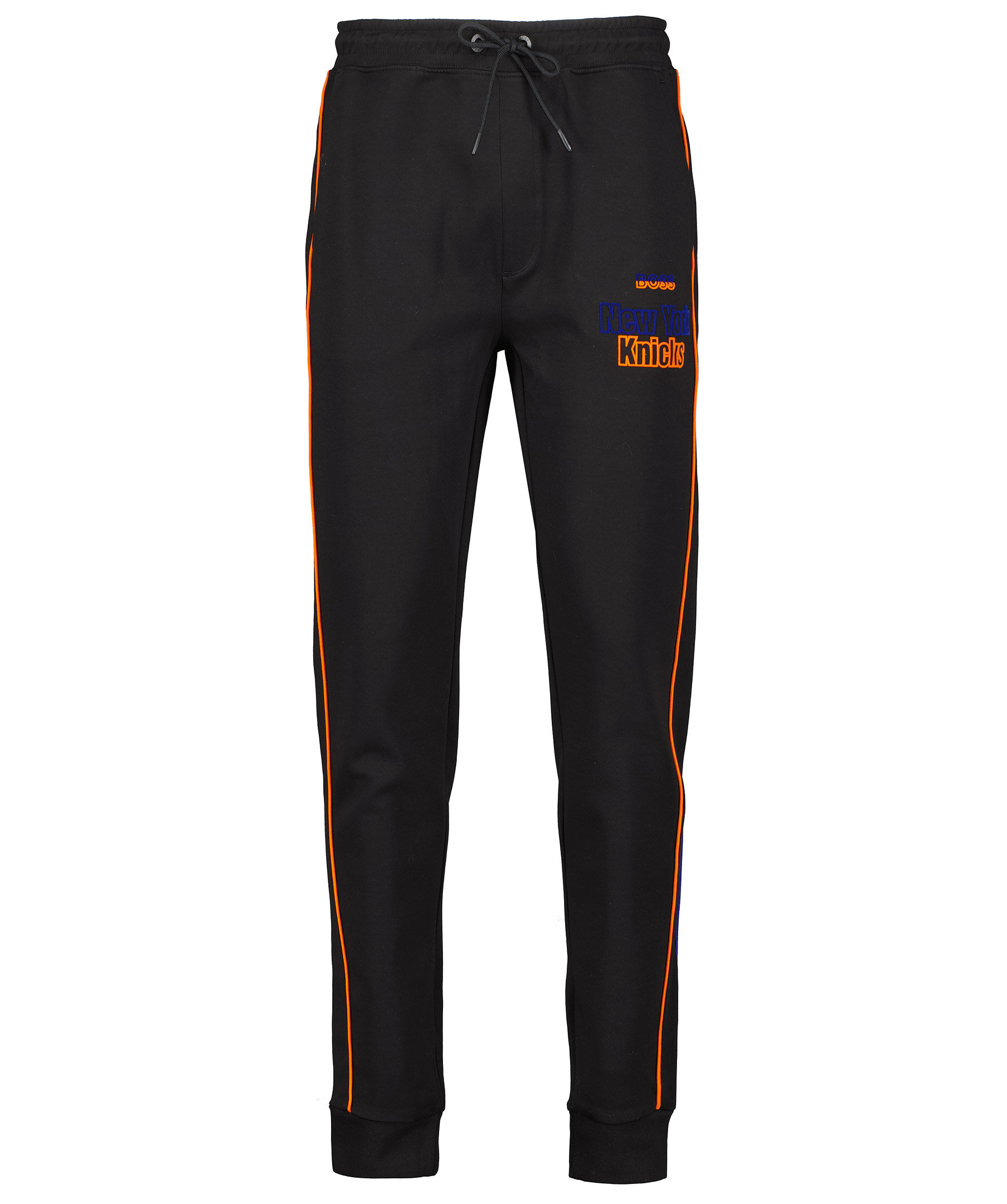 Svarta mjukisbyxor från BOSS Orange x NBA. New York Knicks branding på vänster byxben. Orangea och blå revärer, två fickor fram samt en bakficka. Knyt i midjan, muddar i bensluten. Nyckelrem med BOSS x NBA branding medföljer.