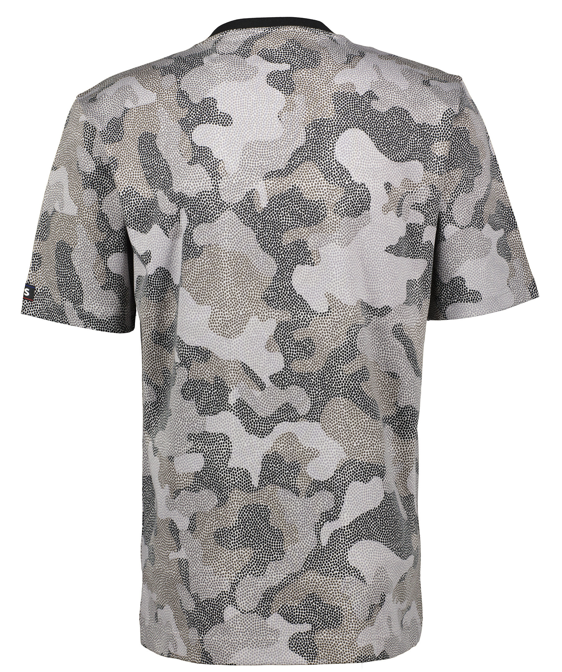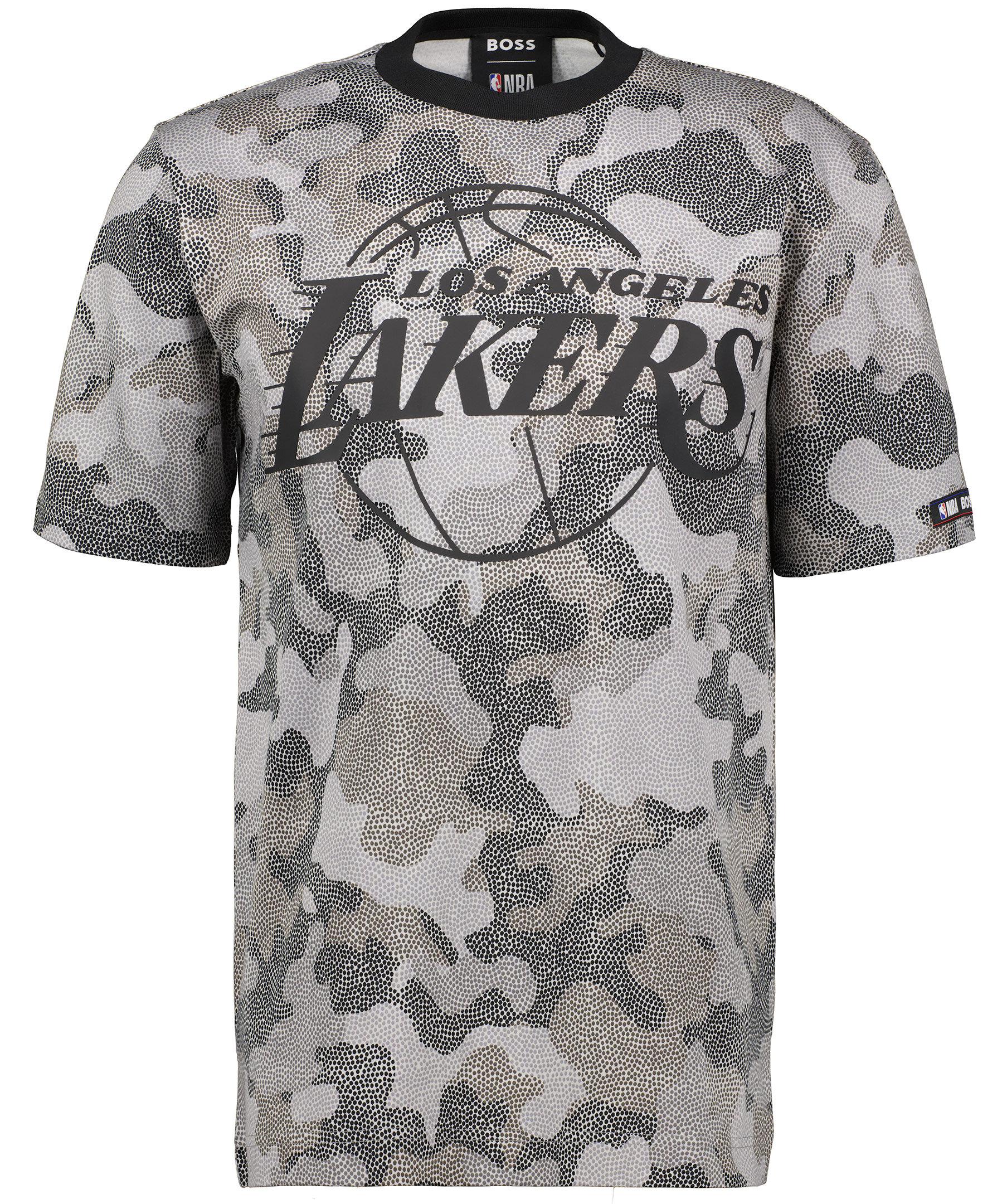 Ljusgrå, mörkgrå och svart mönstrad T-shirt från BOSS Orange X NBA. Rundad halsringning med ribbstickad mudd. Gummerat tryck över bröstet. Patch med logotyp på vänster ärm. Tillverkad i 100% Bomull.