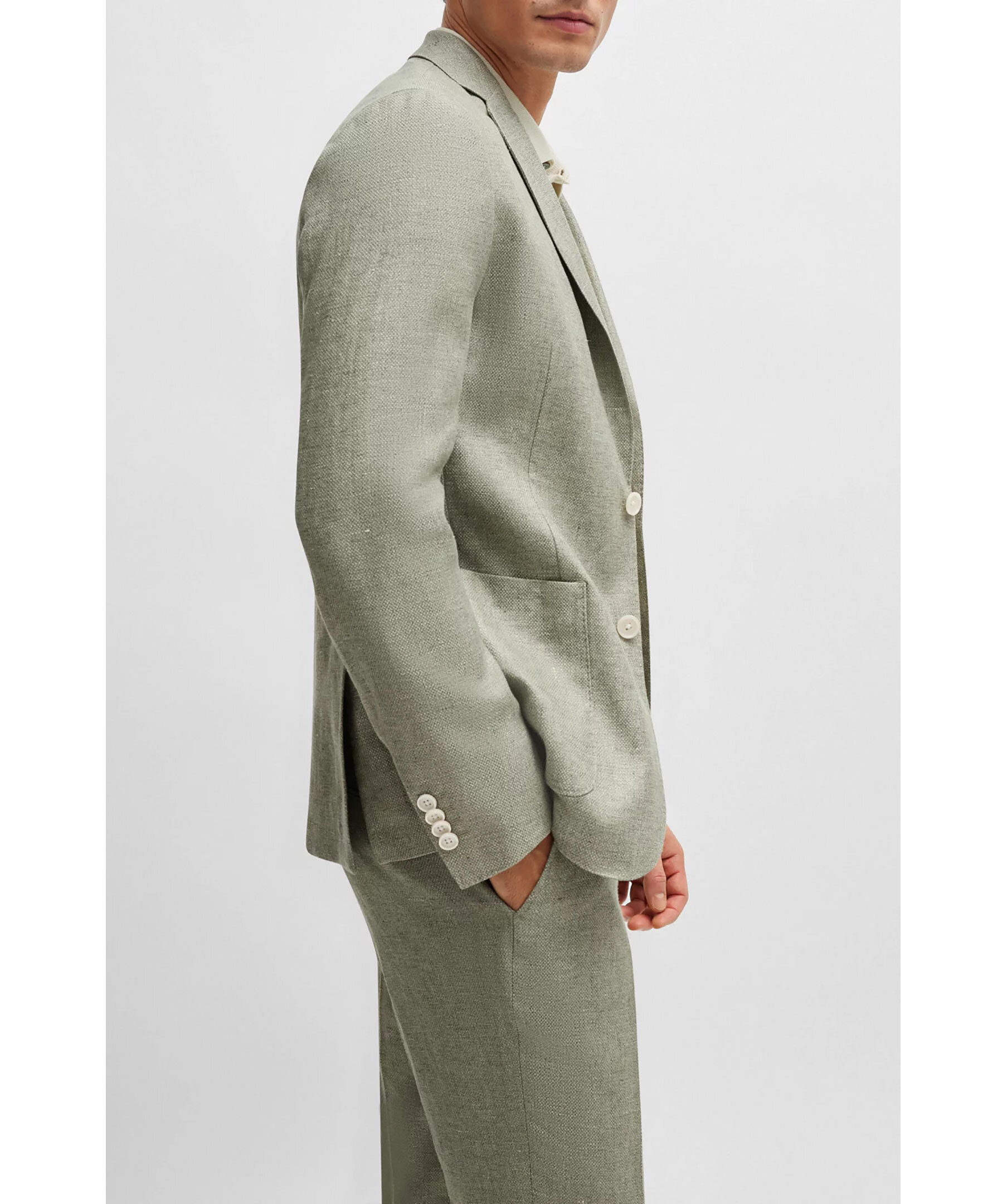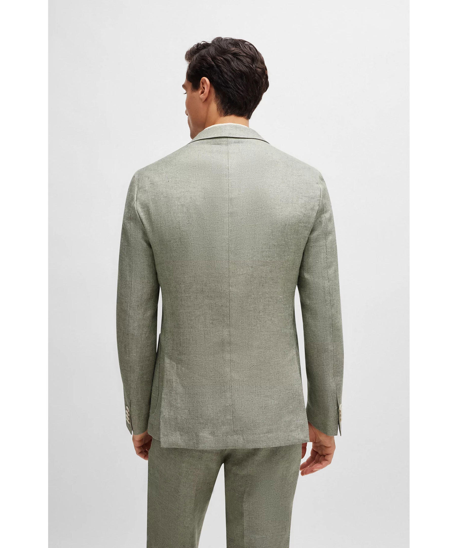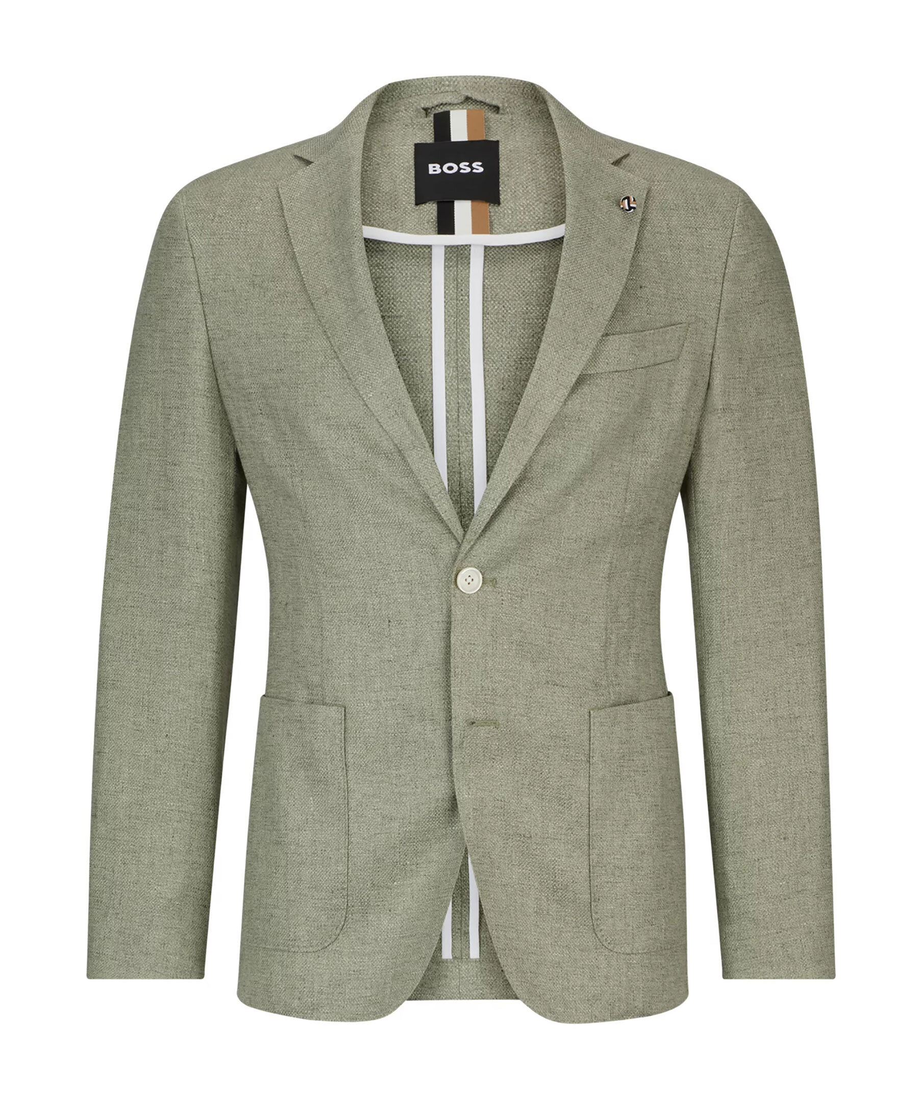 Grön raffinerad kavah från BOSS Black. Naggslag, två knappar framtill, en weltbröstficka samt två patchfickor. Sidoventiler. Skräddarsydd för en definierad passform och tillverkad i en linneblandning med stretch och ett subtilt mikromönster.