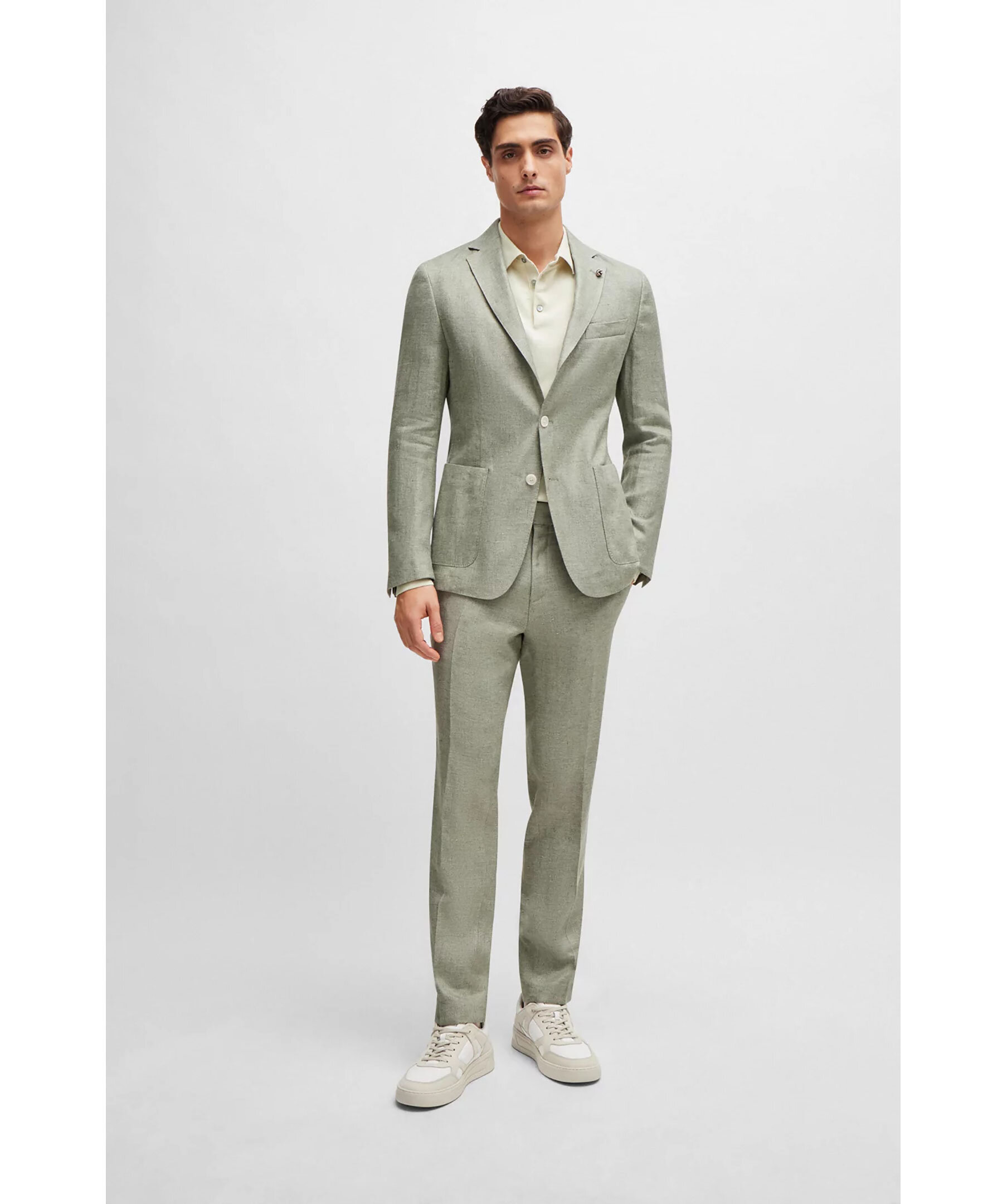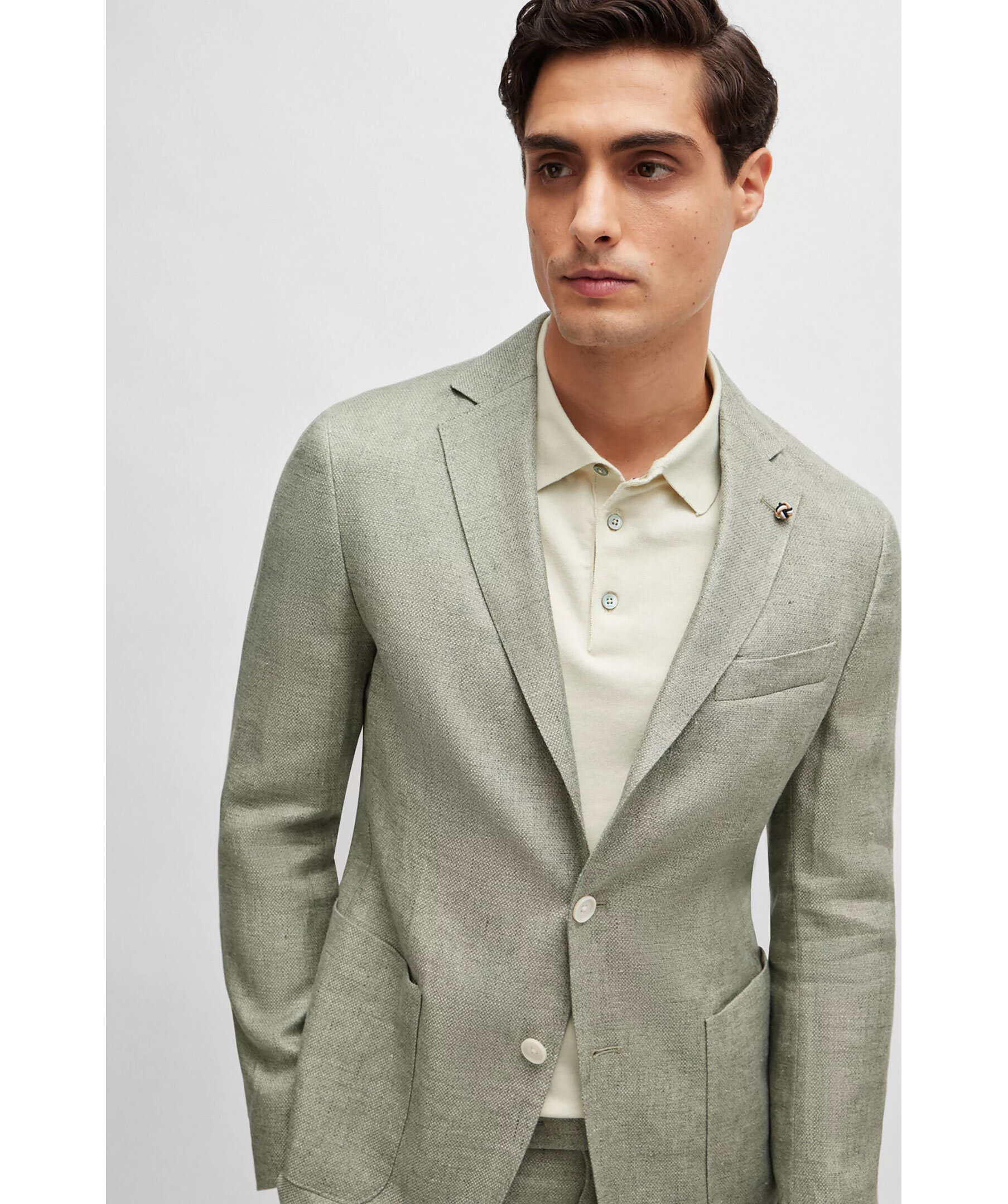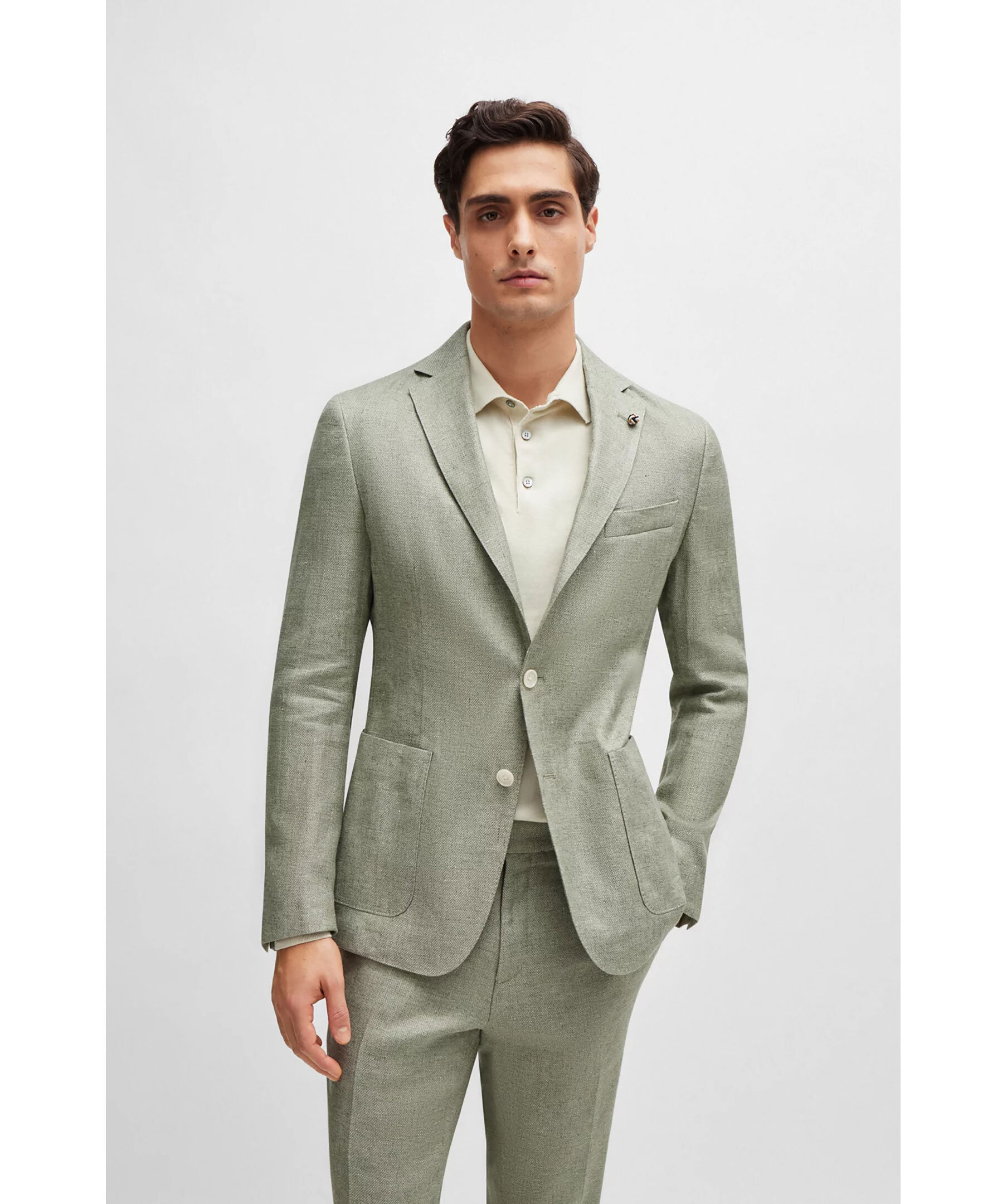 Grön raffinerad kavah från BOSS Black. Naggslag, två knappar framtill, en weltbröstficka samt två patchfickor. Sidoventiler. Skräddarsydd för en definierad passform och tillverkad i en linneblandning med stretch och ett subtilt mikromönster.