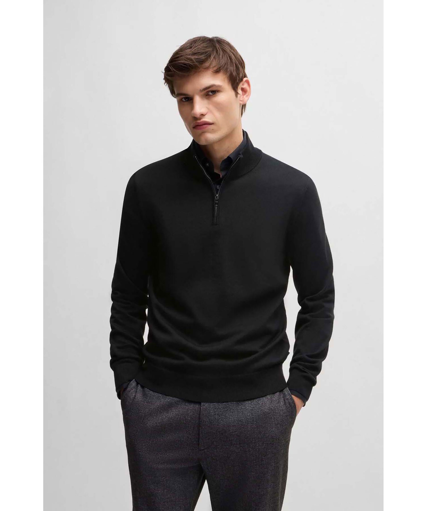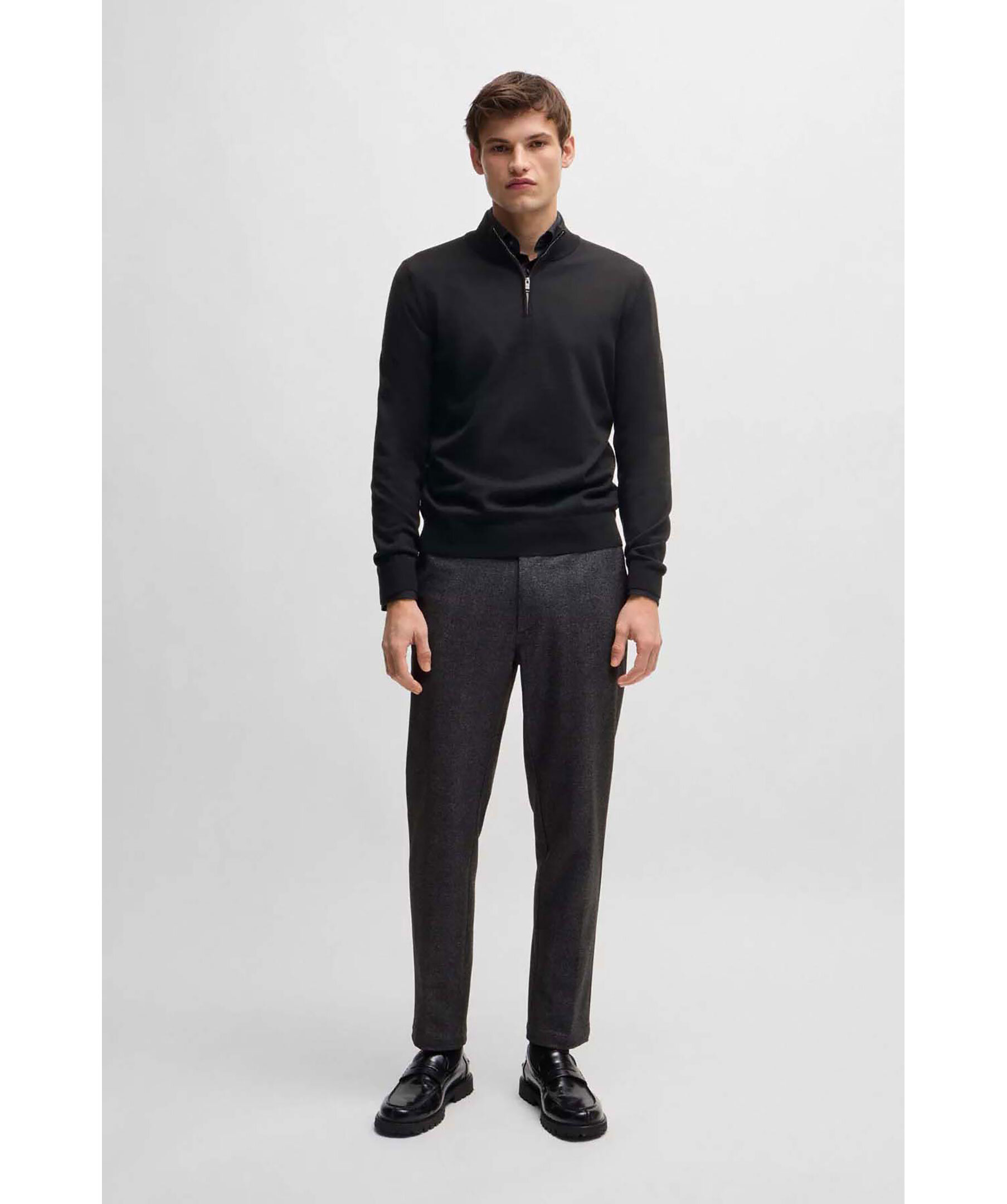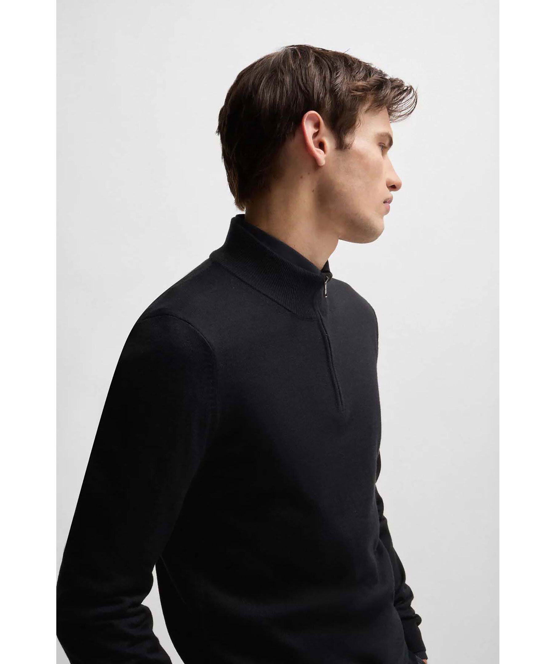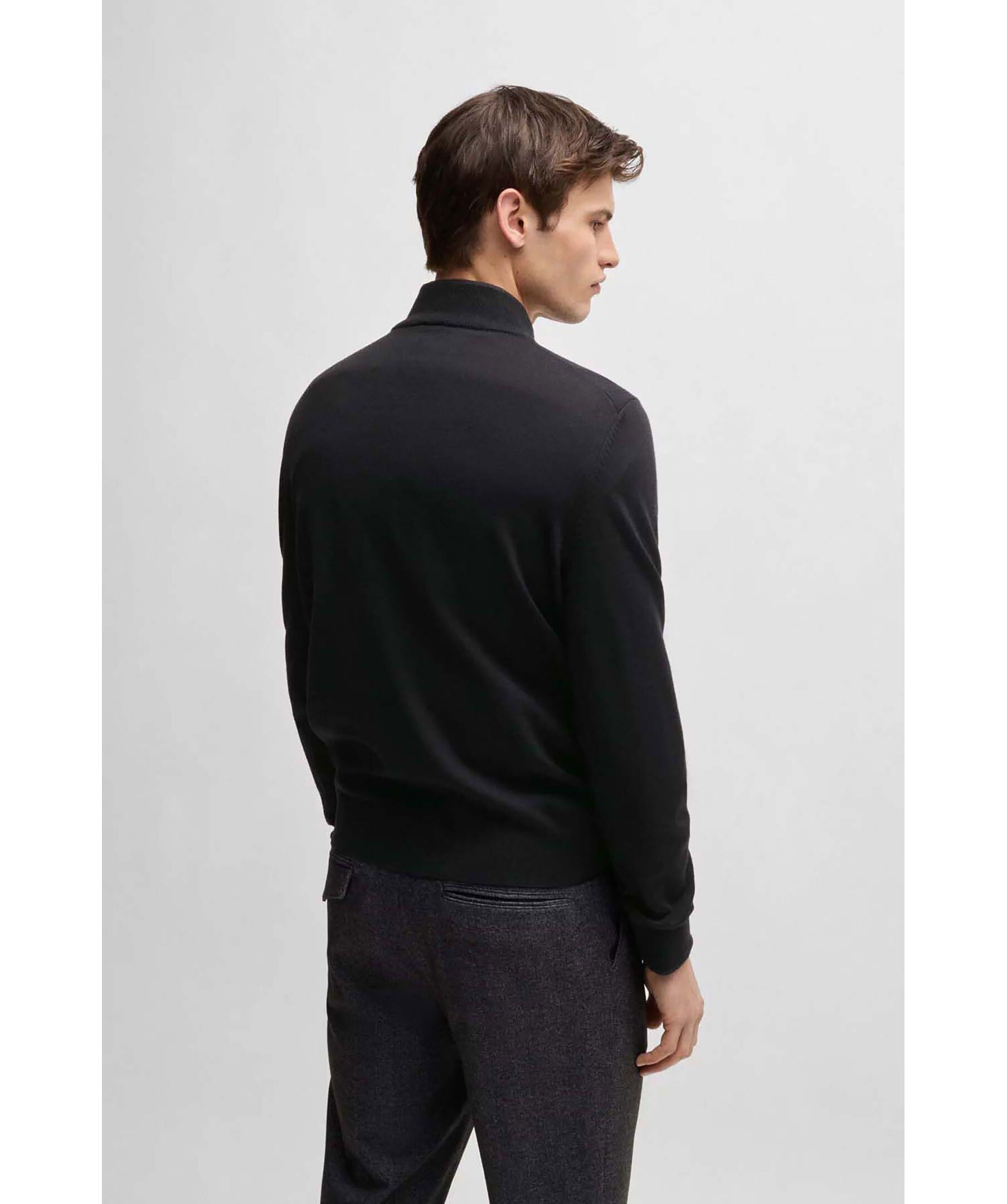 Svart half-zip från Boss Black. Tröjan har ribbad krage, ärm- och tröjslut. Tillverkad av 100% ull.