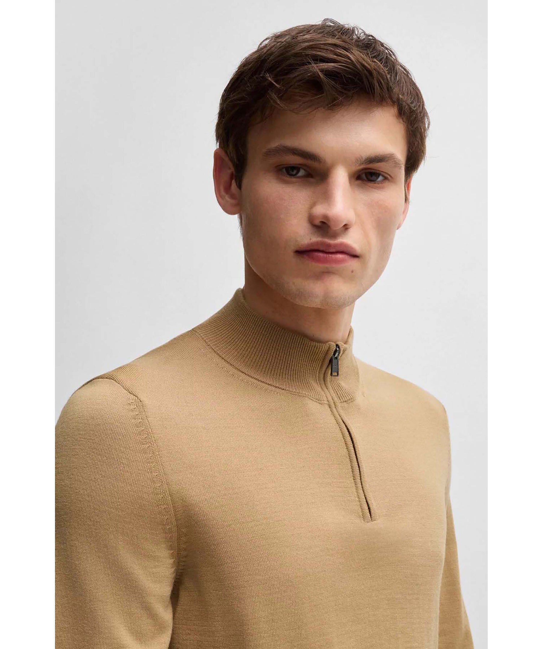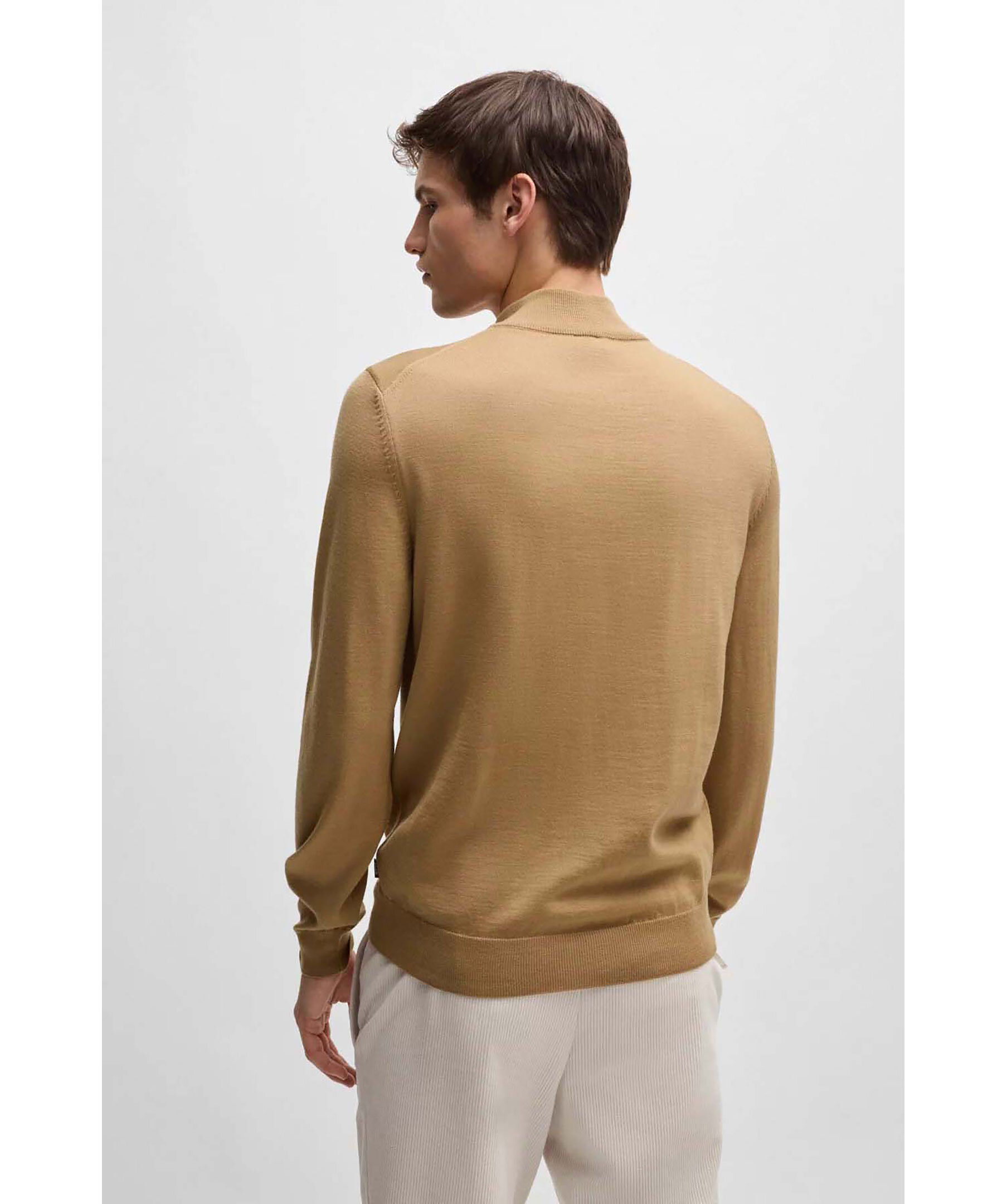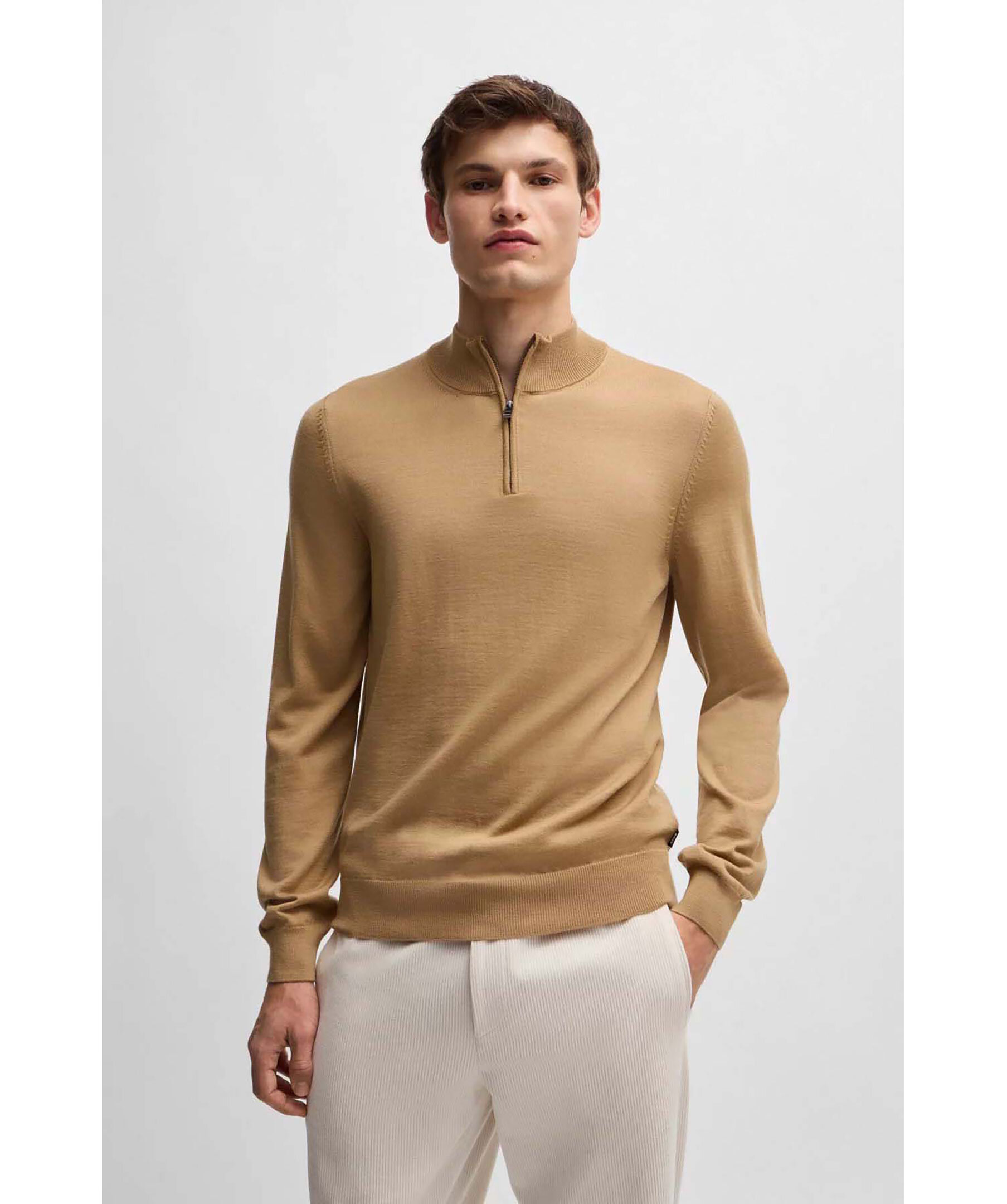 Beige half-zip från Boss Black. Tröjan har ribbad krage, ärm- och tröjslut. Tillverkad av 100% ull.