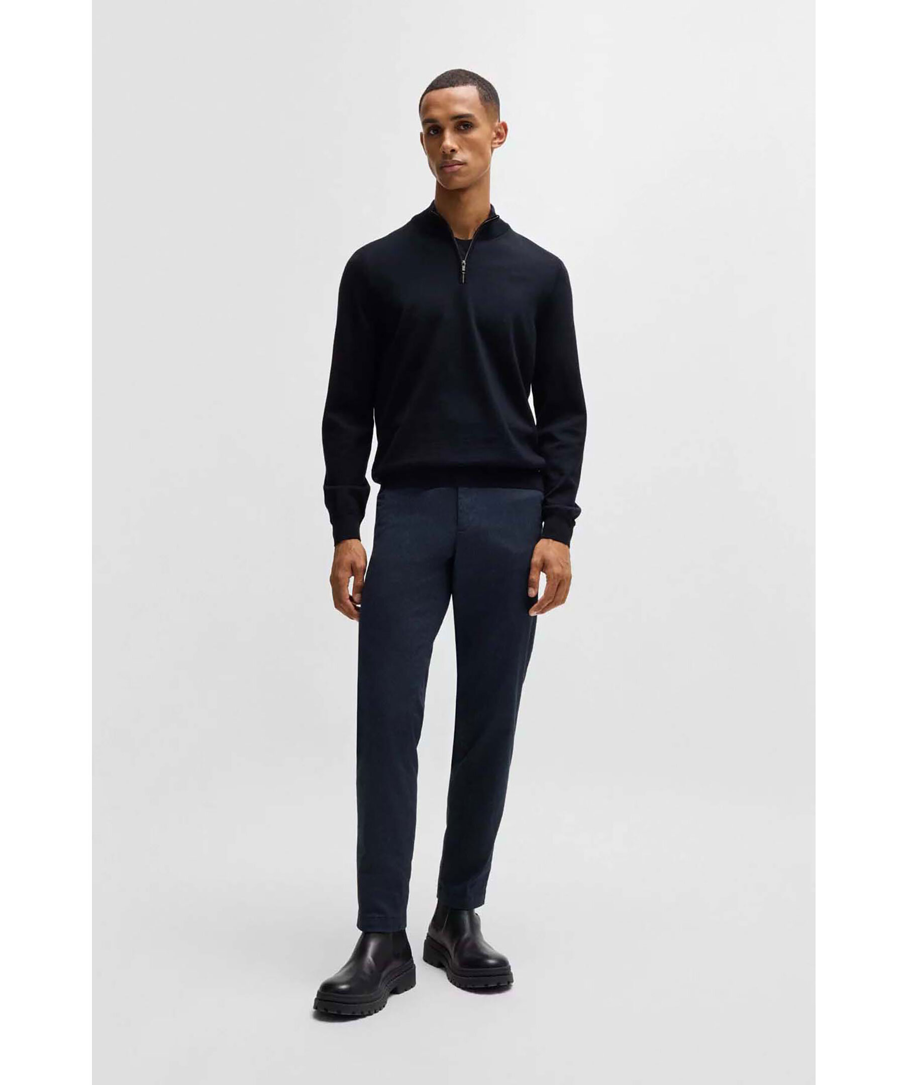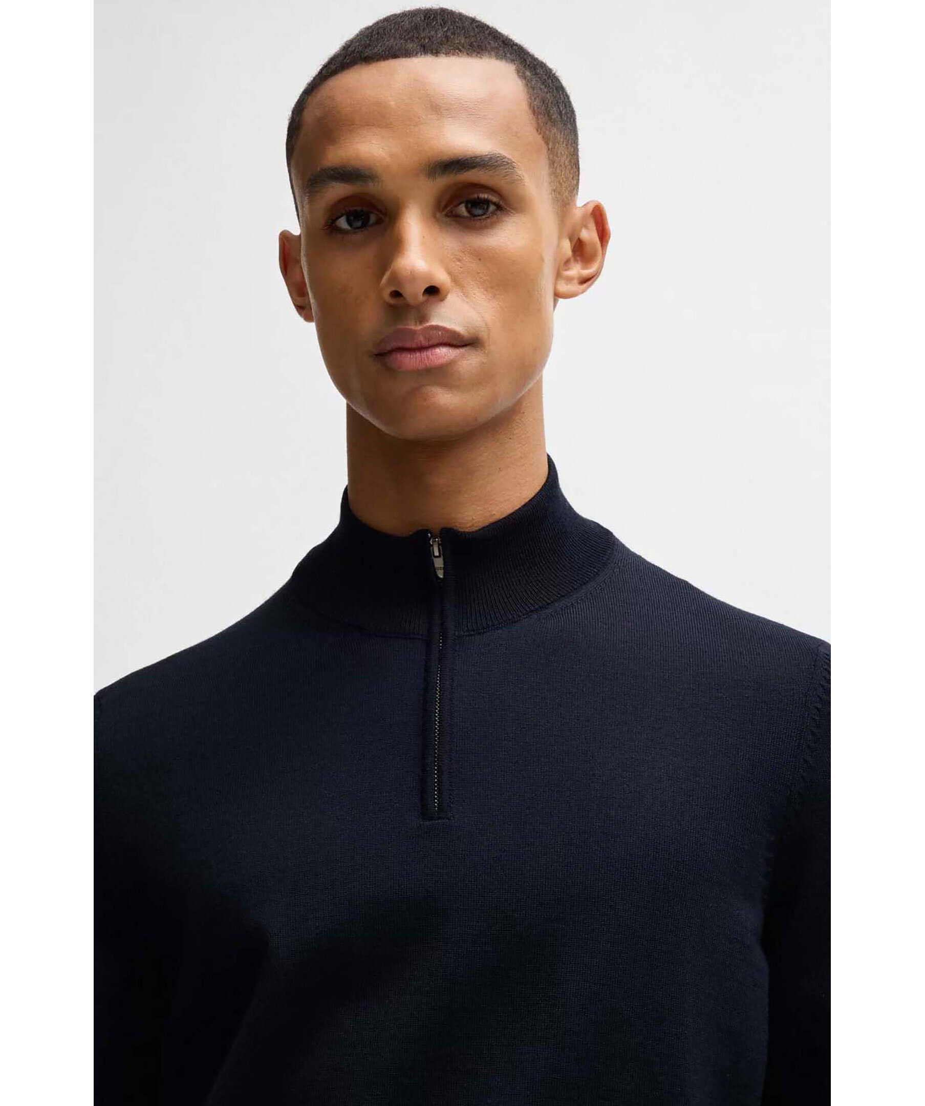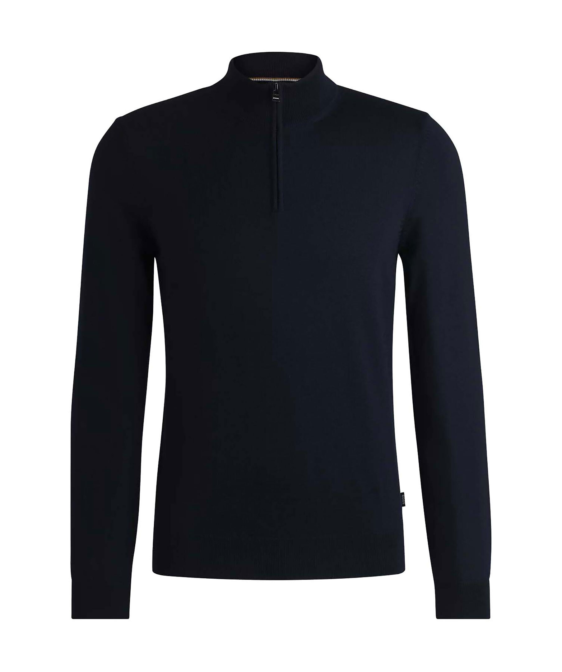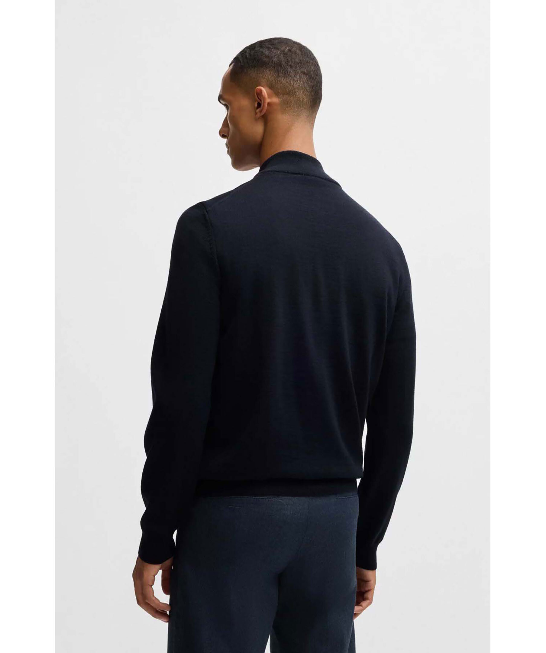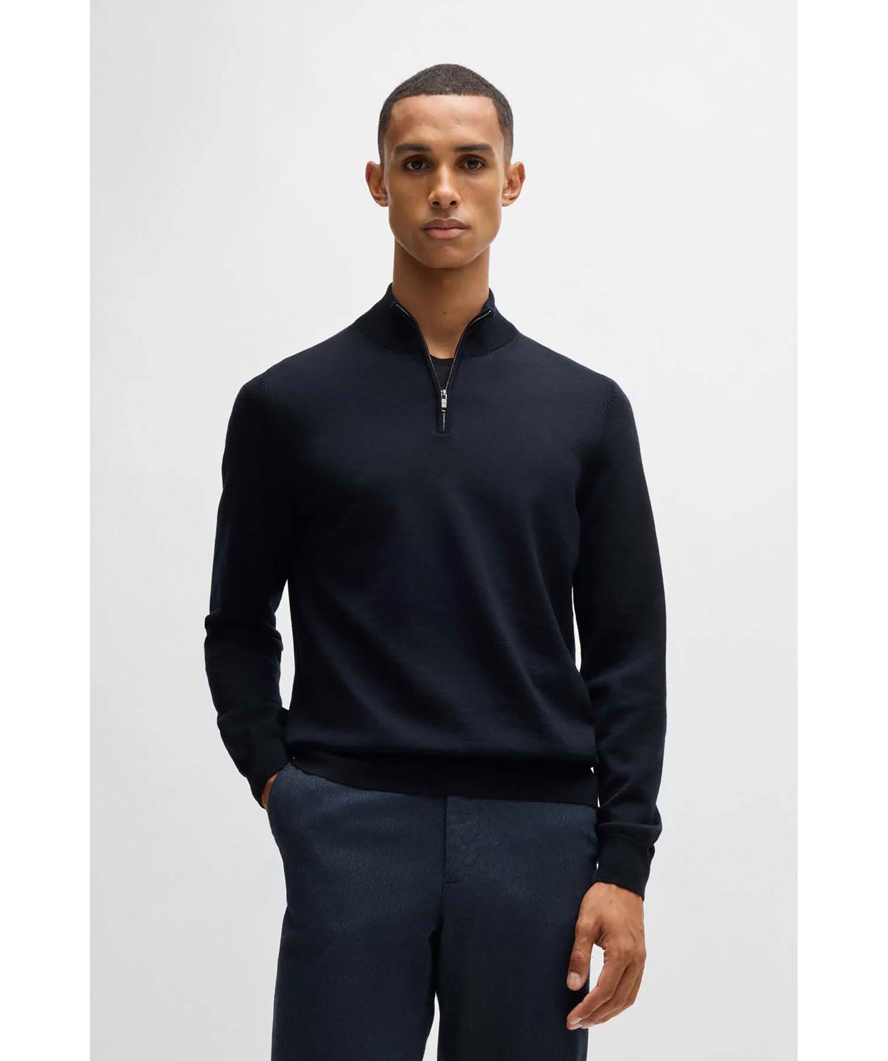 Mörkblå half-zip från Boss Black. Tröjan har ribbad krage, ärm- och tröjslut. Tillverkad av 100% ull.