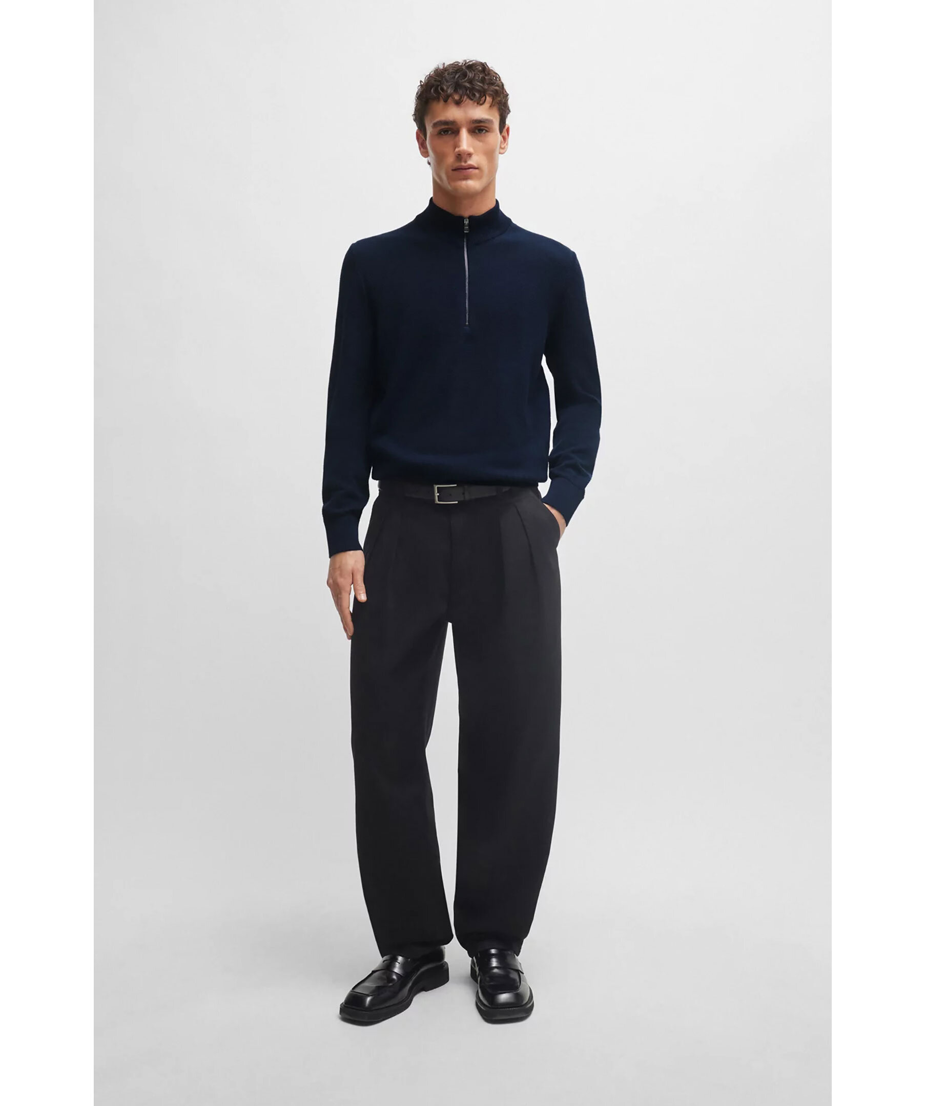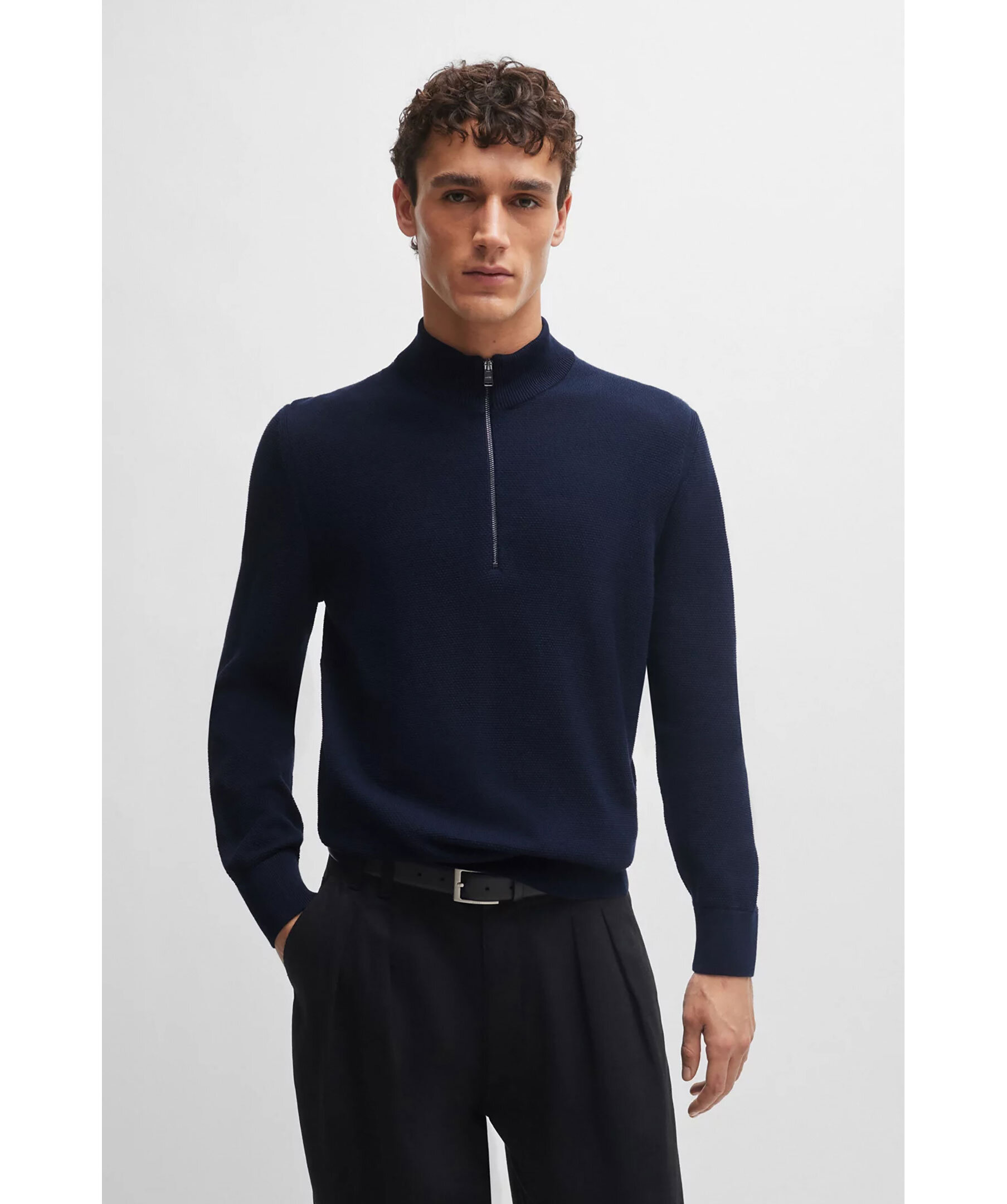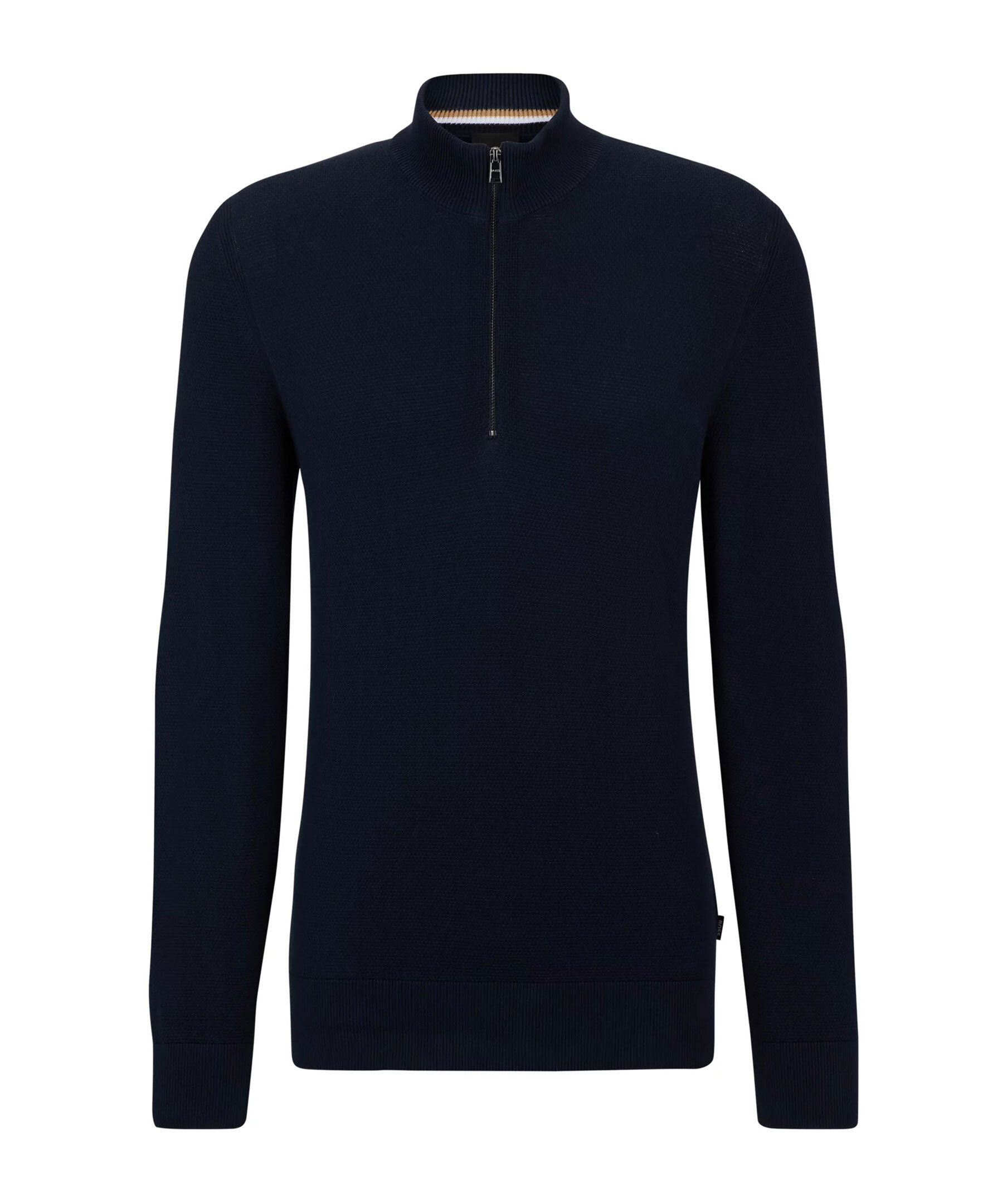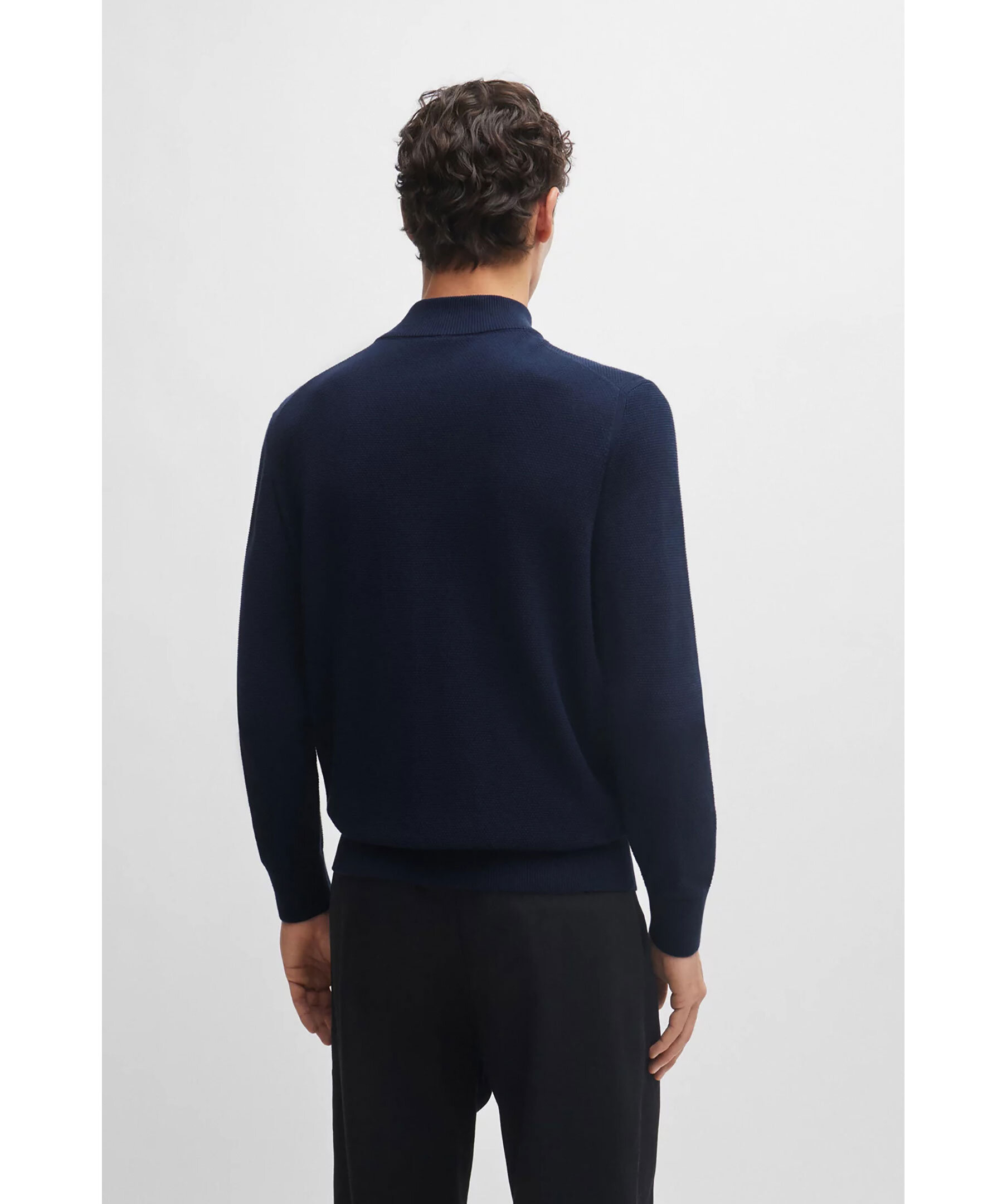 Marinblå stickad tröja från BOSS Black. Tröjan har en stickad mikrostruktur och blixtlåsförsedd halsringning med deras färger i innerkragen. Ribbade manschetter. Det här plagget är tillverkat av ekologisk bomull. Normal passform.