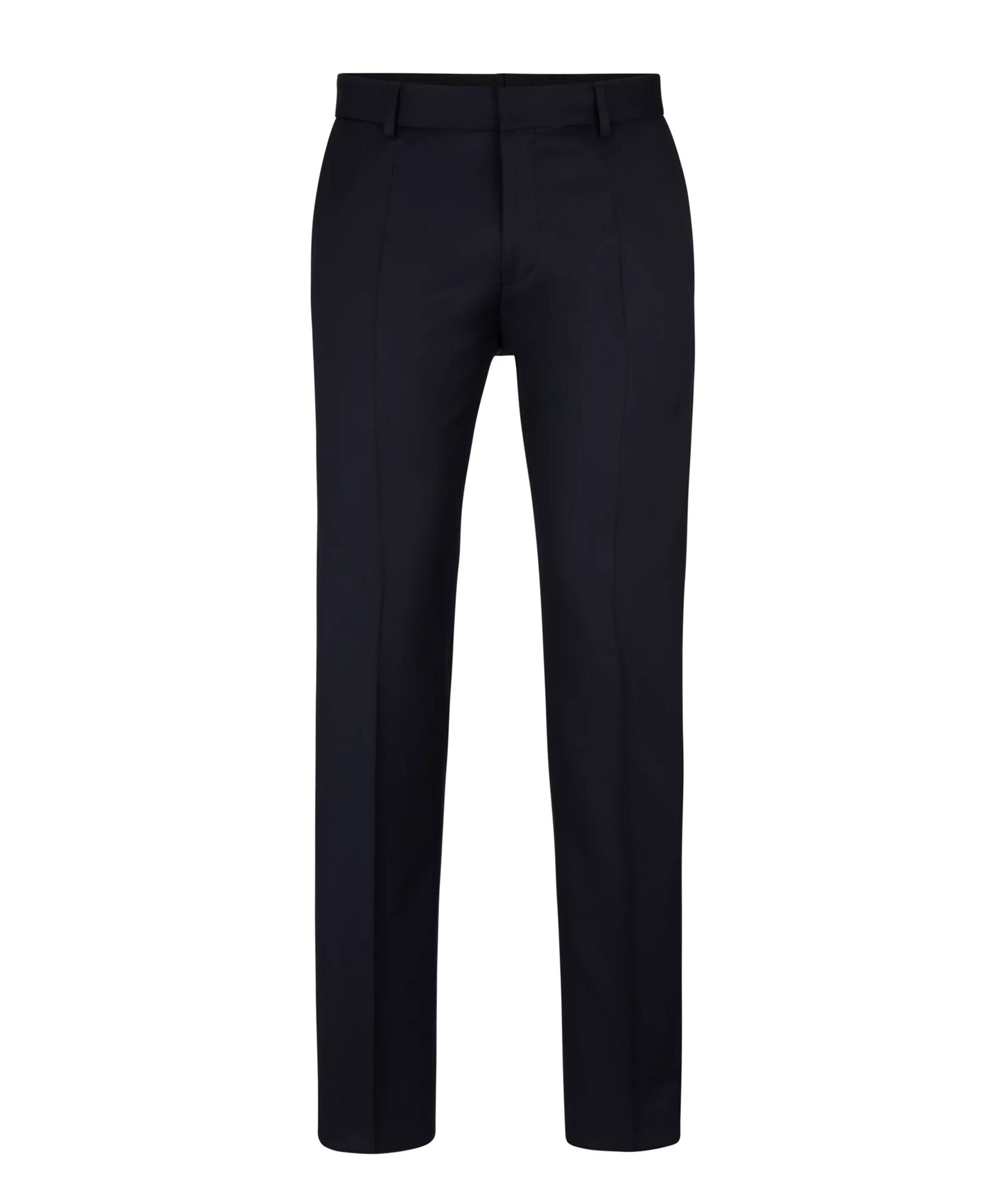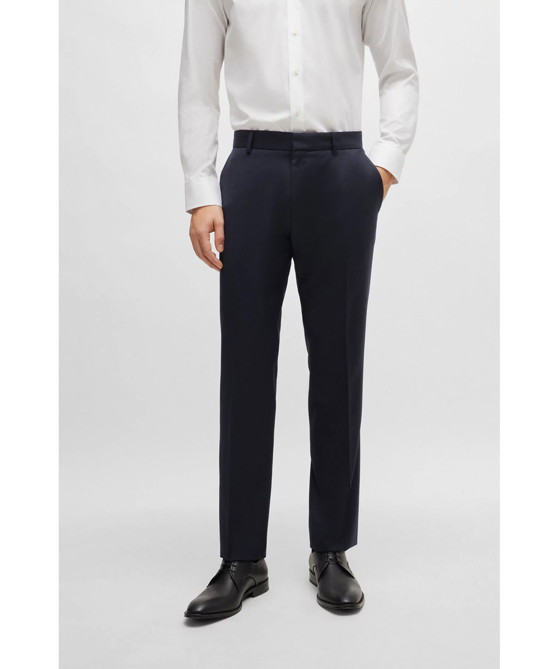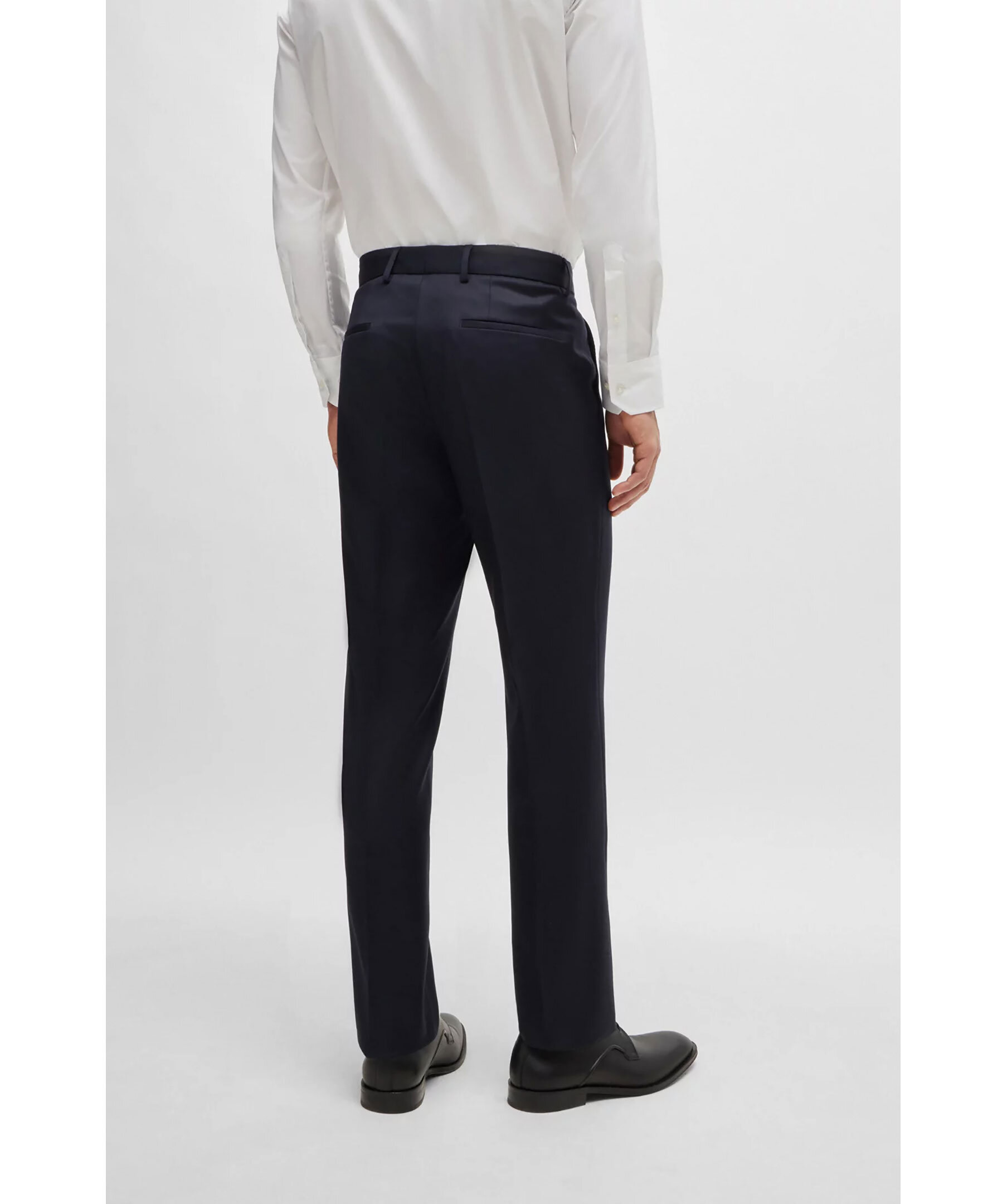 Mörkblå kostymbyxor från BOSS Black. Stängs med hake och dragkedja till gylf, hällor för skärp. Två fickor framtill, två bakfickor. Pressveck framtill och baktill. Tillverkad i 100% ull.