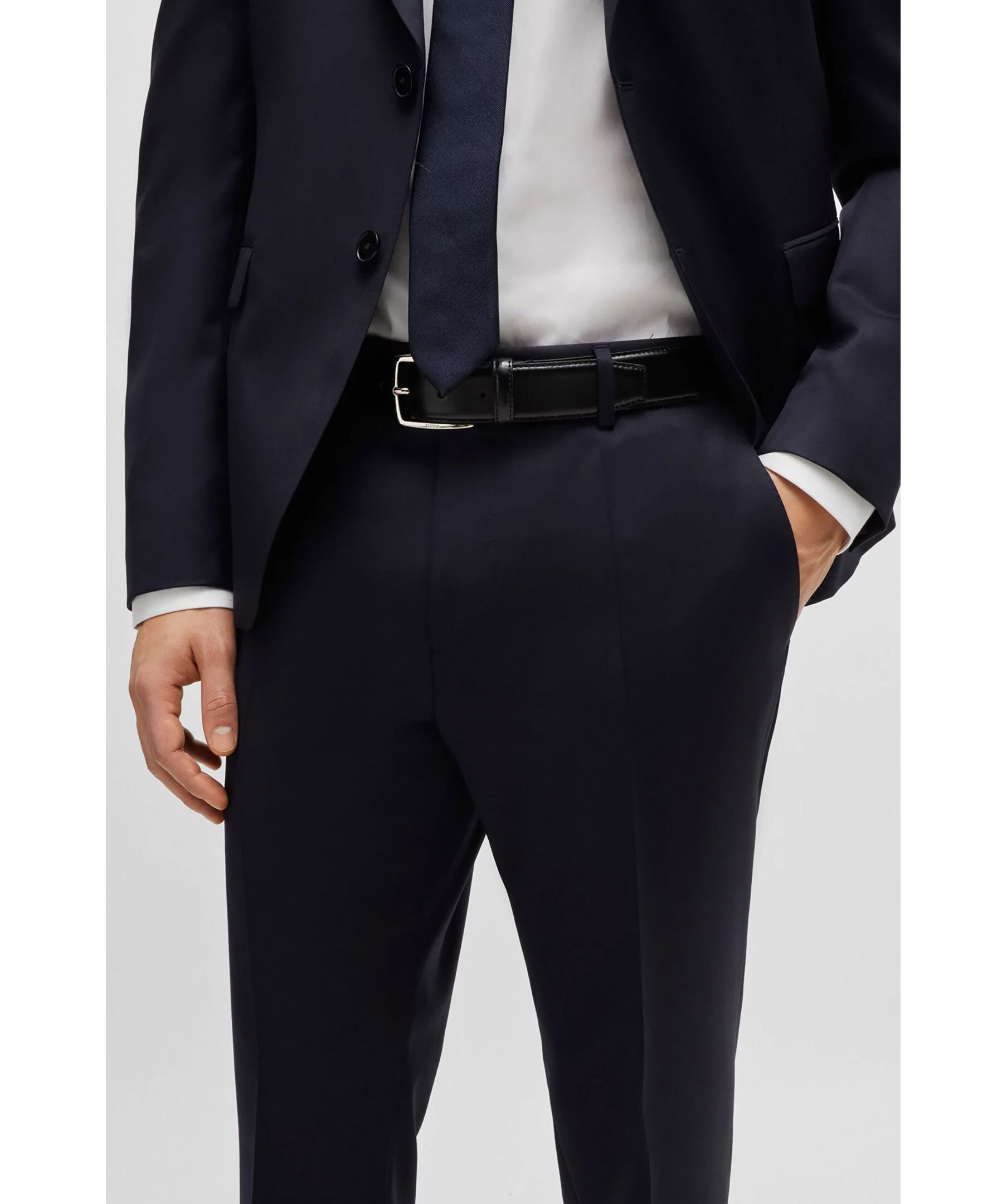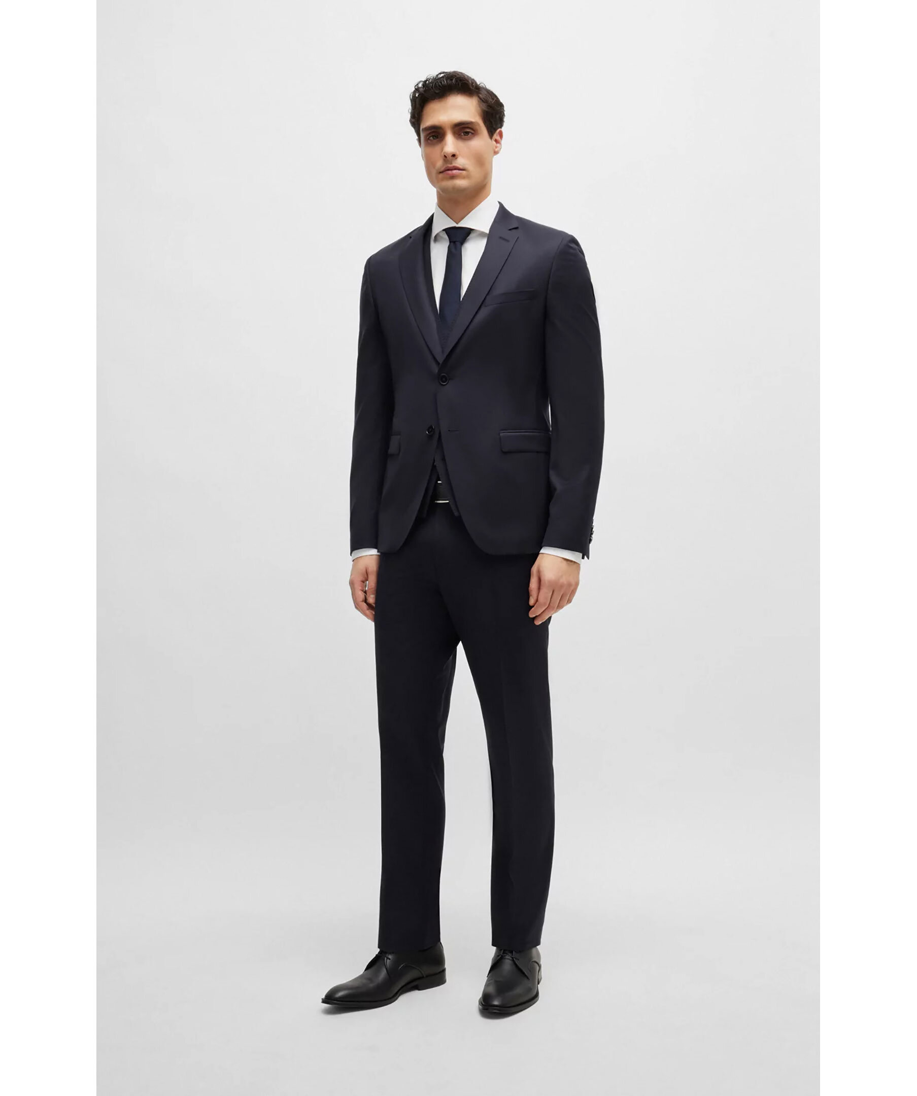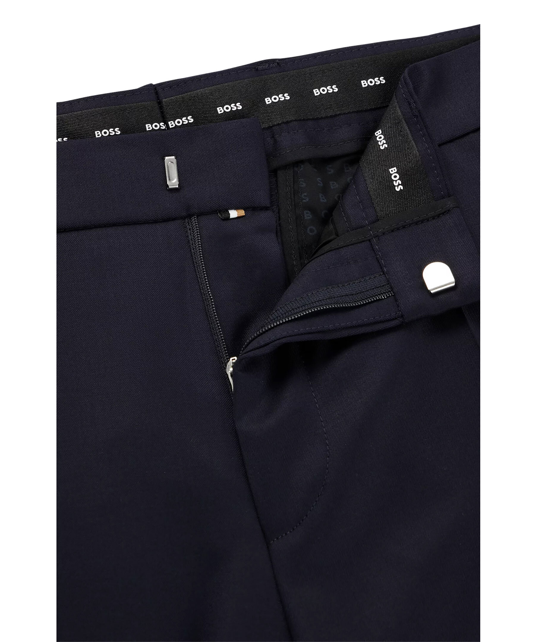 Mörkblå kostymbyxor från BOSS Black. Stängs med hake och dragkedja till gylf, hällor för skärp. Två fickor framtill, två bakfickor. Pressveck framtill och baktill. Tillverkad i 100% ull.