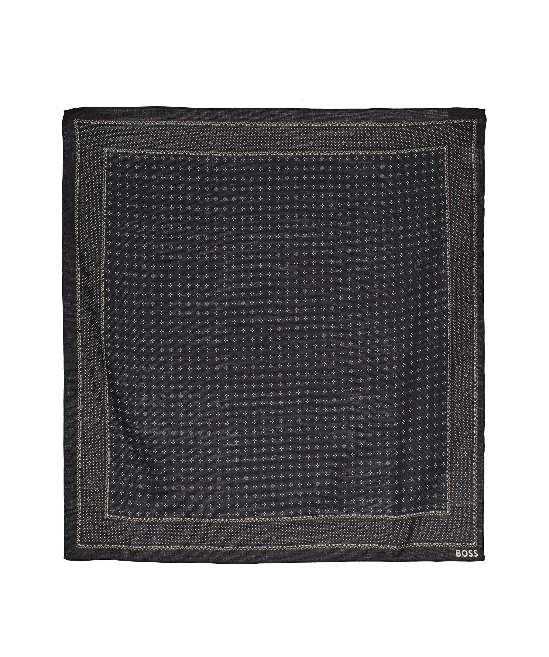 Mörk, multifärgad och mönstrad bandana från BOSS Black. Liten logotyp i nederkant. Tillverkad i en ull- och silkesblandning. Mått: 60 x 60cm.