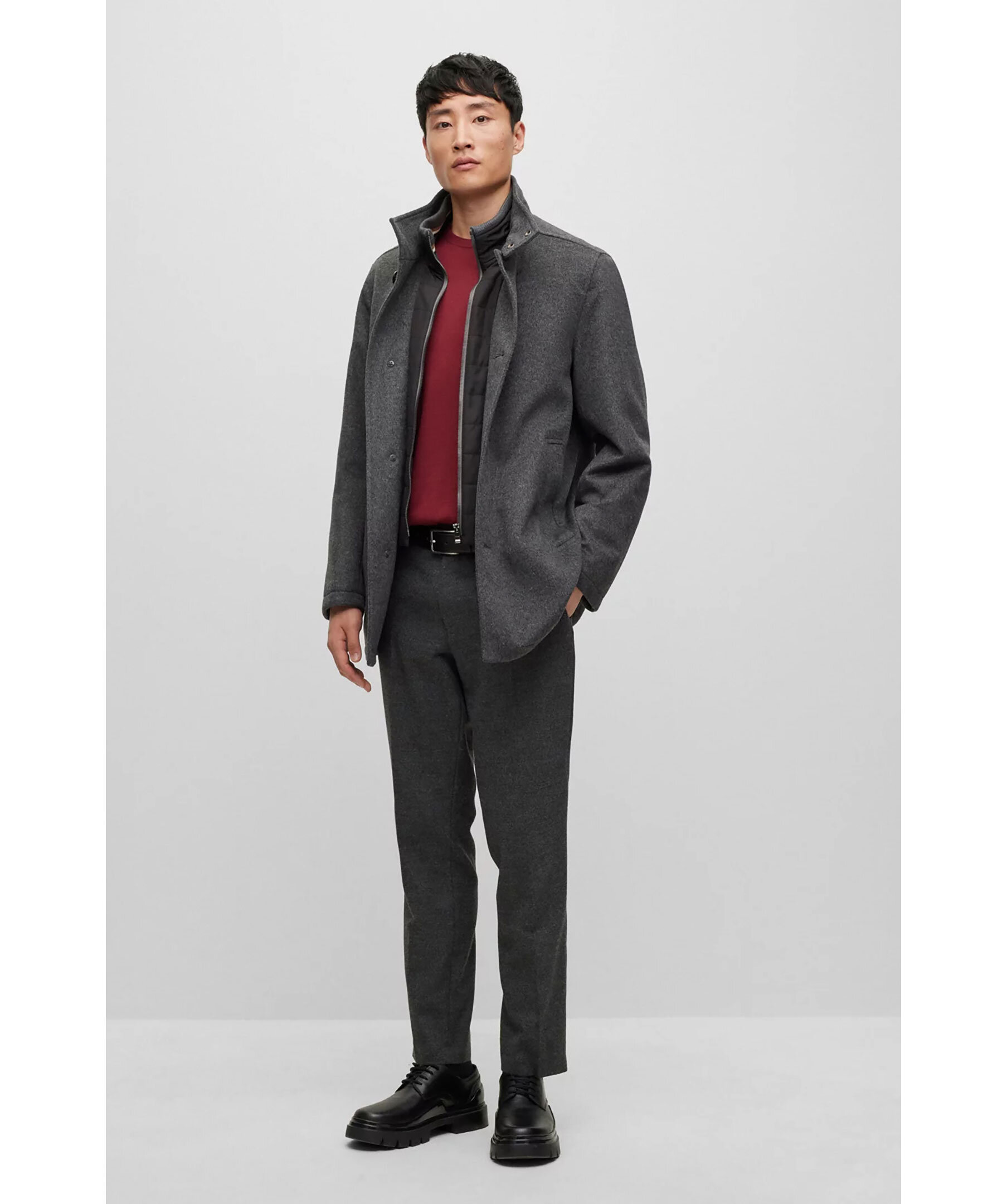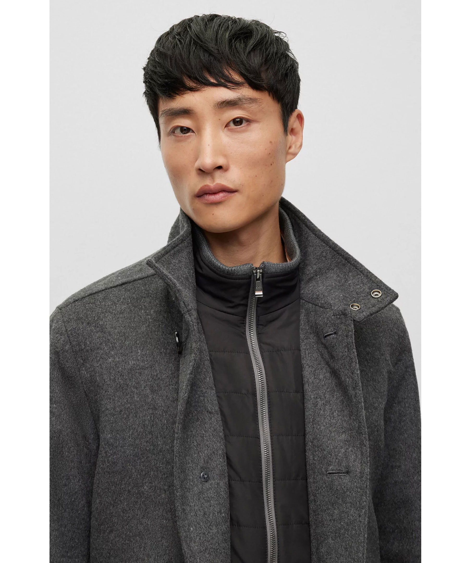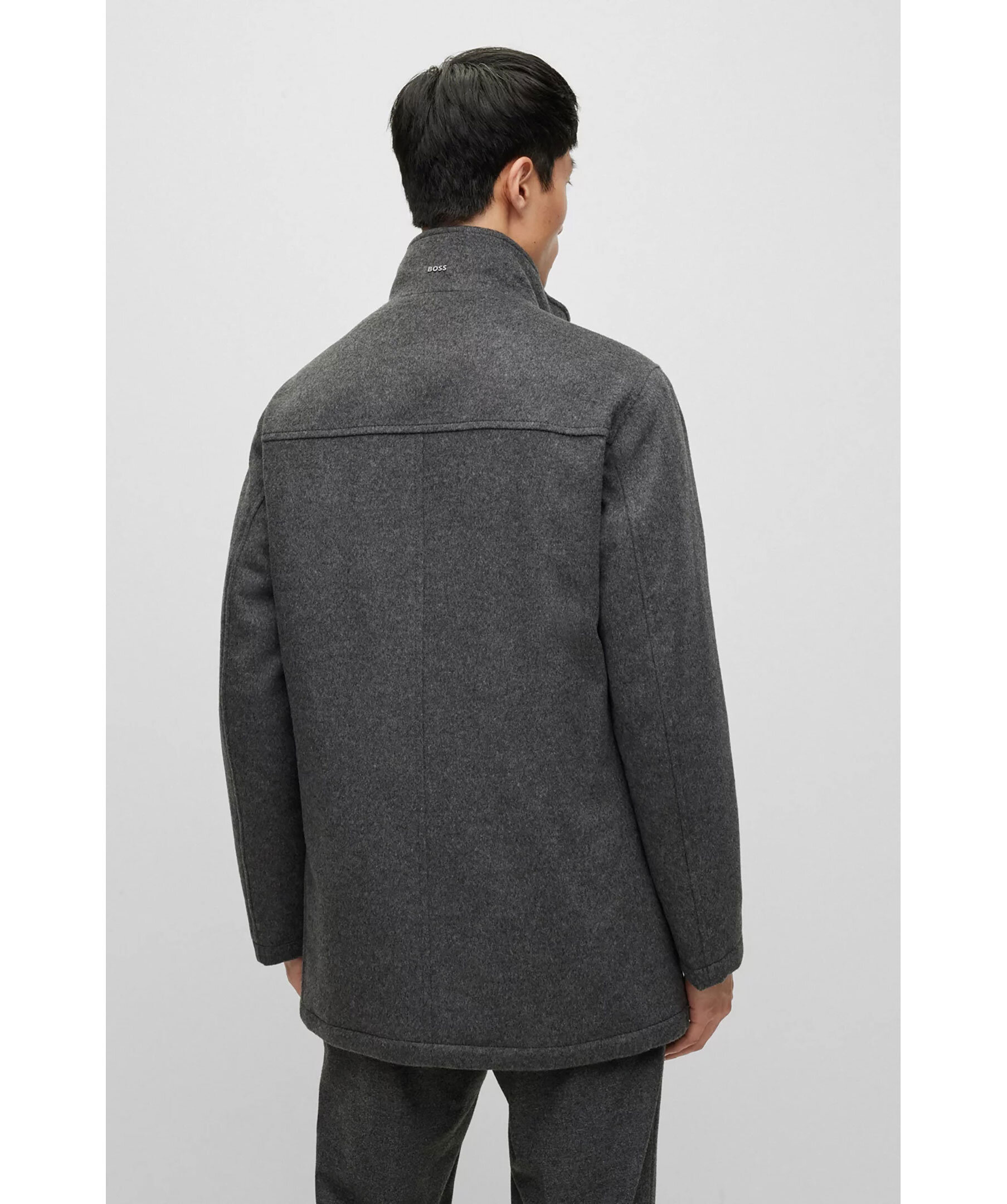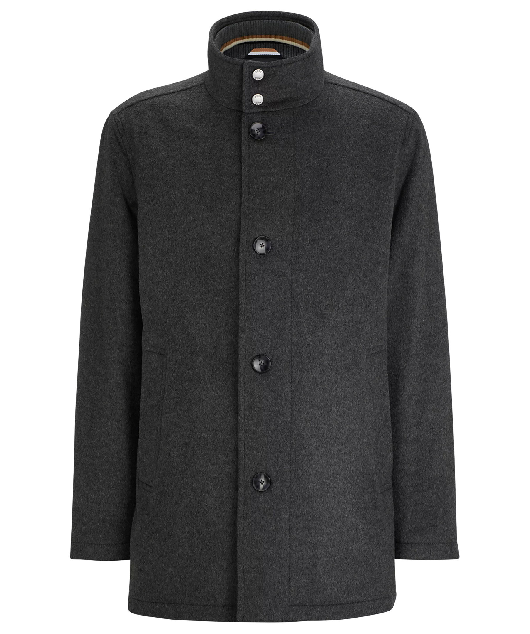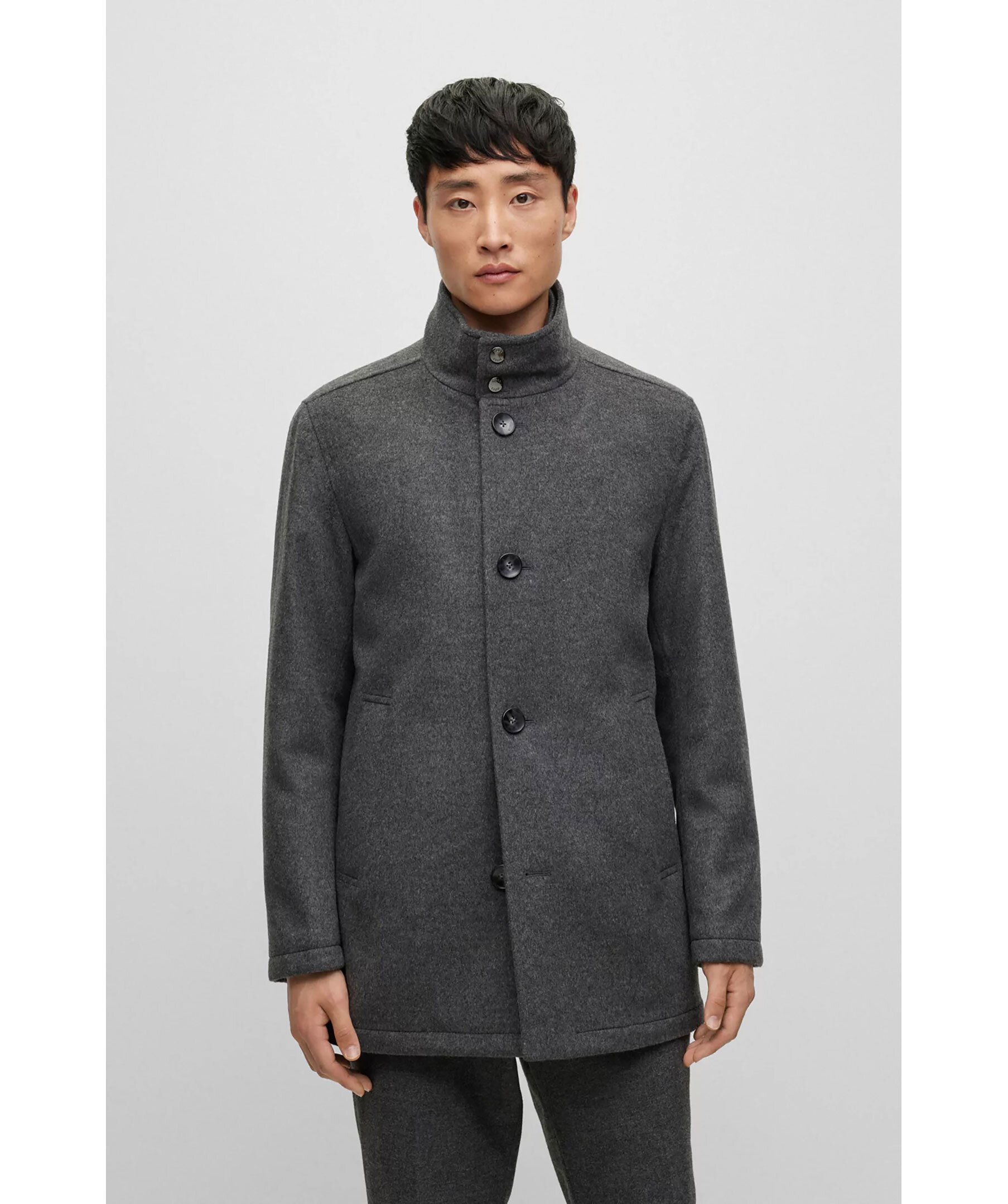Grå rock i en blandning av ull och kashmir från BOSS Black. Avslappnad passform och har en inbyggd fodrad jacka. Hög krage, två framfickor och två innerfickor. Stängs med knappar framtill. Modellen har storlek 48 och är 189 cm lång med en, 89 cm byst, 78 cm midja och 92 cm höft.